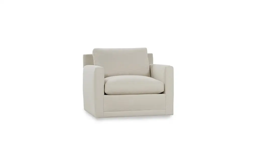 Clean lines and cozy box cushions make the Weybridge swivel chair an instant classic. A swivel base lends a playful, functional touch to the transitional silhouette. Soft and supportive cushioning offers plush, cloud-like comfort, with a foam core surrounded by a blend of fiber, down, and feather fill. Whether styled on its own or as a pair, this inviting chair is an easy addition to any seating area. Choose from a variety of upholstery options, including linen, velvet, and performance fabrics.