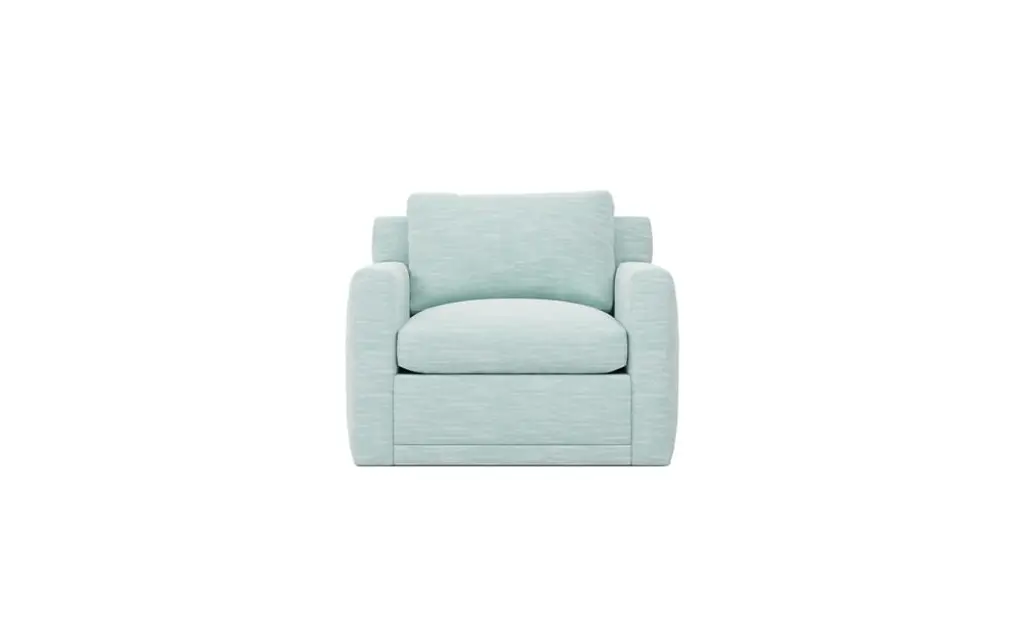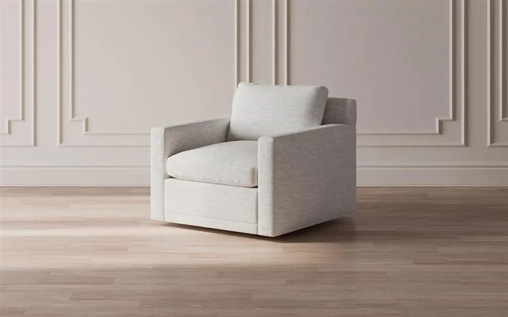 Clean lines and cozy box cushions make the Weybridge swivel chair an instant classic. A swivel base lends a playful, functional touch to the transitional silhouette. Soft and supportive cushioning offers plush, cloud-like comfort, with a foam core surrounded by a blend of fiber, down, and feather fill. Whether styled on its own or as a pair, this inviting chair is an easy addition to any seating area. Choose from a variety of upholstery options, including linen, velvet, and performance fabrics.