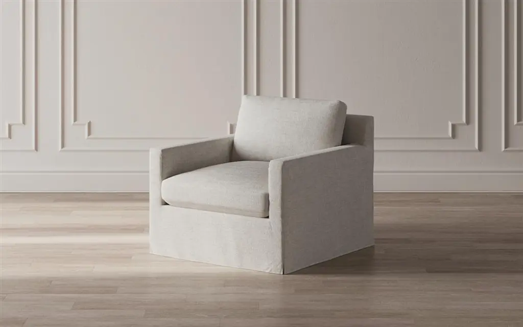 Casual and timeless with modern appeal, the Weybridge slipcovered swivel chair blends seamlessly with any stylish living space. A plush seat is nestled within the clean-lined frame, while a breezy slipcover gently touches the ground. Soft and supportive cushioning offers plush, cloud-like comfort, with a foam core surrounded by a blend of fiber, down, and feather fill. Choose from washable slipcover fabrics in a variety of serene hues.