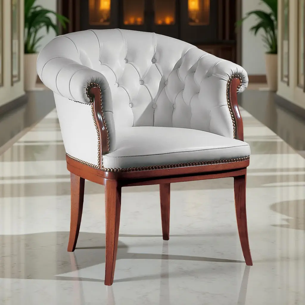 Luxury Classic style swivel armchair with beech wood structure. It is padded with webbing and superior quality foam. The upholstery particularly enhances the luxuriousness of this model and underlines the enveloping design: the leather made with a tanned bull hide reflects a reserved elegance; the strong two-tone effect is the hallmark of the understated distinctiveness of this timeless leather. Other leather colours are available, please contact our Concierge.