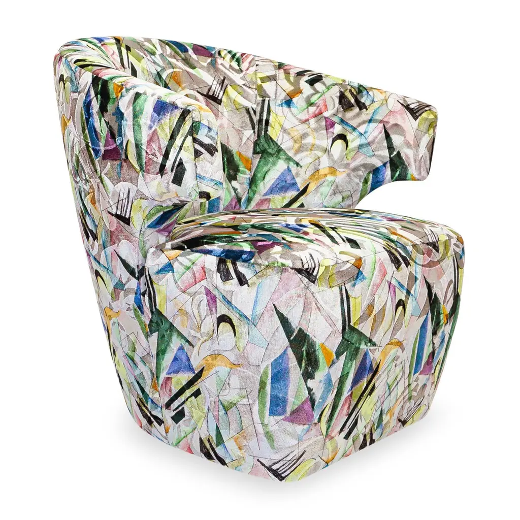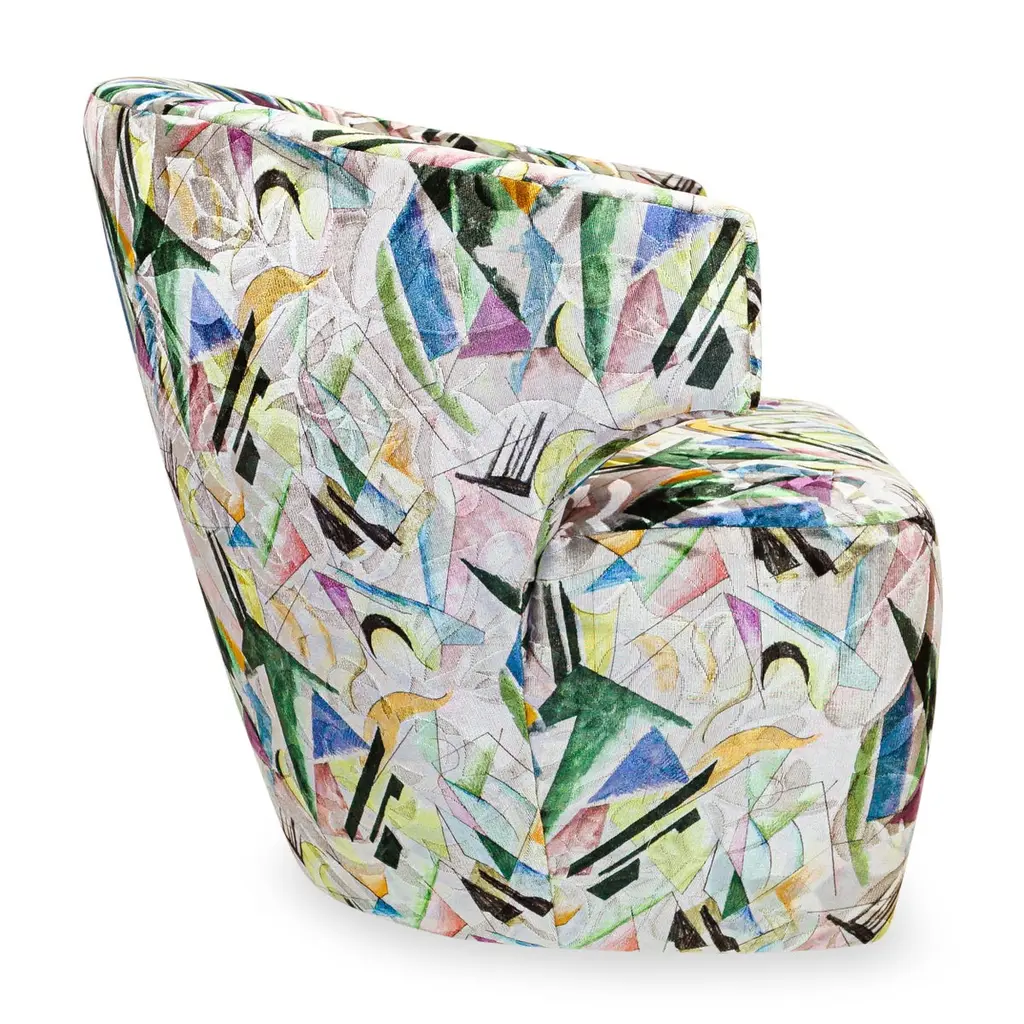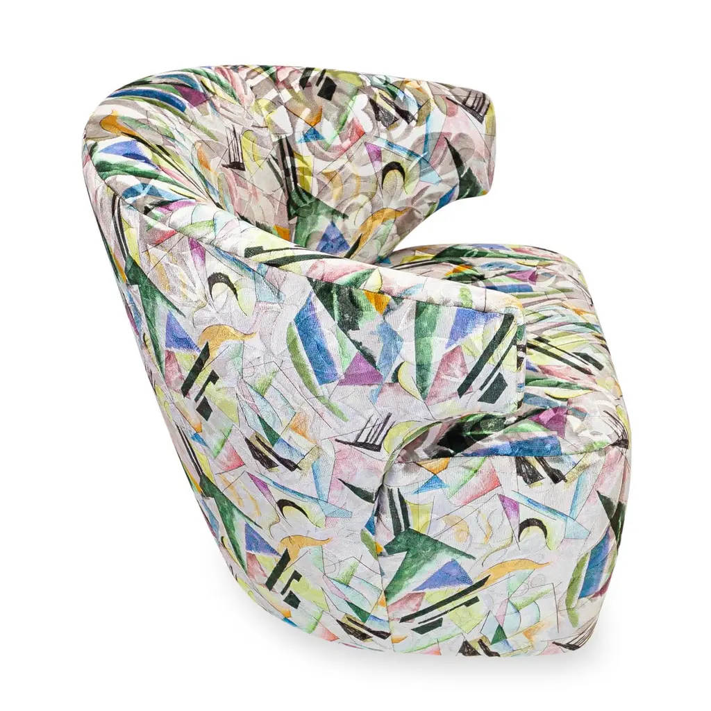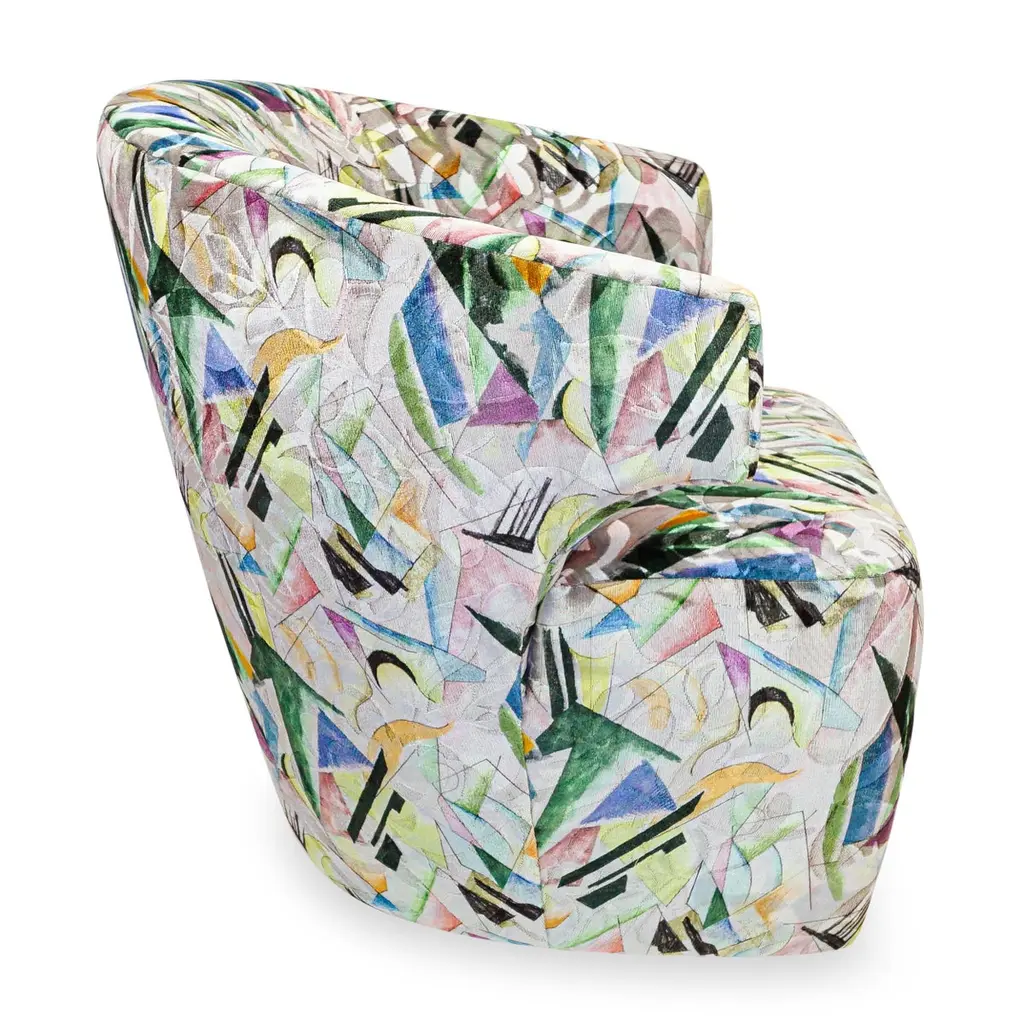 Featuring a popping bauhaus inspired cut and printed velvet, this winged swivel chair has a small stature but can comfortably seat taller and larger adults. The seat is firm and supportive and the slope of the back is "just right". The swivel is 360 degrees. Send your own fabric or ask about our library of over 10,000 samples.Measurements:Overall: 31.5”W x 22”D x 30”HInside: 23”W x 17.5”D x 17.5”HSeat height: 17"Price as shown: $5,600 eachCOM price: $2,400 eachCustomization may change price.How We Work:Made to order by Connecticut-based furniture design and manufacturing company The Tailored Home. Submit your customization desires by 1stdibs messenger for a quote. After orders are placed our workshop manager creates a visual work order for your approval for quality assurance.Customization Options:Dimensions can be customized. Ask for details.The fabric shown may come in more colors. We also carry thousands of other materials and can send you samples and fabric pricing upon request. We accept your fabric for a COM fee of 5% of the cost of the piece. Welting, piping, tape or trim can be added. Different species available for pieces with exposed wood and can be painted & lacquered in any Benjamin Moore color (for additional charge) or stained in one of our stain options. Custom color matches cost $75 per sample.We accept inspiration photos of pieces you like.2021 - Made to OrderThis piece can be made as is or custom made with customer’s choice of materials and size adjustments.9-10 Weeks.