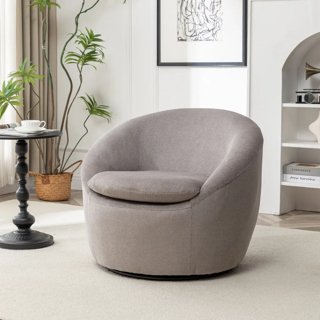 360° SWIVEL: This armchair, featuring a full swivel range, offers the flexibility to adjust your seating position as needed. Designed to provide optimal comfort and support for extended use, it serves as a unique and stylish seating option. BUILT TO LAST: Constructed of premium fabric with meticulous attention to detail, this armchair features a round metal base for durability and stability. Its plush cushion filled with high-density foam provides superior comfort. The chair seamlessly blends functionality, timeless beauty and comfort. MULTIPLE SCENES: This exquisite armchair, adorned with textured fabric, elevates any room. Perfect for living rooms, bedrooms, home theaters, studios, leisure areas, offices, and study rooms, it offers a comfortable spot for reading, watching TV, or just relaxing. It adapts to your needs, ensuring lasting comfort. SET UP DIMENSIONS: 29.50W x 31D x 25.50H; Seat: 19W x 22D x 17.50H inch; Seat back: 16W x 12.60H. INSTALLATION: Fully assembled for your convenience. Kindly be aware that the color of the actual item may slightly differ from the photo due to variations in monitor display.