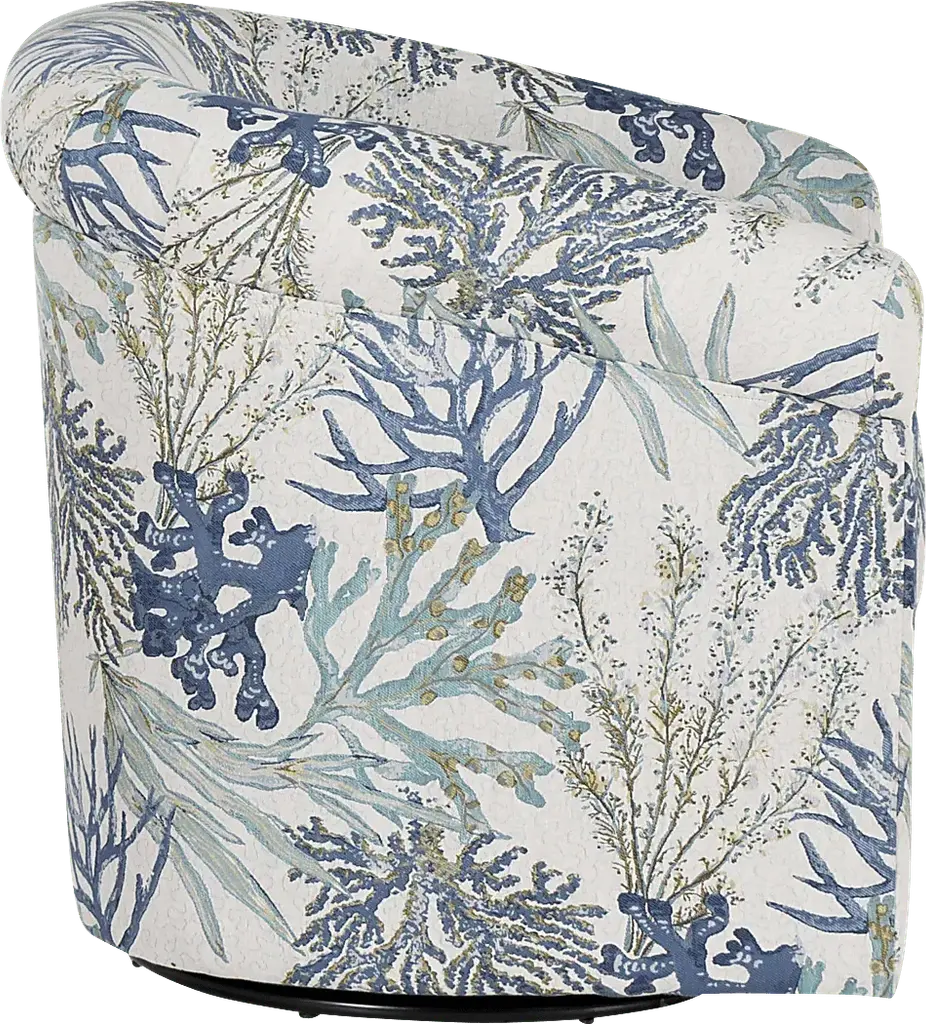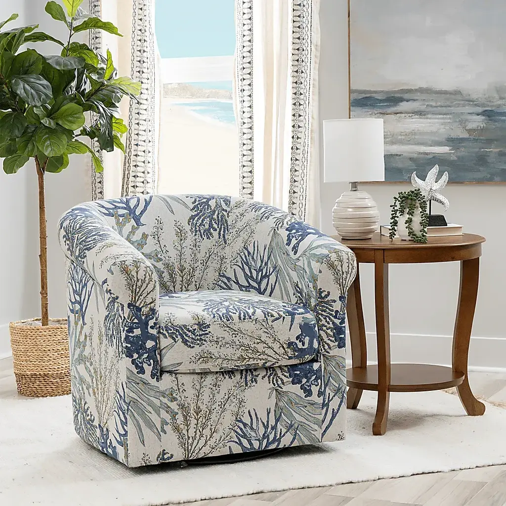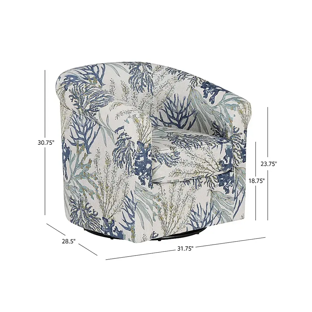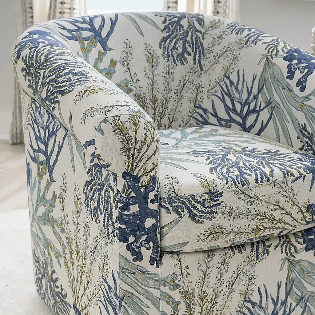 For the days you can't make it to the beach but could still use a bit of nautical charm, the Witgate chair got you covered. An engaging pattern of coral in shades of ocean blue create a welcoming coastal aesthetic that pops amongst neutral decor. The arched back, roll arms, and generously padded seat are supported by a sturdy wooden frame that swivels 360 degrees for maximum convenience. This piece arrives fully assembled, ready to make waves in your living room, sunroom, bedroom, or beach house.