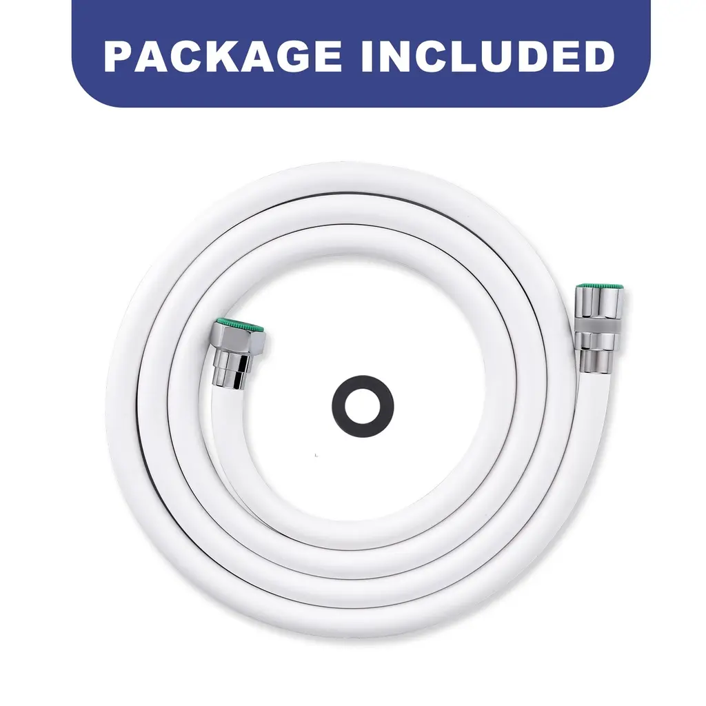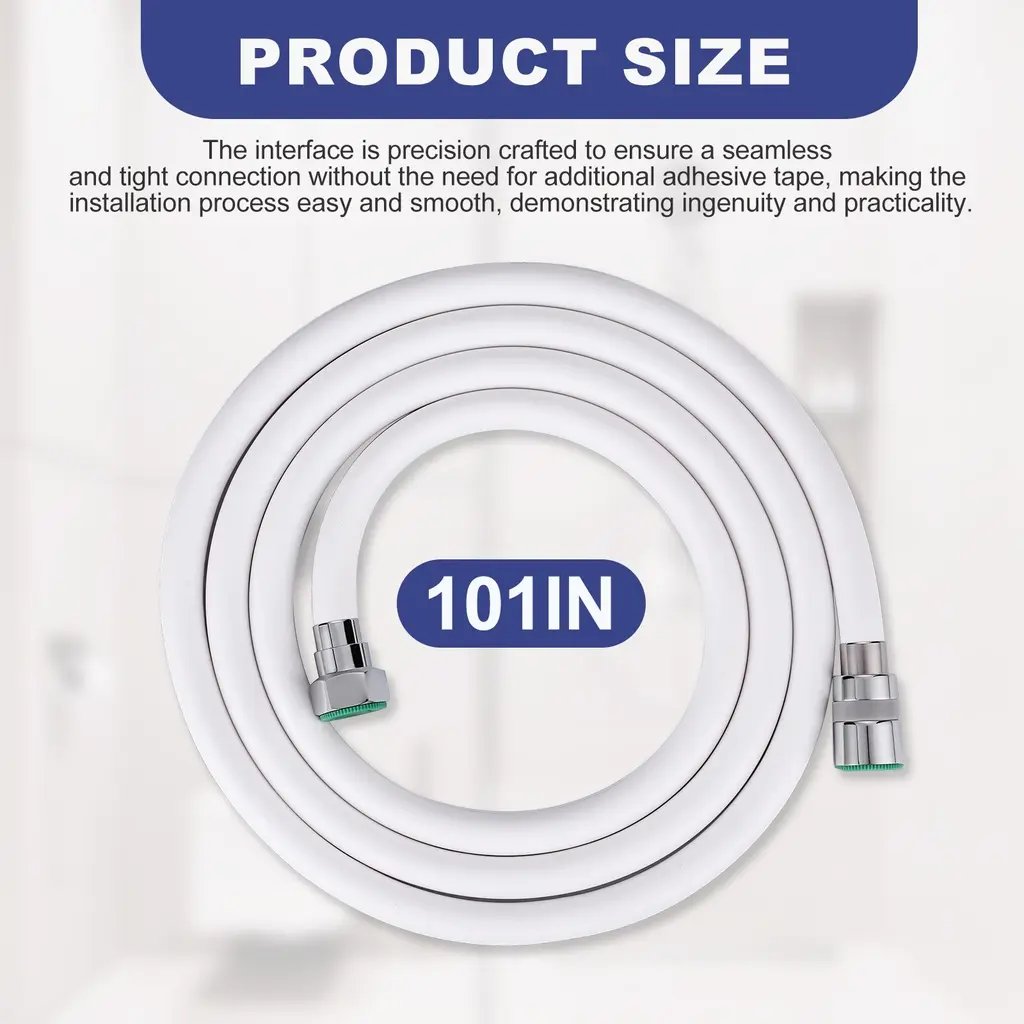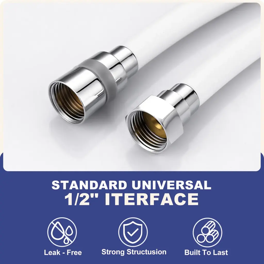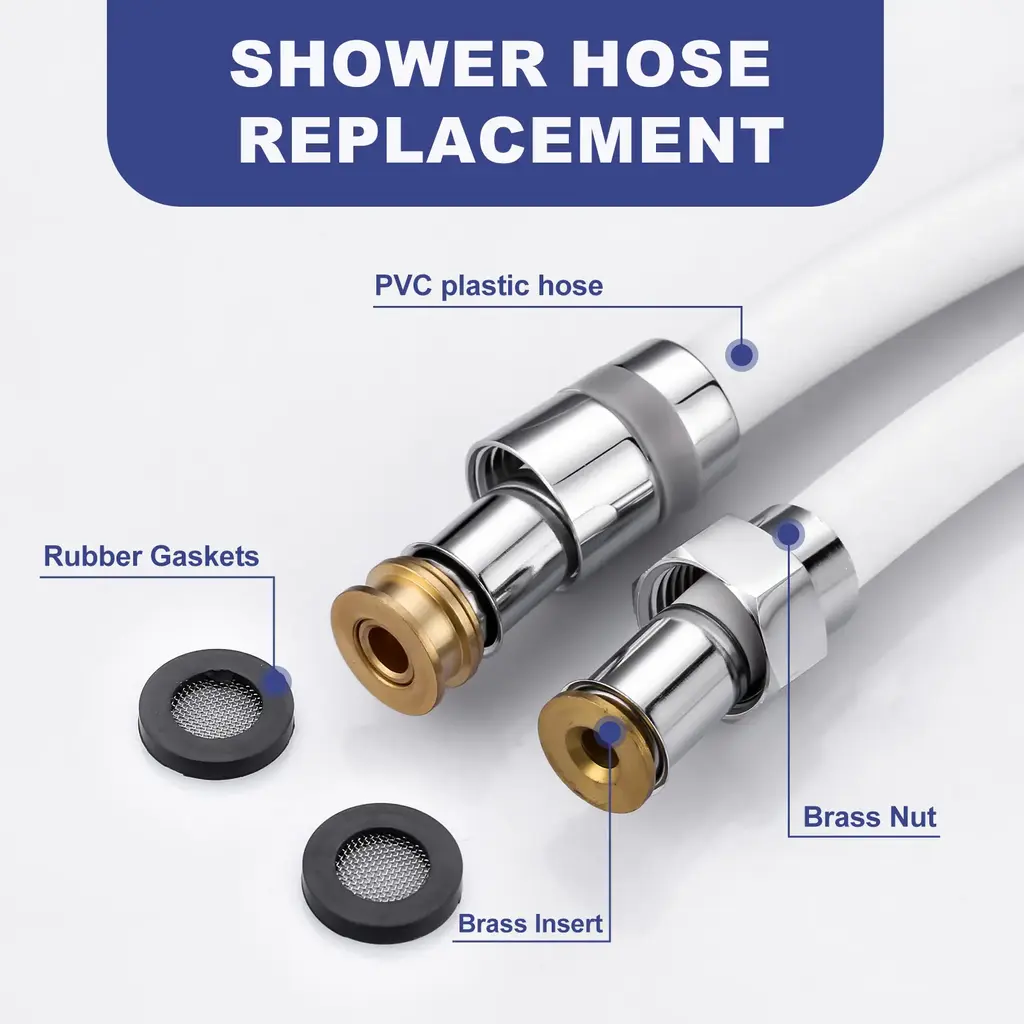 The shower hose is designed with 1/2" thread size connector. Works with most the shower head, tub faucet, and bidet sprayer in the USA.TIPS: Washers Must be Put in Both Ends of the Hose When Install.Your shower head hose is made of quality PVC outer tube, PVC composite inner tube, which is high temperature resistance, explosion-proof, rust-proof, leak-proof, high flexibility and durable.The new 360 degree anti-wrap innovative structural design,has a good connection, can be 360 degree swivel. Keeping your shower hose kink-free.The shower hose replacement is available in 63, 79, 99 inches to choose from. It is not only suitable for bathing, but also for toilet cleaning, refilling fish tanks, cleaning barthroom, flushing potty chairs, pet bathing, etc.Both interface connectors are constructed from copper inserts.Solid copper hose nuts for a reliable leak-free connection.Highlights