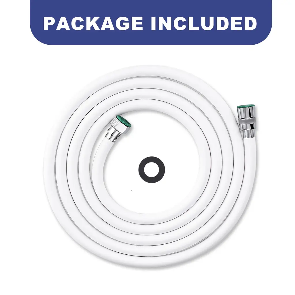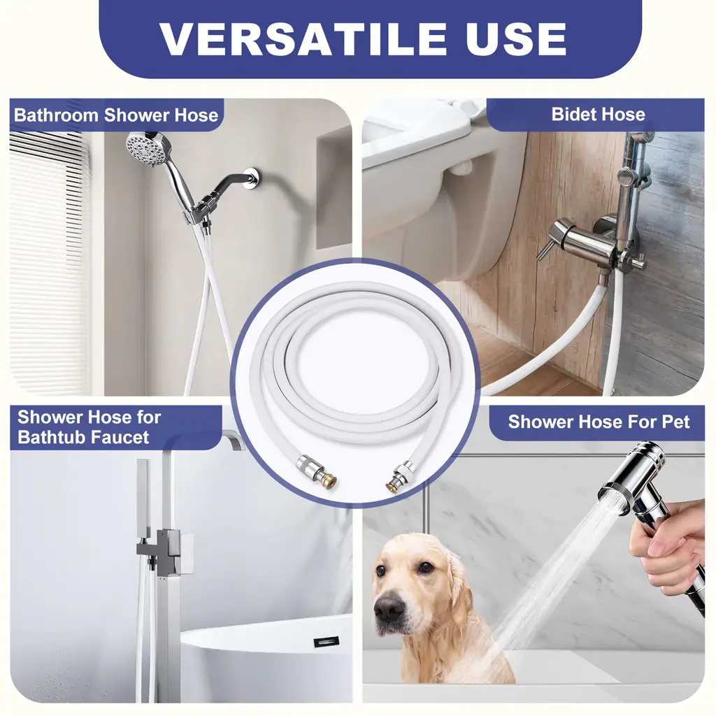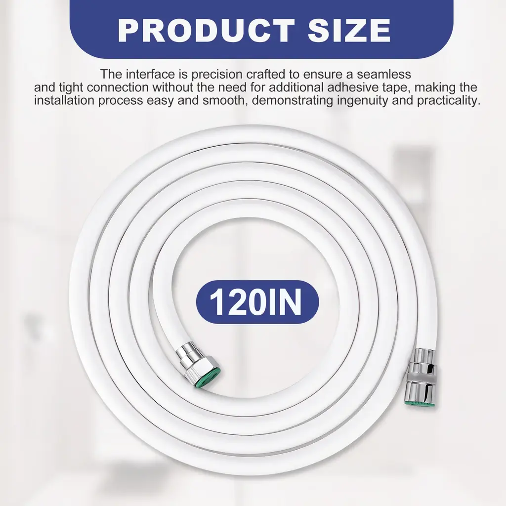 The shower hose is designed with 1/2" thread size connector. Works with most the shower head, tub faucet, and bidet sprayer in the USA.TIPS: Washers Must be Put in Both Ends of the Hose When Install.Your shower head hose is made of quality PVC outer tube, PVC composite inner tube, which is high temperature resistance, explosion-proof, rust-proof, leak-proof, high flexibility and durable.The new 360 degree anti-wrap innovative structural design,has a good connection, can be 360 degree swivel. Keeping your shower hose kink-free.The shower hose replacement is available in 63, 79, 99 inches to choose from. It is not only suitable for bathing, but also for toilet cleaning, refilling fish tanks, cleaning barthroom, flushing potty chairs, pet bathing, etc.Both interface connectors are constructed from copper inserts.Solid copper hose nuts for a reliable leak-free connection.Highlights