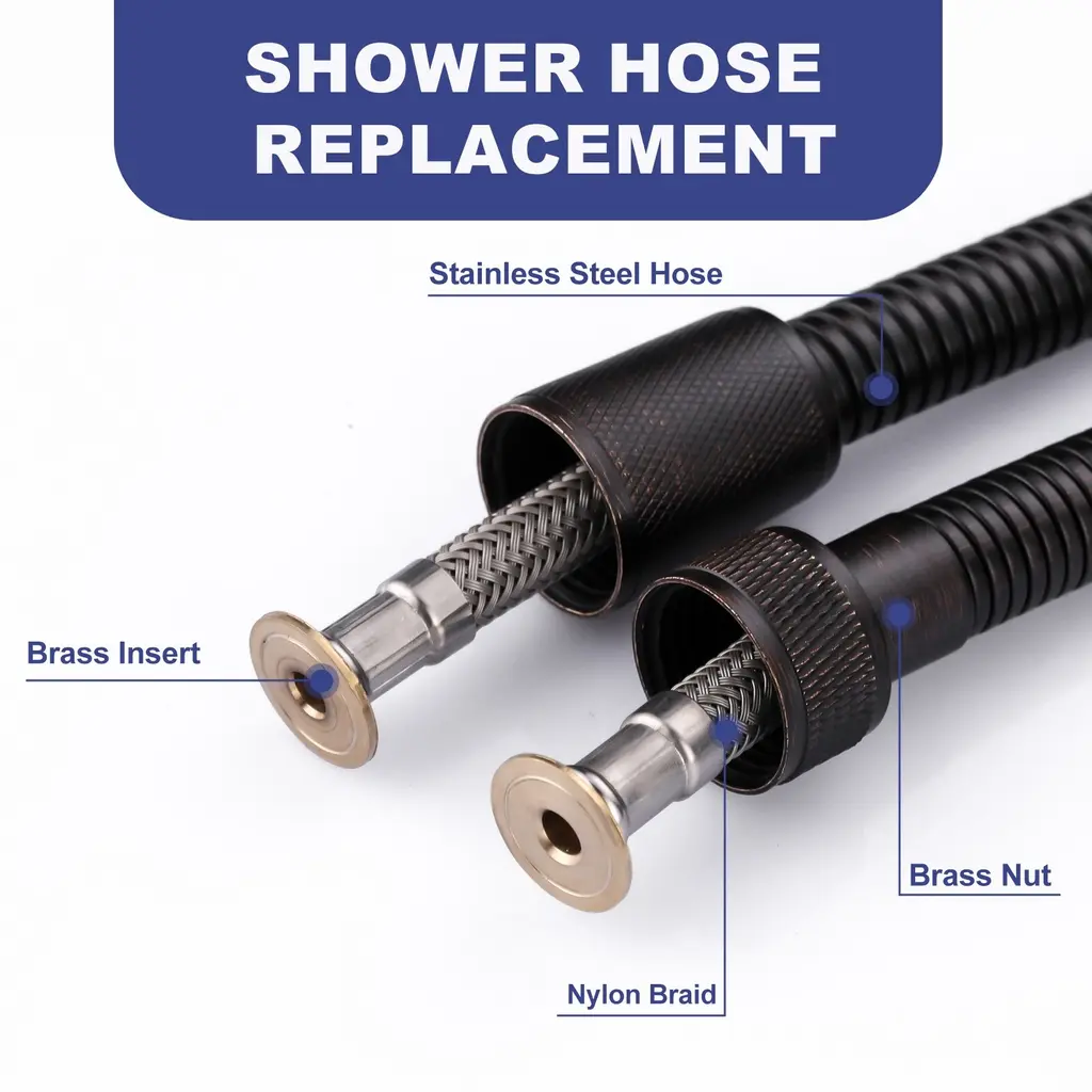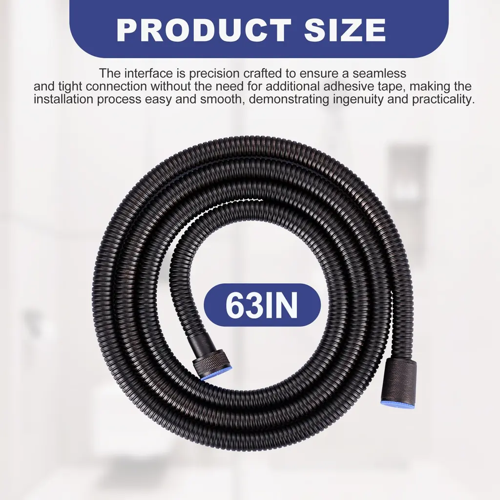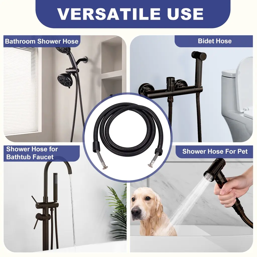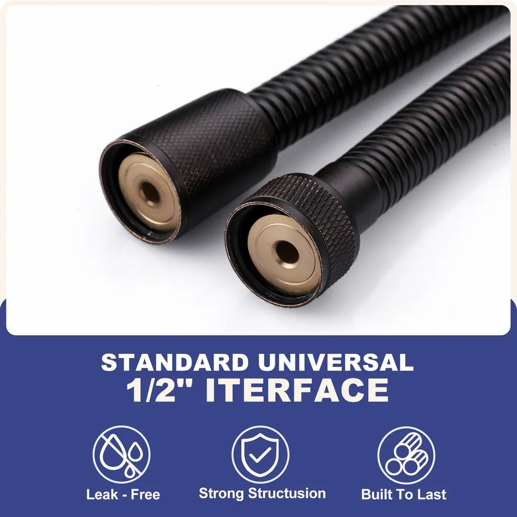 The shower hose is designed with 1/2 in. thread size connector. Works with most the shower head, tub faucet and bidet sprayer in the USA. TIPS: Washers Must be Put in Both Ends of the Hose When Install. Your shower head hose is made of high quality SUS304 stainless steel outer tube and Non-Toxic EPDM inner tube, which is high temperature resistance, explosion-proof, rust-proof, leak-proof, high flexibility and durable. The new 360° anti-wrap innovative structural design, has a good connection, can be 360° swivel. Keeping your shower hose kink-free. The rv shower hose can be extended to an extra-long handheld shower hose. It is not only suitable for bathing, but also for toilet cleaning, refilling fish tanks, cleaning bathroom, flushing potty chairs, pet bathing, etc. Both interface connectors are constructed from copper inserts. Solid copper hose nuts for a reliable leak-free connection.HighlightsFits G1/2 in. connection