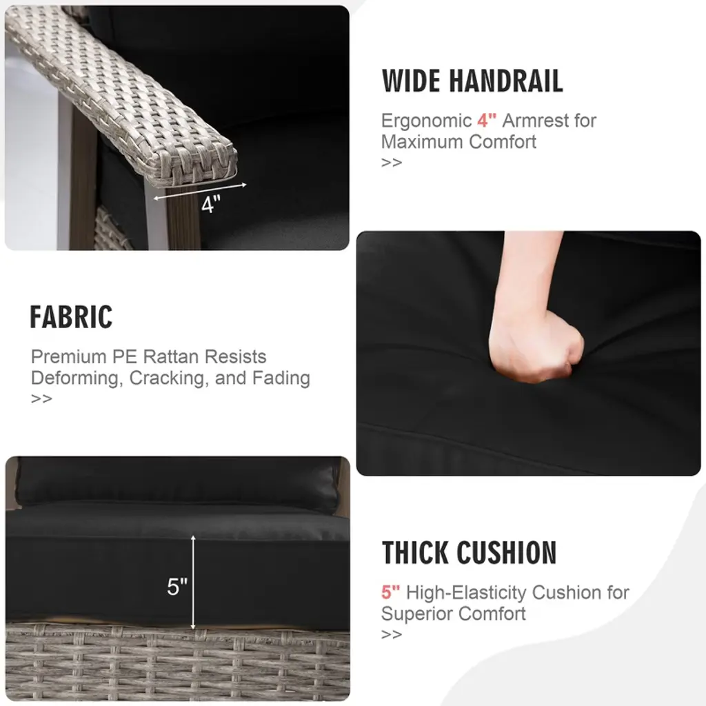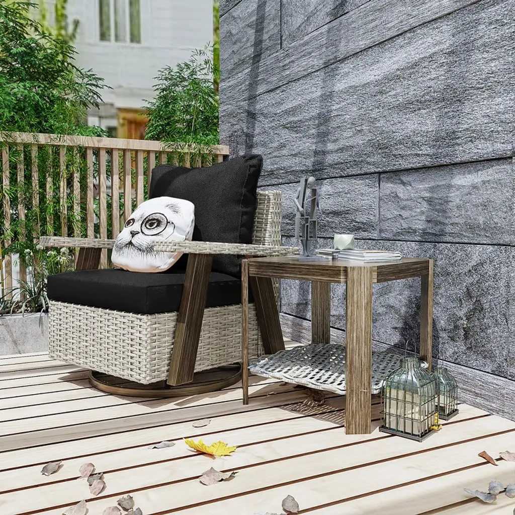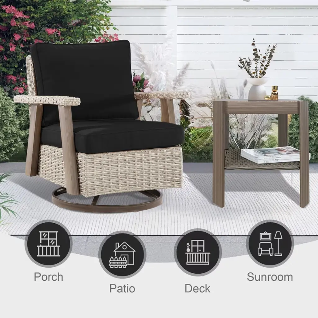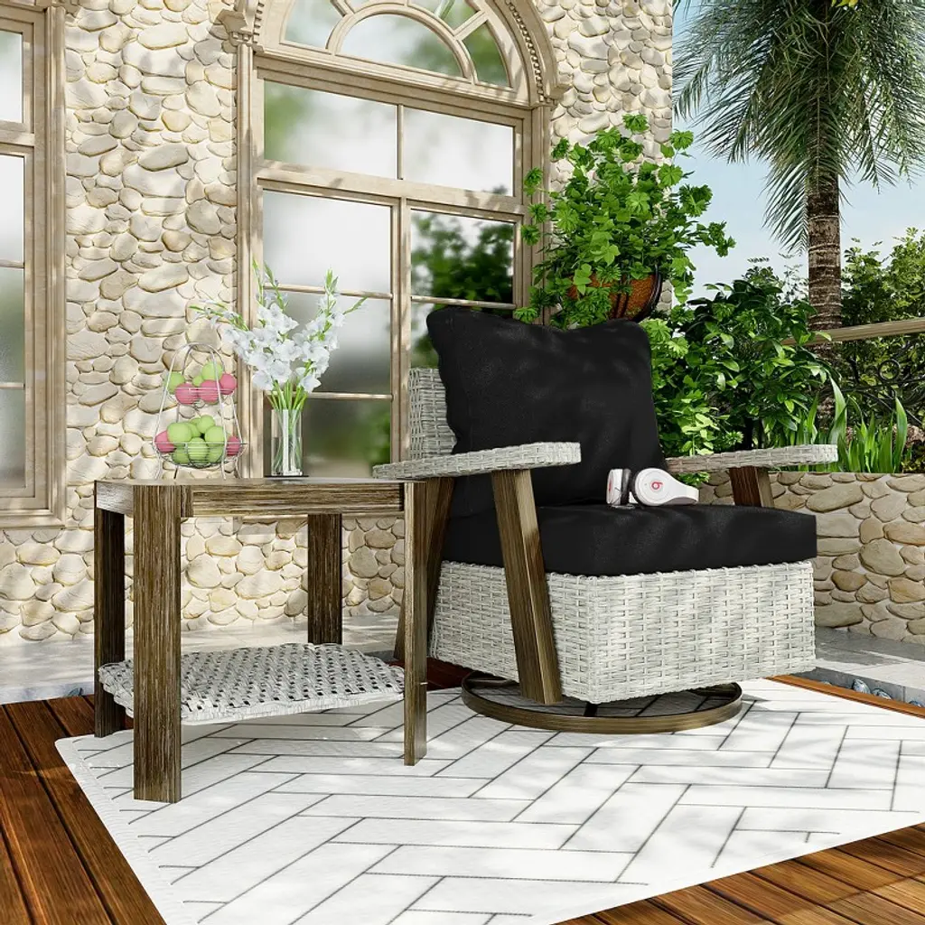 Upgrade your outdoor seating with this stylish swivel rocking chair and side table set. Designed with all-weather wicker and soft cushions, the chair provides both 360¡ã swivel and gentle rocking motion for unmatched comfort. The matching side table features a convenient storage shelf, giving you extra space for drinks, snacks, or d¨¦cor. Perfect for your garden, patio, porch, or backyard, this set combines functionality with modern outdoor charm.