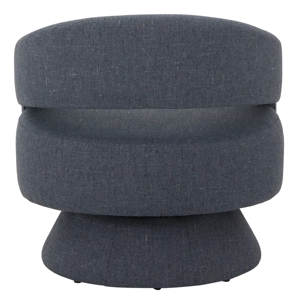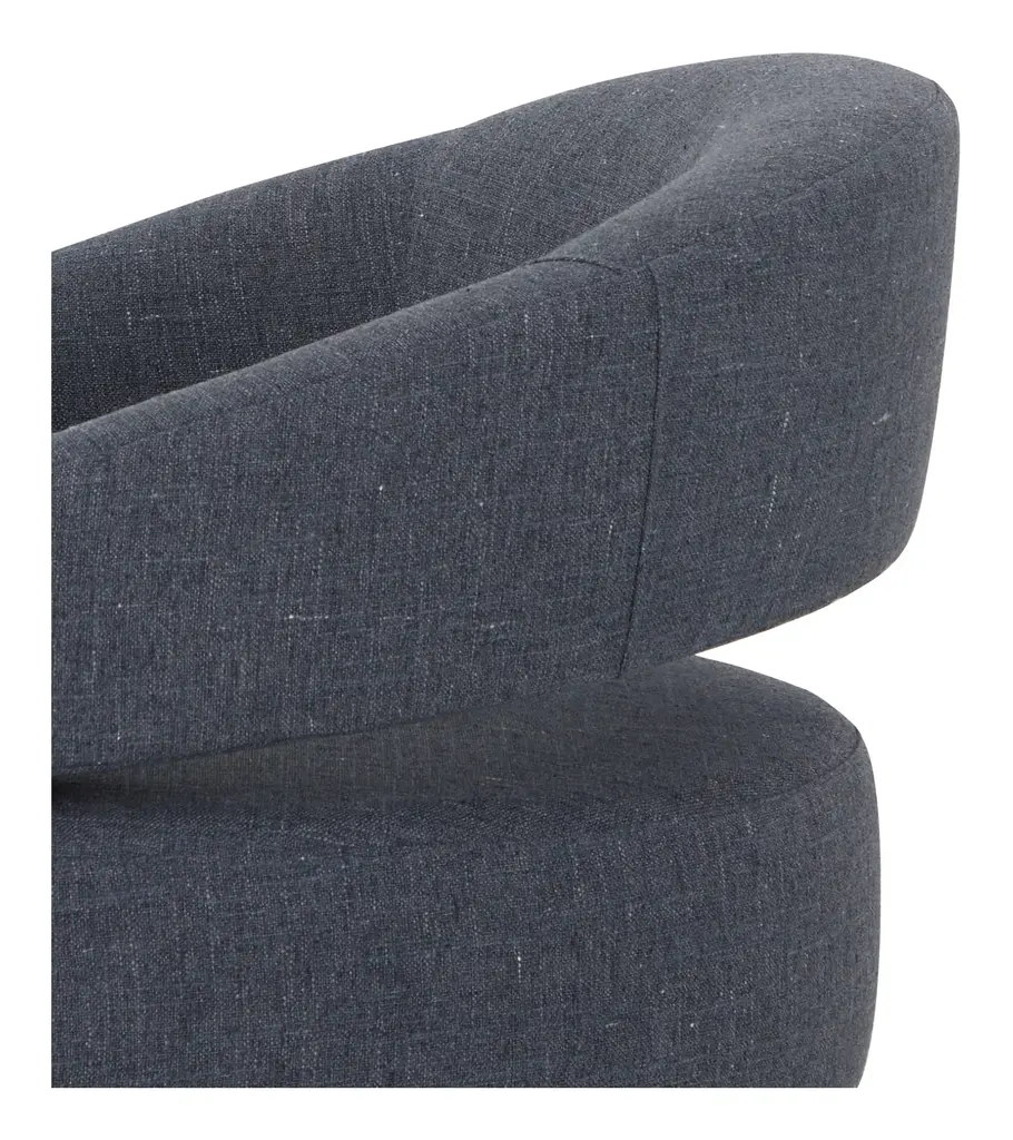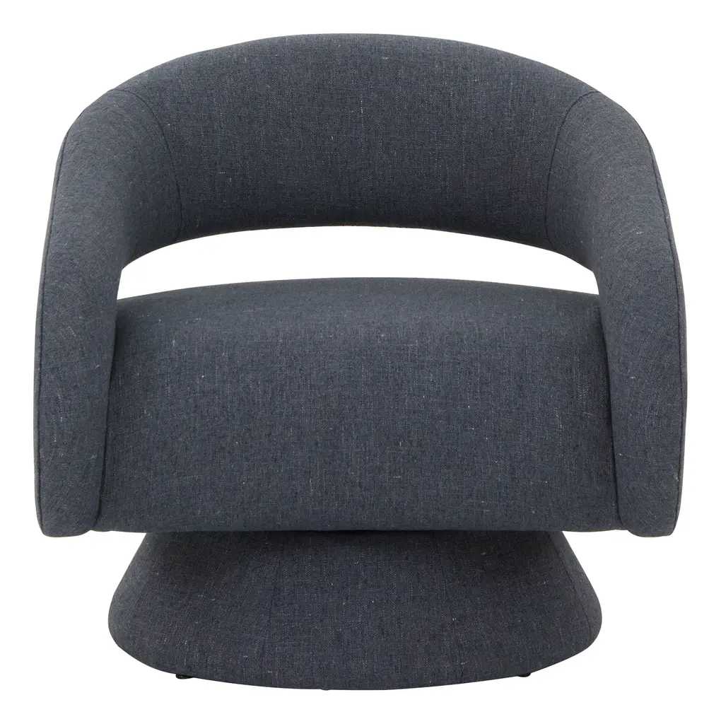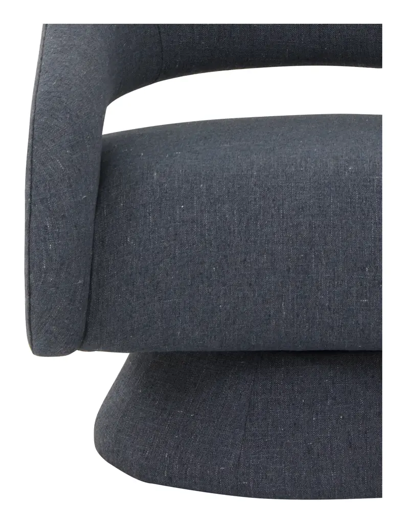 Put a modern spin on your home with our retro-inspired Ziggy Swivel Chair. This fully-upholstered lounge chair channels major mid-century vibes with its low profile, curvy lines, sleek pedestal base and open cut-out back. Along with these good looks, Ziggy’s rounded shape, sheltering sloped arms, low-lying back rest and deep, comfortably firm seat cushion also make for an enveloping, upright sit. And how could we forget that 180-degree swivel base? It allows you to rotate Ziggy from side to side with control and style for a more versatile use of space. The perfect addition to your modern living room, especially as a matching pair. •upholstered in guilde eclipse woven•fabric content: 45% rayon, 42% polyester, 13% linen•180 swivel base•sustainable construction •custom options available •made in the USA Dimensions•31"W x 31"D x 29.5"H•arm height: 21"•seat width: 23" •seat depth: 22.75"•seat height: 17.5"