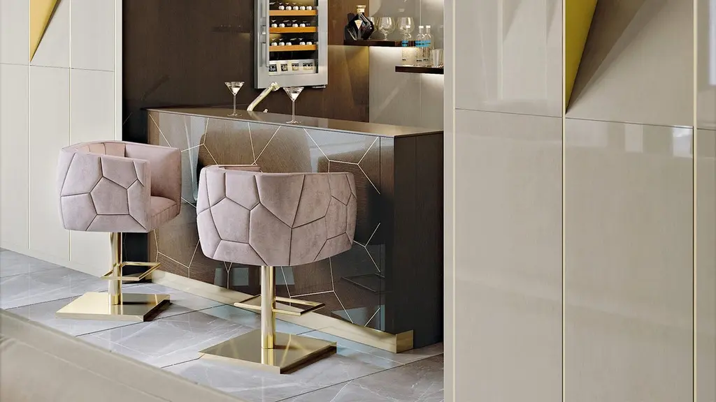 Bar stool with partial turning gold metal base and upper part upholstered with wooden frame. Characterized by a soft backrest perfectly shaped and hugs you to enhance the comfort.The wooden frame on the back with metal base and stripe on the middle complete the design to create an unique piece, making it more stylish and perfect for every occasion.Finishing is cod. 72 matte brown (40% Gloss) for the frame.The upholstery is in Velvet cod. 9101 cat. D Creme color.Other finishes, fabrics and leathers available.The item can be customized.