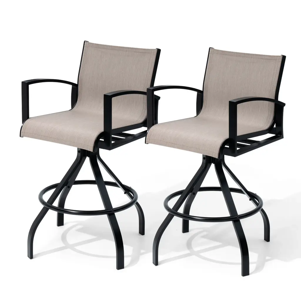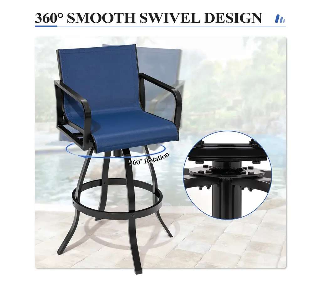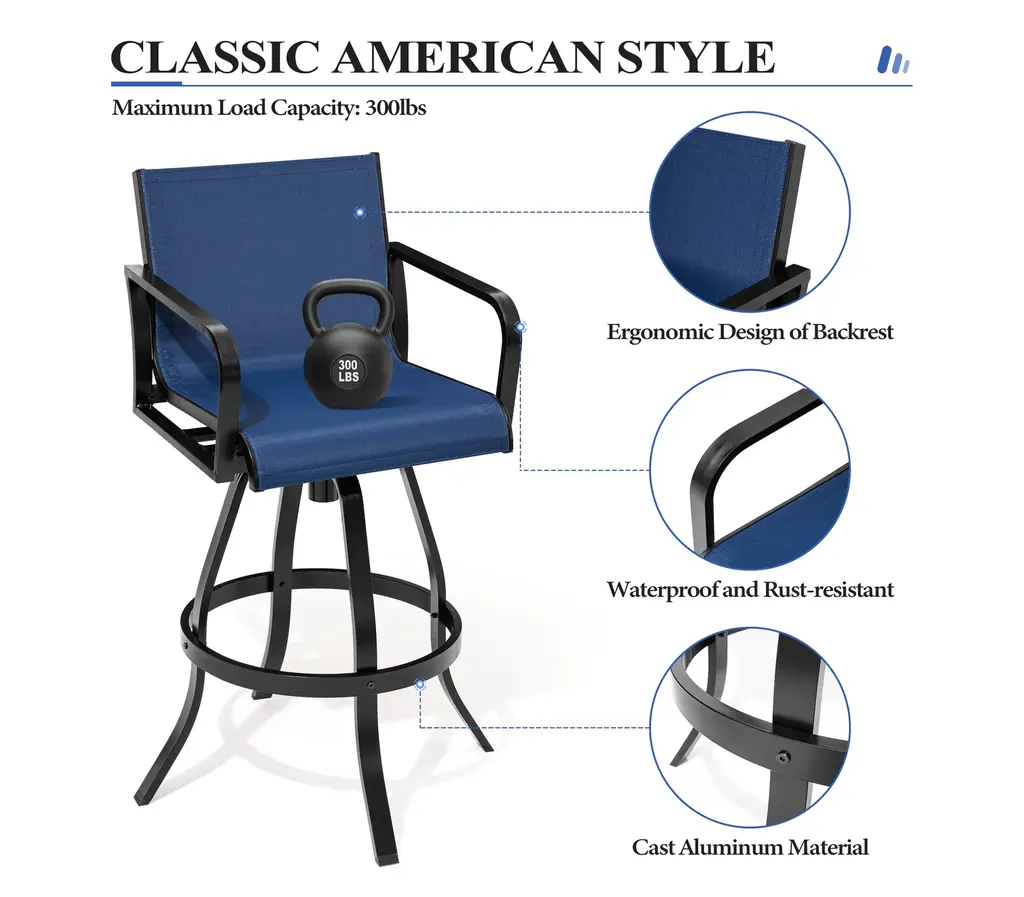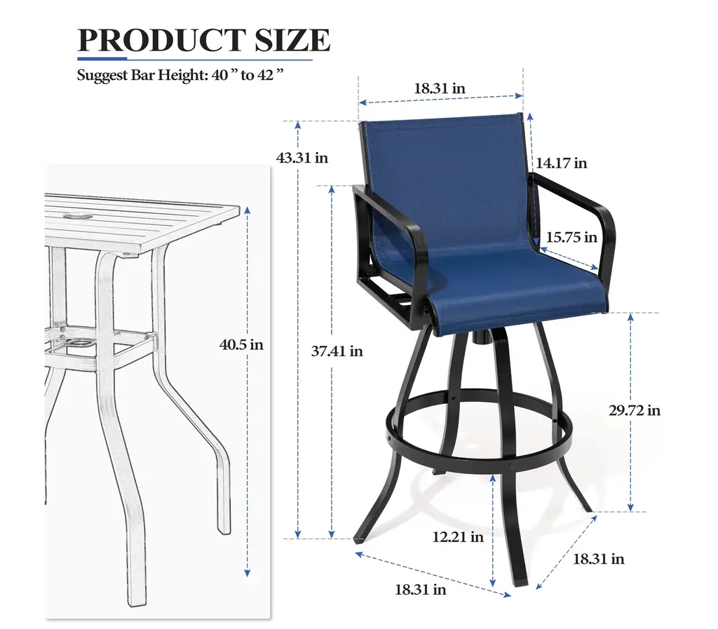 ✔【Product size】: Overall dimension: 18.31 " L x 18.31 " W x 43.31 " H. Seat size: 18.31 " L x 15.75 " W. Backrest size: 18.31 " L x 14.17 " W. Seat height: 29.72 " H. Armrest height: 37.41 " H.✔【 Comfortable design】: The armest and backrest design of the bar stools are curved and designed to be ergonomic. The patio bar stools sets make you feel soft, comfortable, relaxing.✔【High-grade material】: The patio swivel bar stools are made of breathable textilene fabric and sturdy powder-coated cast aluminum frame. The fabric is durable and ventilated, easy to clean. Thanks to cast aluminum frame, each patio bar stool weight capacity holds up to 300 lbs.✔【360 Degree swivel】: Swivel bar stools make the chair 360 degree rotatable. The swivel stools make you talk with others easily or enjoy your leisure time. Moreover, footrest provides extra comfort.✔【Fit various occasions】: The patio bar stools can be used in patio,indoor, outdoor garden, bar,park, porch, poolside and yard but also suitable for indoor, kitchen, living room.