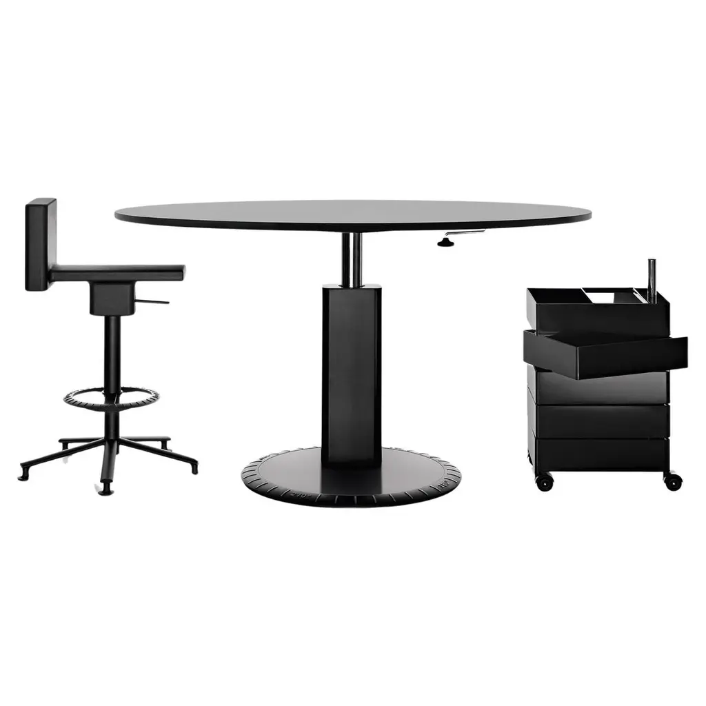 The 360° collection consists of a chair, a stool, a table and two containers on wheels, which open the way to a new concept of office work.The stool 360° (and also the chair) is unconventional or it would be better not to call it stool at all, as it certainly has little to do with the common idea of stool.360° is, in fact, neither a stool nor a chair, but something in-between.Its name implies that it swivels around and that one can sit on it in all directions. 360° is not intended for long stints of work in a static position, but it encourages a form of dynamic sitting, short term, ad hoc, improvised - moving around.Therefore, it can be considered as a forerunner of the office chair of the future.