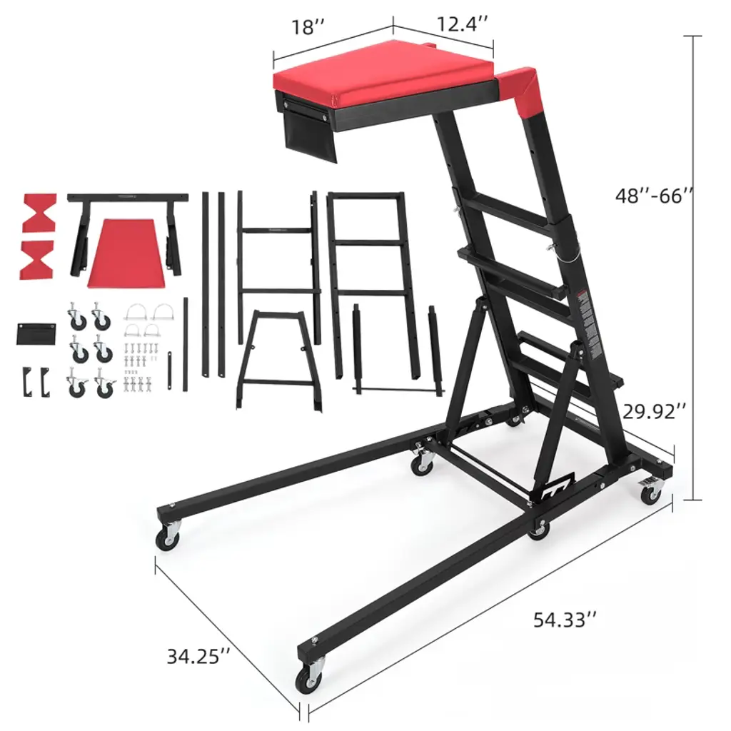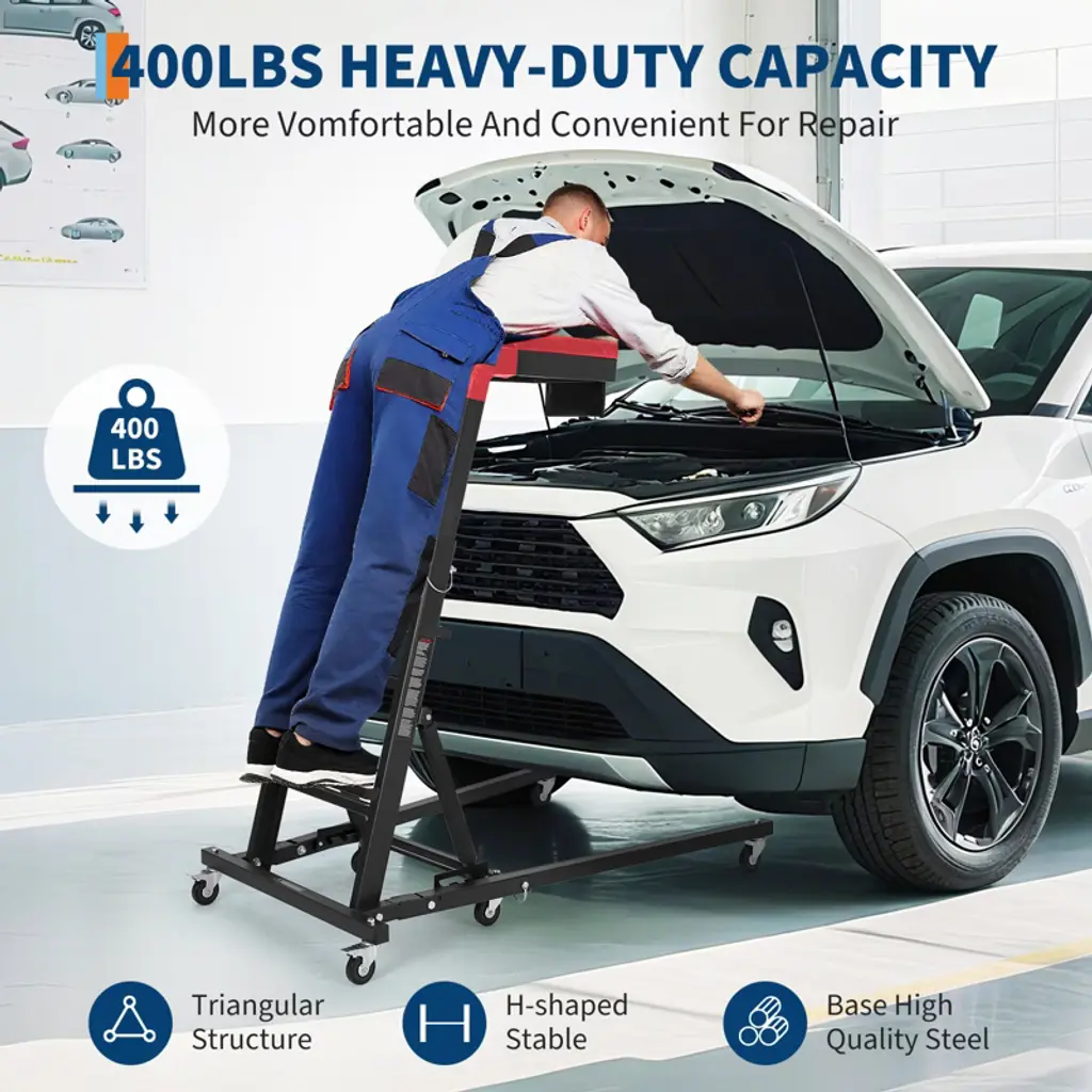 400lb Capacity Foldable Engine Creeper - Adjustable Height (48-66") Automotive Stool w/ 6 Wheels & Storage for Truck/Car RepairHeavy-Duty Steel Frame - Supports up to 400lbs with reinforced joints for mechanic-grade durability5 Height & 3 Angle Adjustments - Customizable from 48" to 66" to fit trucks/SUVs (reduces back strain)Locking Wheel System - 6 swivel casters (2 lockable) for smooth mobility + secure positioningThick Leather Cushion - 2" padded seat with tool storage bag for all-day comfortFolds Flat for Storage - Saves space in garages or workshops when not in use