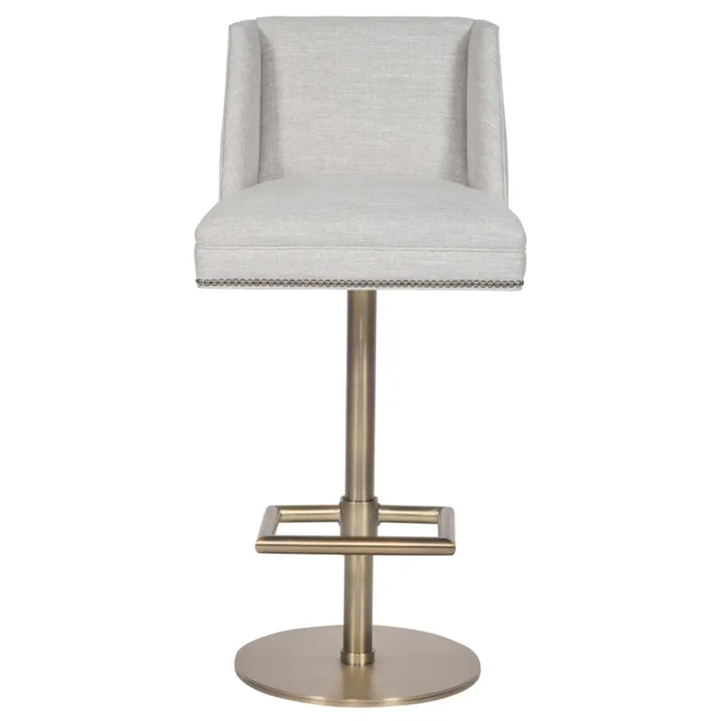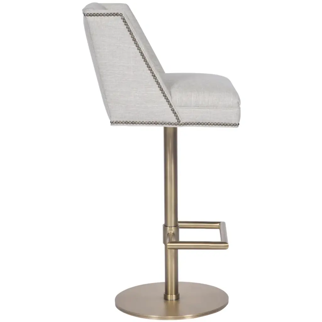 This Ace Barstool is part of the Michael Weiss Collection. Michael Weiss has proven to be as enduring as the classic furniture he designs. His signature style, defined by clean lines and architectural simplicity, expresses an acute awareness of the evolution of design. This barstool features a satin Brass base, return swivel and nail head detailing.