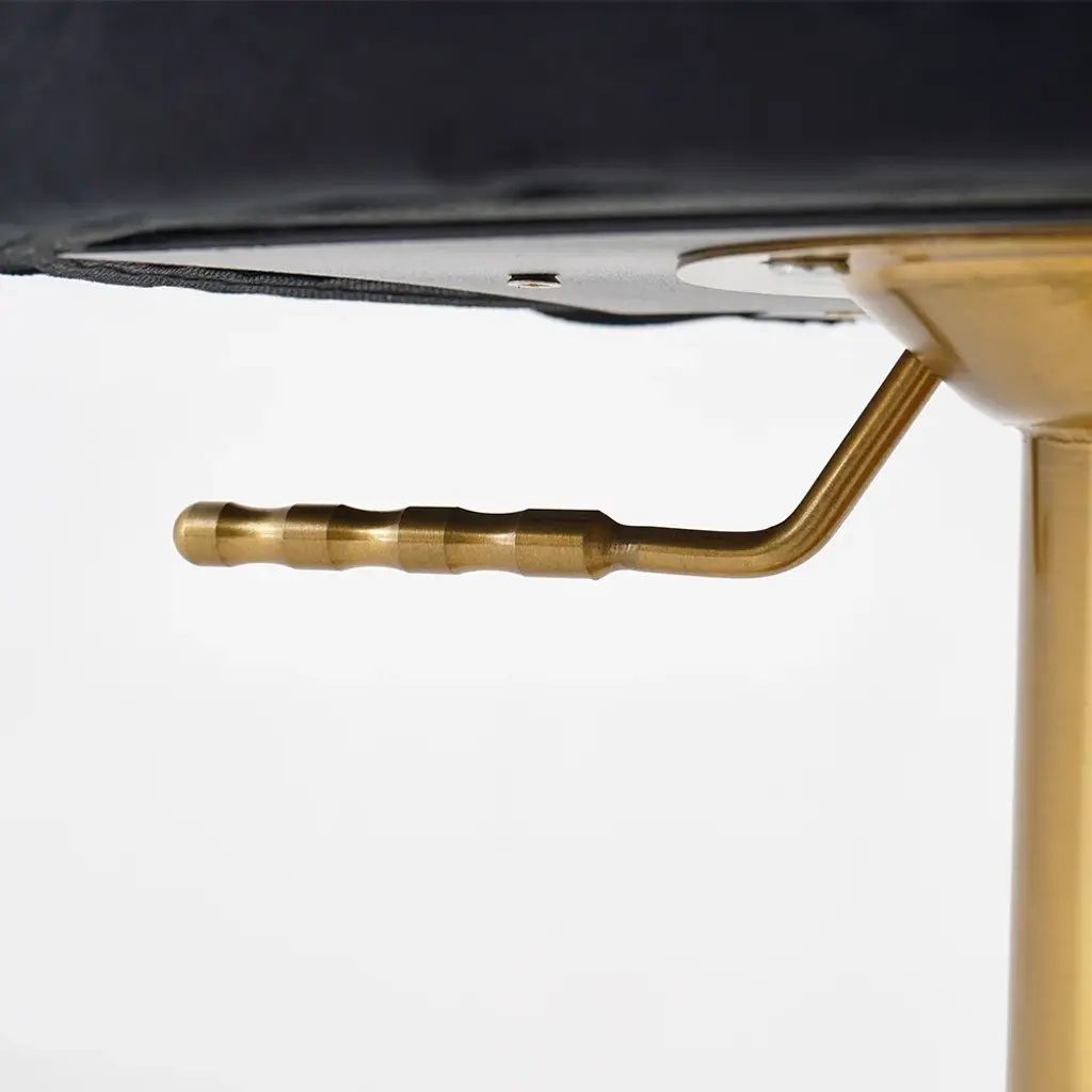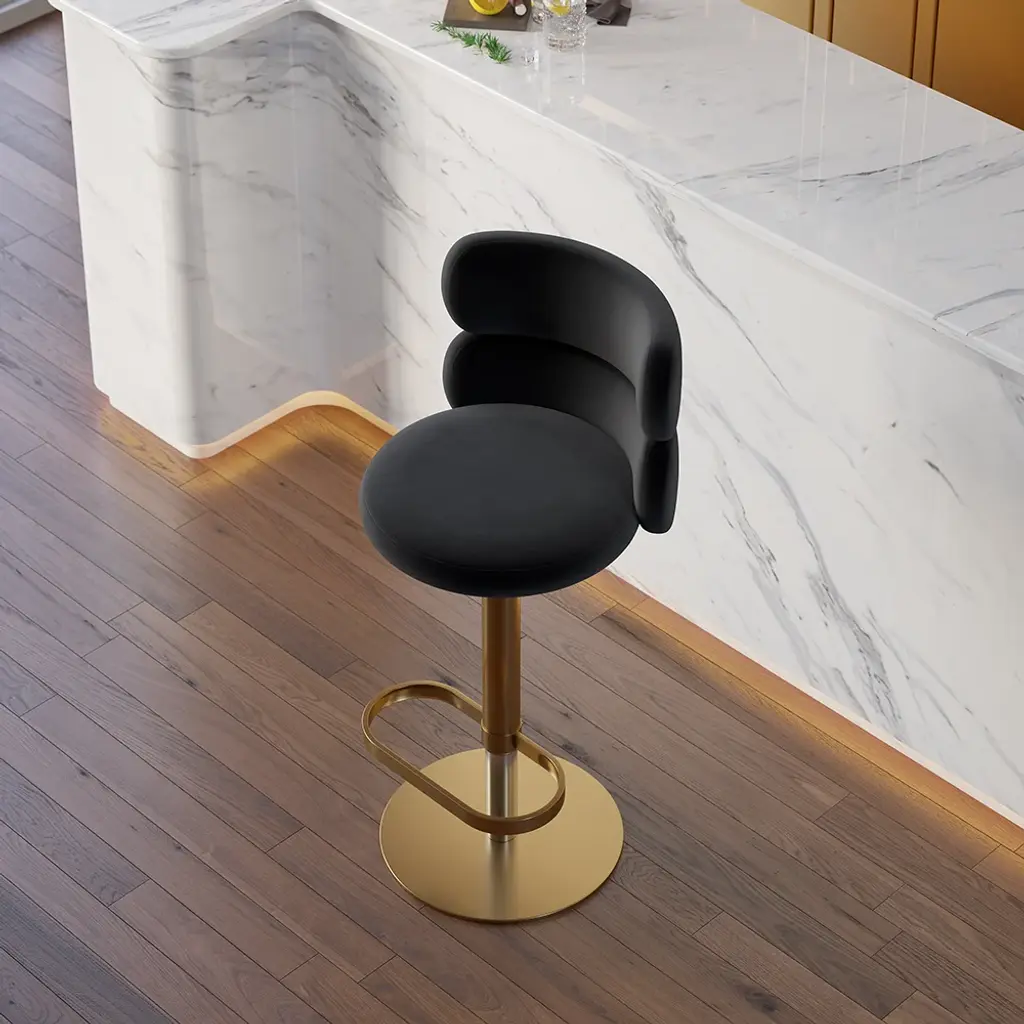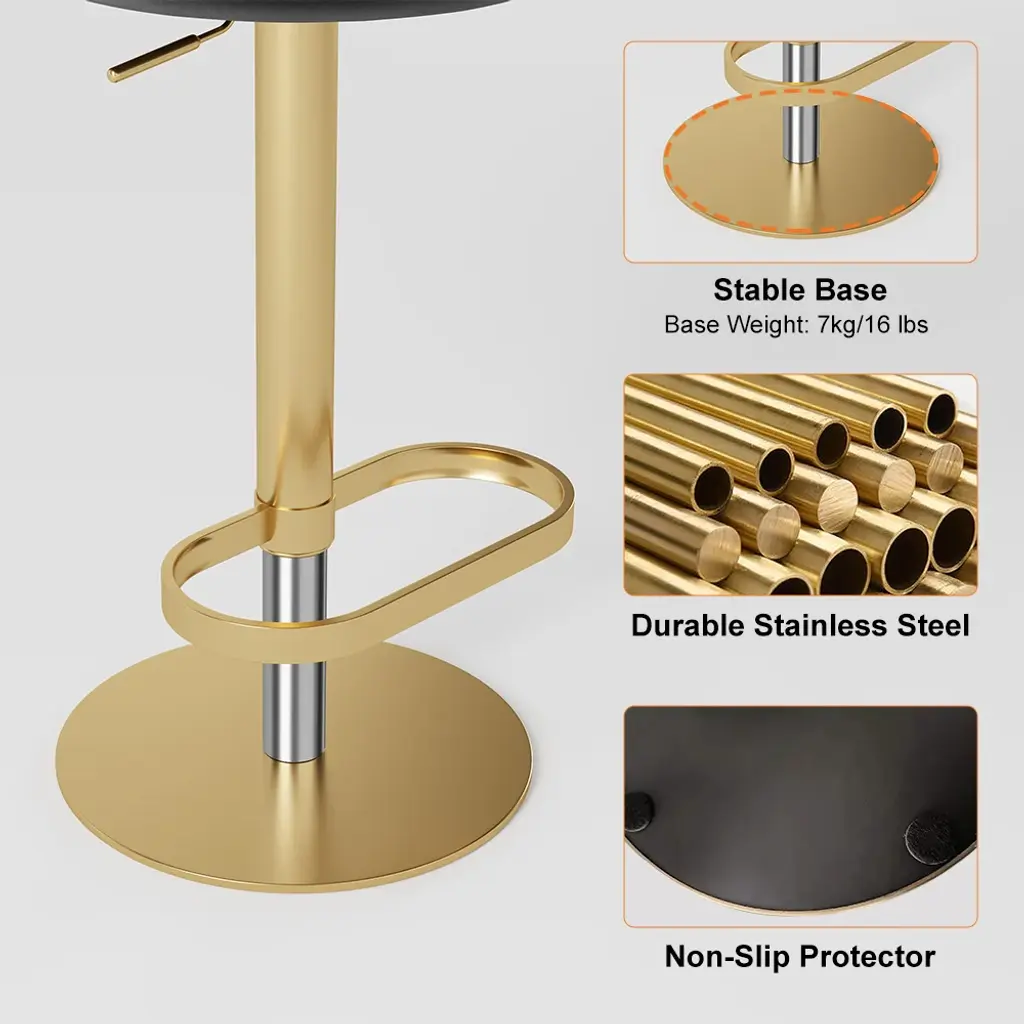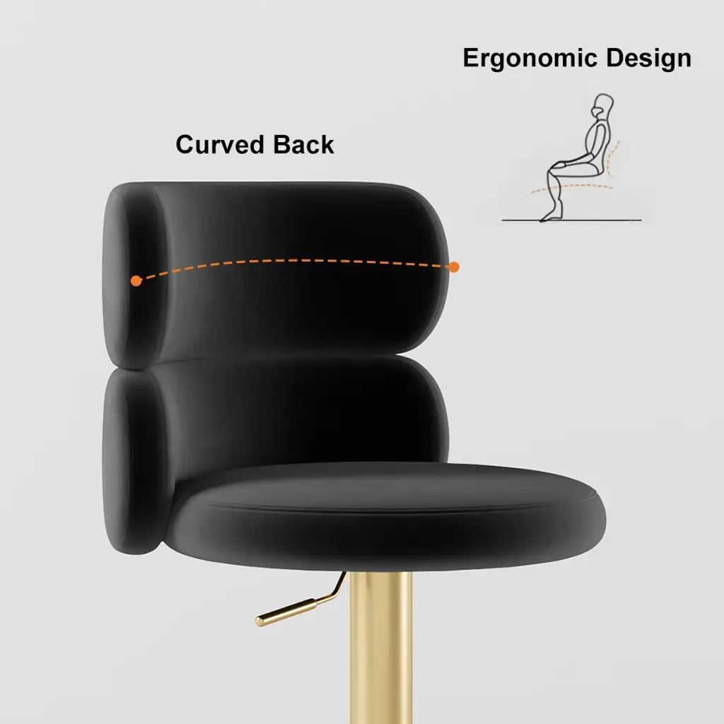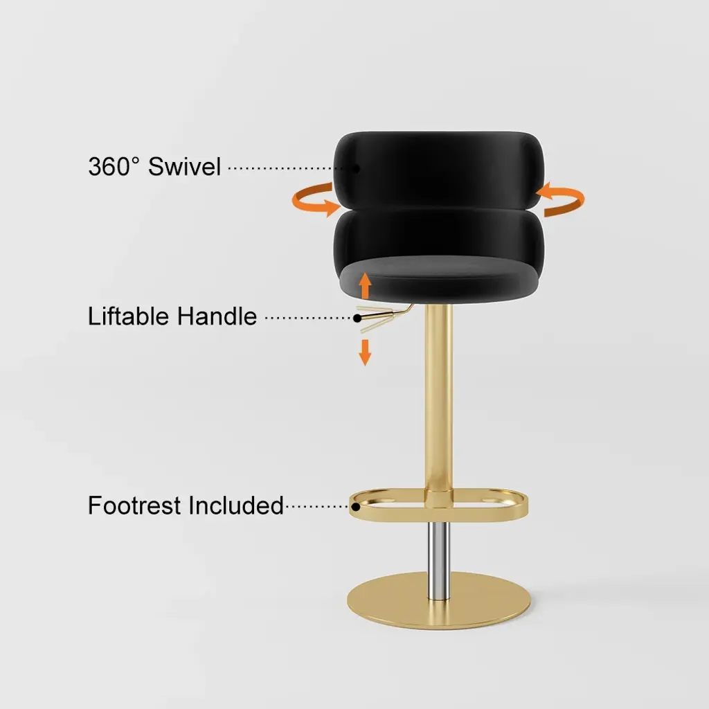 Give your dining or kitchen area a face-lift by placing this stylish modern swivel bar stool. It comes upholstered in the richness of black velvet, featuring a comfortable round seat and a curved backrest for support. The adjustable height function makes it appropriate for various counters, while the footrest adds an extra angle of comfort. Crafted with a sleek gold stainless steel frame, this stool infuses elegance and durability into your space. The perfect setting to enjoy your meals or socialize in style, this swivel bar stool will elevate any room.