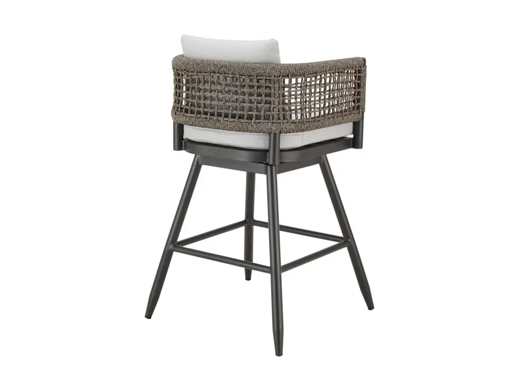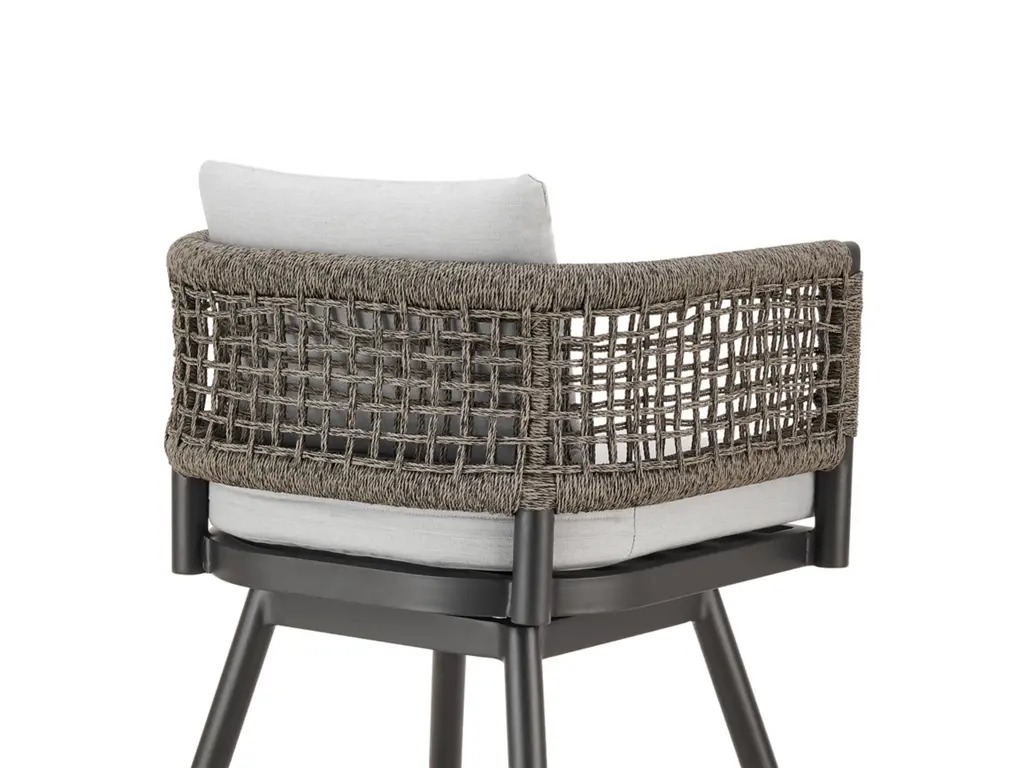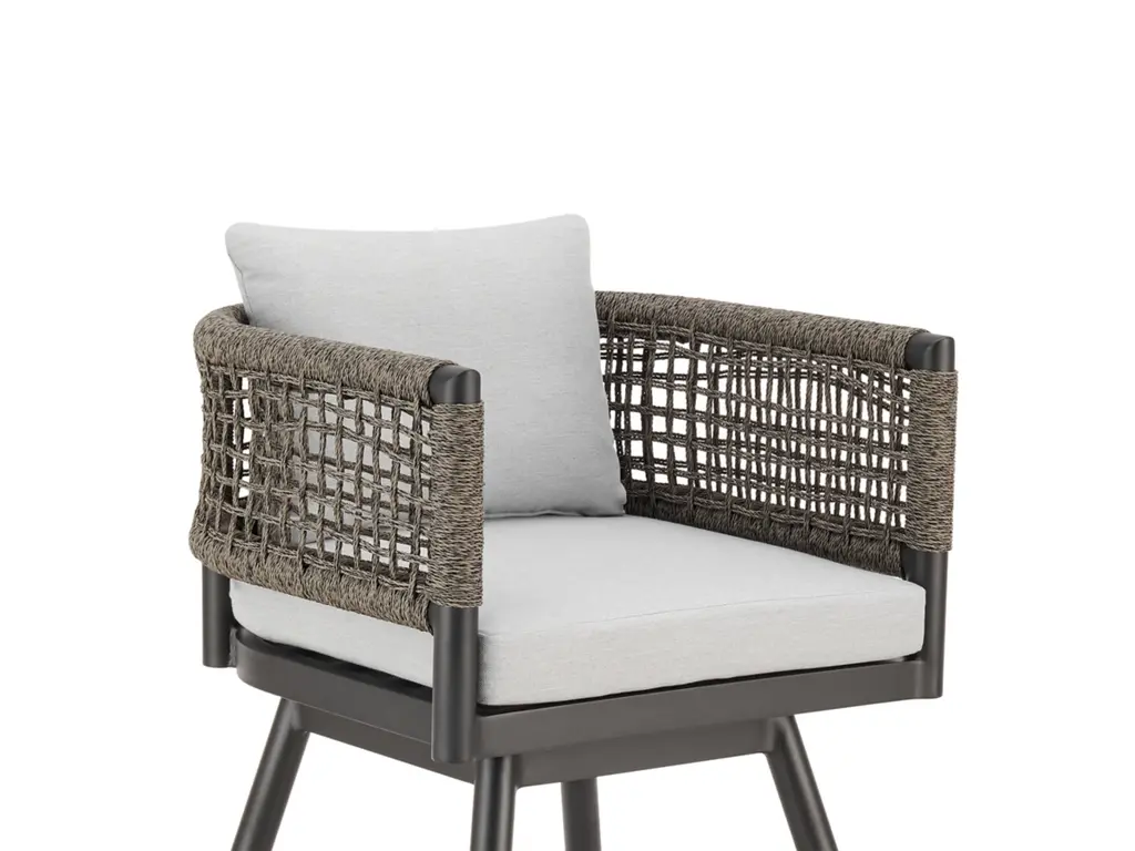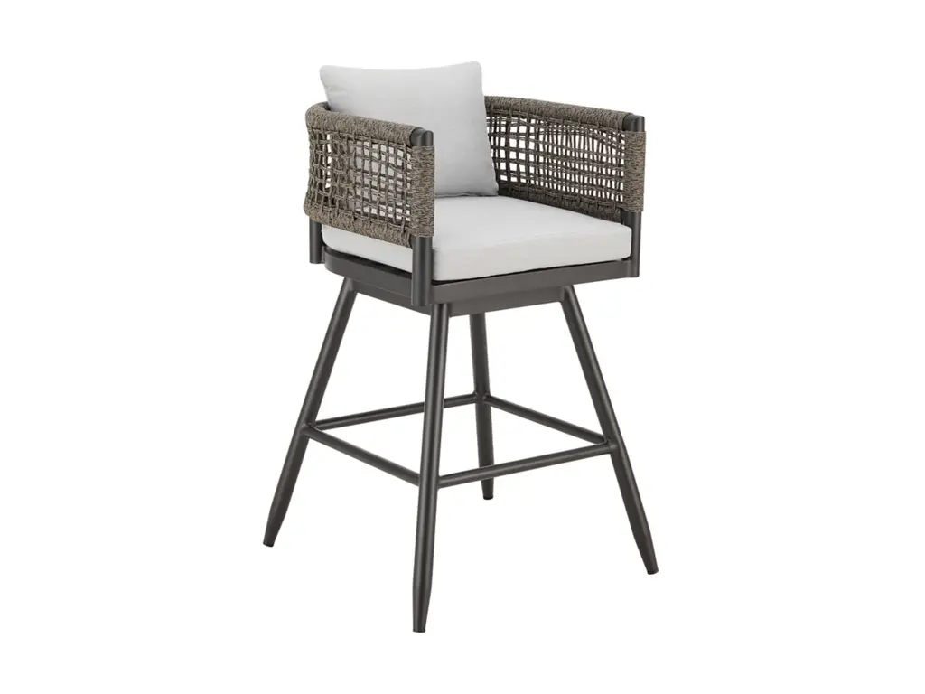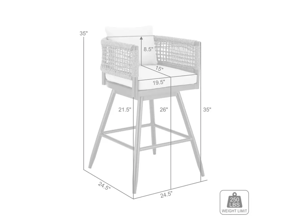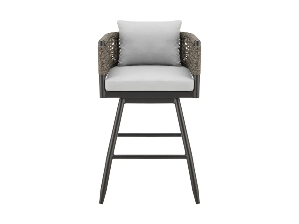 Introducing the Alegria Outdoor Patio Swivel Bar or Counter Stool - an embodiment of modern sophistication and functionality meticulously designed to elevate your outdoor entertaining space. This versatile stool seamlessly combines the sleek appeal of aluminum with the comfort of rope detailing and plush cushions, creating a contemporary and enduring piece of outdoor furniture. Crafted with precision, the Alegria Outdoor Patio Swivel Stool boasts a sturdy aluminum frame, ensuring both durability and a sleek aesthetic that complements any outdoor setting. Available in both 26-inch and 30-inch heights, this stool caters to both bar and counter heights, offering flexibility to meet your specific needs. The water-resistant and UV-resistant frame and fabric make the Alegria Stool a resilient choice for your outdoor space. Whether basking in the sun or facing unexpected rain, this stool stands as a steadfast and stylish seating solution for your patio or outdoor bar area. The inclusion of rope detailing adds a touch of texture and visual interest to the design, creating a contemporary contrast with the smooth aluminum frame. Paired with removable cushions, the Alegria Swivel Stool invites you to relax in both style and comfort, while the convenience of removable cushions facilitates easy maintenance. Whether you're sipping cocktails by the bar or enjoying a casual meal at the counter, the swivel feature of the Alegria Stool enhances mobility and social interaction, ensuring you can effortlessly engage with your surroundings. Elevate your outdoor entertaining experience with the Alegria Outdoor Patio Swivel Bar or Counter Stool in Aluminum with Gray Rope and Cushions- where contemporary elegance meets the demands of modern outdoor living.