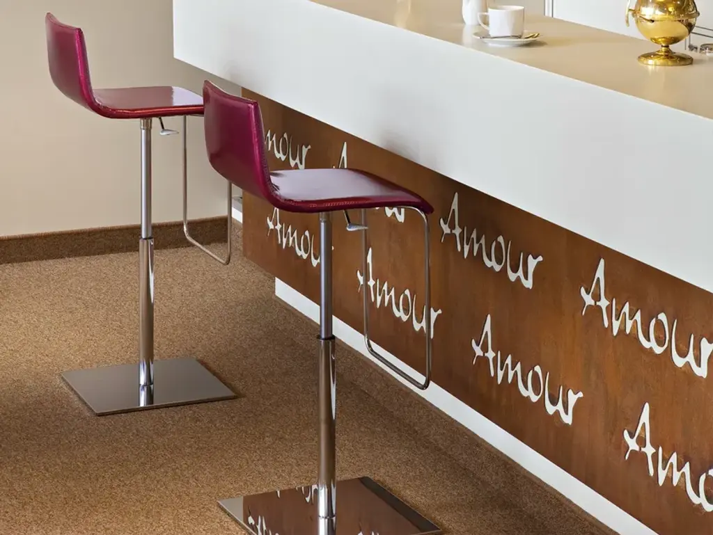 Stool for contract and residential spaces. Versions: height adjustable base. Shell upholstered. Materials and colors: stainless steel satin. Fabrics from sample book.The stool Anouk is available on fixed stackable 4 legs seel chromed frame or swivel height adjustable inox foot. The shell can be multilayer plywood, entirely upholstered in various colors or in the elegant version with cushion and exposed wood. Anouk is the perfect solution to furnish public and home spaces.