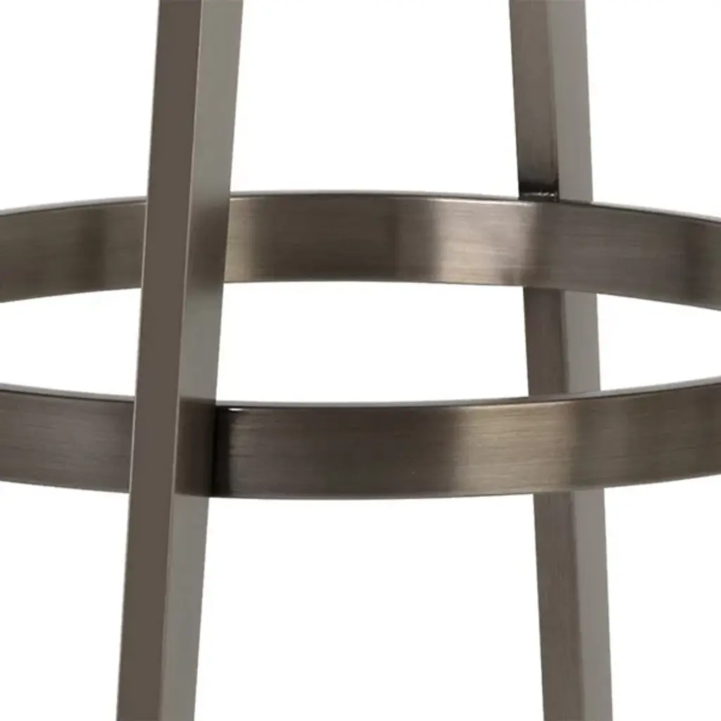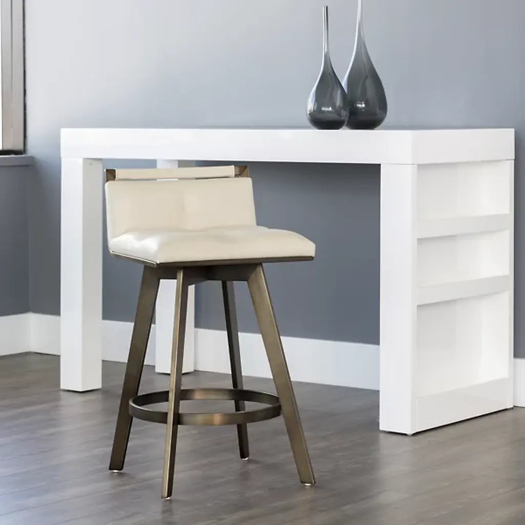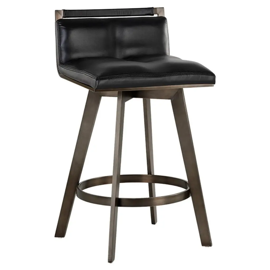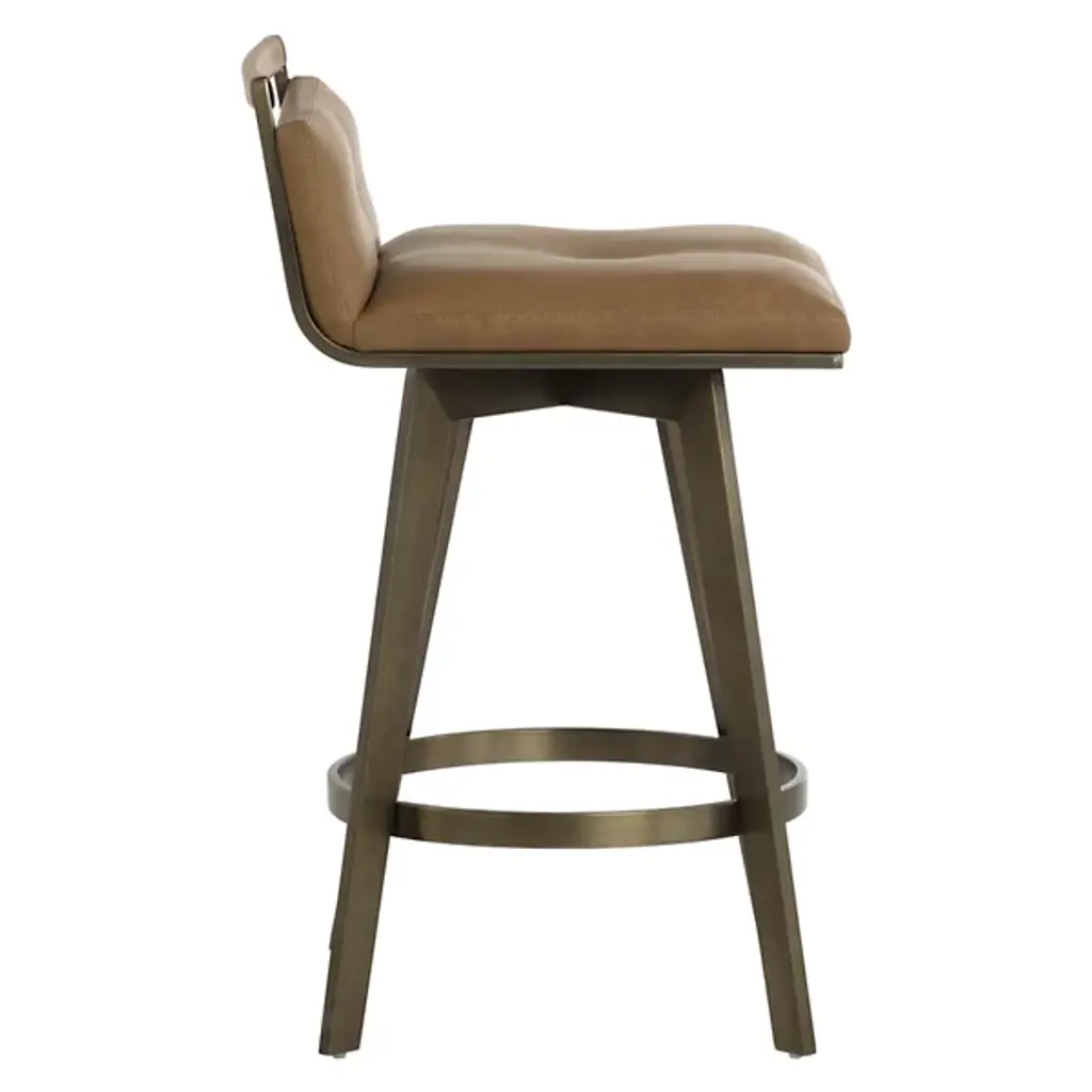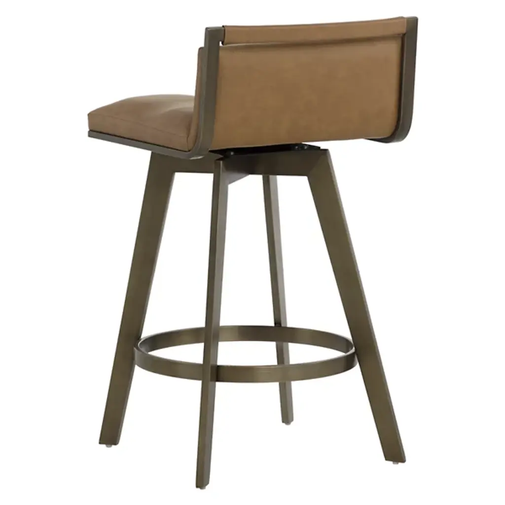 Presented by Sunpan, the Arizona Swivel Counter/Bar Stool showcases an Art Deco influence with a low-profile seatback that features squared-off shaping, combining modern and vintage aesthetics. The stool offers a 360-degree swivel with a 180-degree return, allowing for effortless mobility and convenience. A matching faux leather trim accentuates the top portion of the seatback, adding a sophisticated detail. The seat itself boasts a gently curving shape and comfortable padding, covered in crafted faux leather.