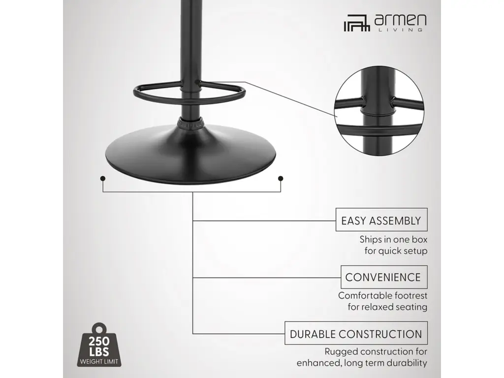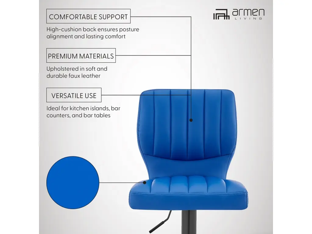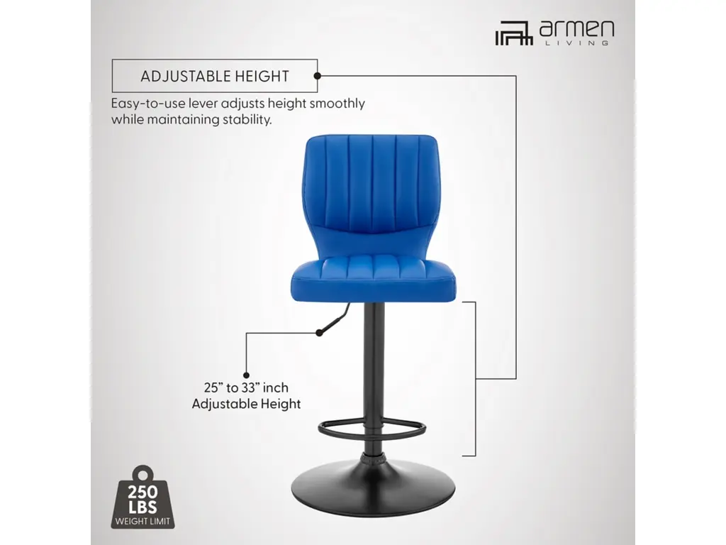 Bring comfort and modern style to your home with the The Bardot Adjustable Faux Leather Swivel Bar and Counter Stool from Armen Living. The high-grade faux leather upholstery features a textured-lined seat back, giving the Bardot a refined image. The thick, plush foam-padded seating is magnificent on your body and will keep you comfortable and relaxed for as long as you’re sitting! The Bardot features a 360-degree swivel function for full mobility and a hydraulic lift to raise your stool to the perfect level. The tough and durable metal column and accents are crafted to last and give you years of enjoyment. The Bardot Bar Stool is offered in your color choice of black, blue, grey, and red.