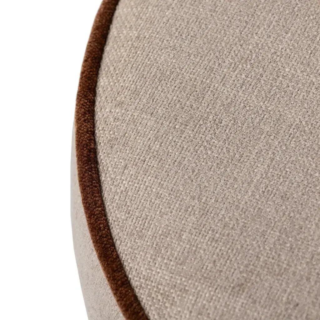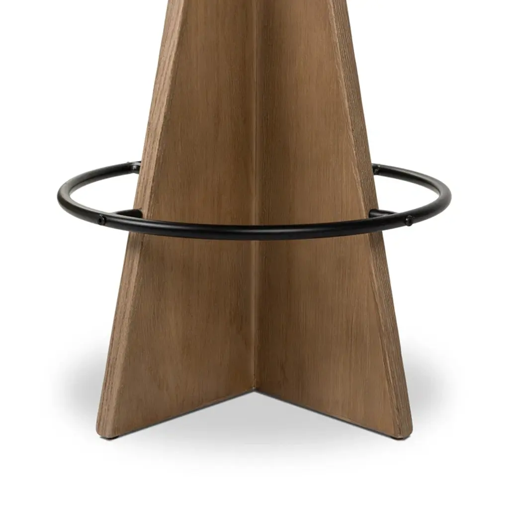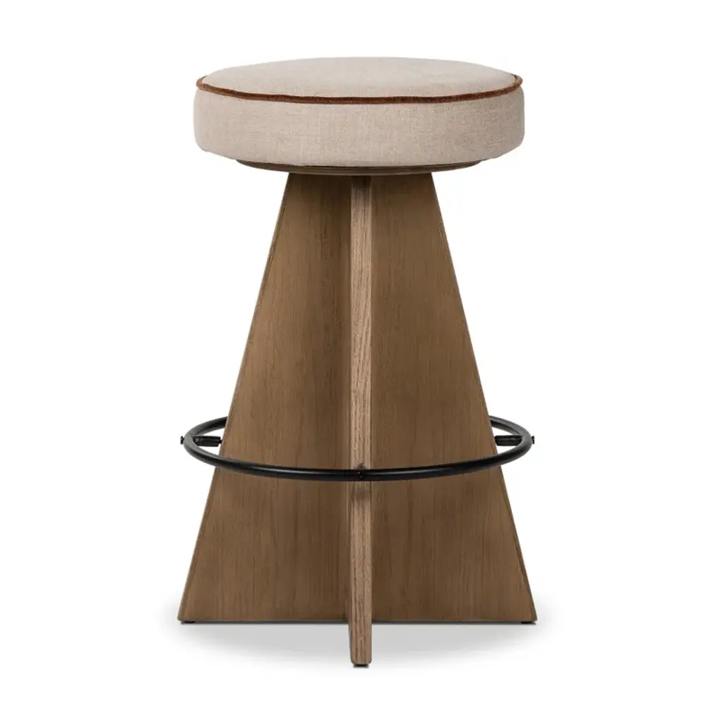 Large angular panels merge to form a geometrically inspired base in this modern stool. The circle metal ring around the base serves as a footrest, while the round upholstered cushion provides comfortable seating. The swivel function adds versatility, and the combination of wood, metal, and fabric evoke a mixed material moment.