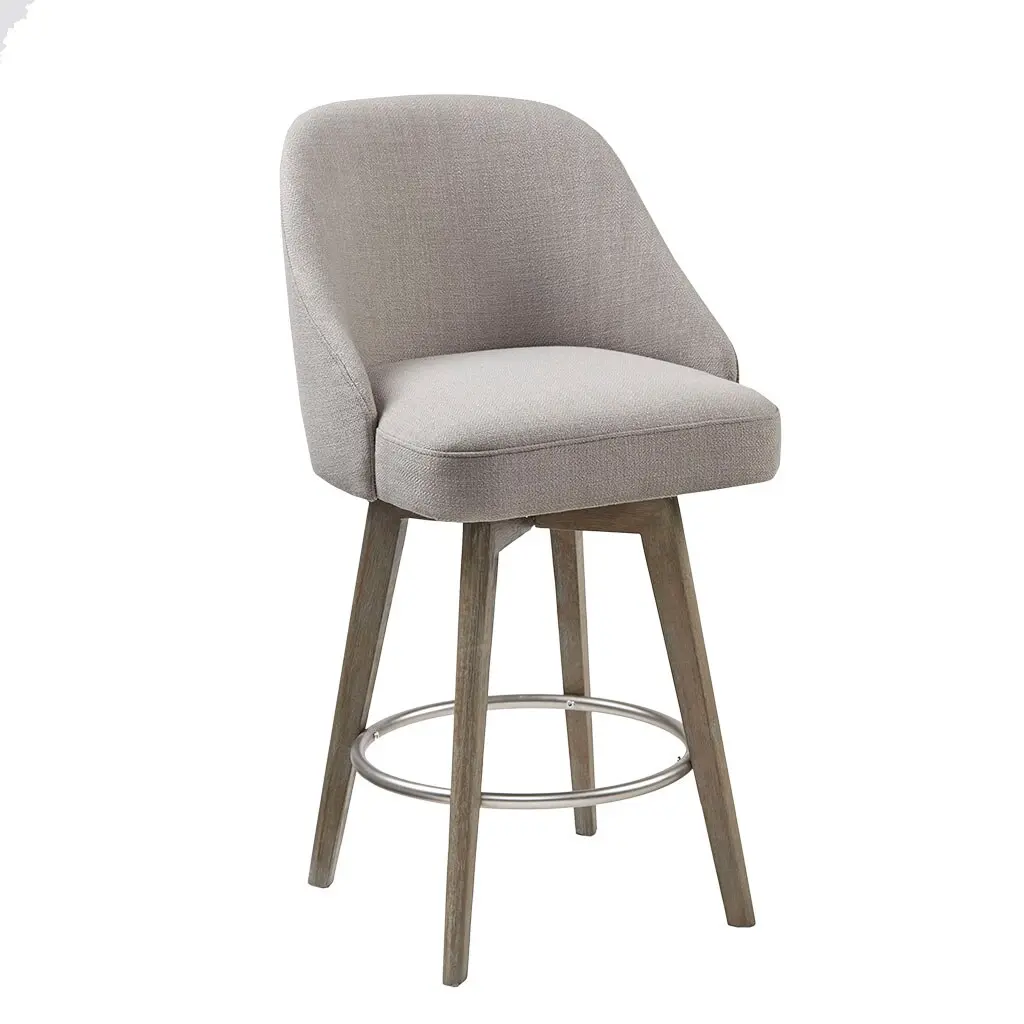 Product Features Solid wood legs Seat height 30", medium high back 360 degree swivel Metal ring footrest Assembly required, tool included. Description Beautifully crafted, the Barstool with Swivel Seat introduces a perfect blend of simplicity and sophistication. This barrel style counter stool features a swivel function, allowing you to easily rotate the upholstered seat. A smooth reclaimed grey finish on the rubber wood legs creates a clean transitional look, while a matte metal ring provides the perfect footrest. The smooth and graceful curves of this counter stool form an elegant silhouette that adds a handsome touch to your dining room. Assembly is required. Max weight capacity: 300 lbs. Product Details 1 Bar Stool:20"W x 23"D x 42.5"H Seat Dimension:20"W x 18"D x 30"H Seat Cushion Thickness:4.5" Upper legs:2"W x 1.375"H Bottom legs:1.125"W x 1"H Height:24.25"H Footrest to Floor Height:11.5"H Back Rest Size:15"W x 12.5"H Maximum Weight Capacity (Seating):300 LB Material Material: Solid wood and plywood frame, upholstered seat and back and bronze metal ring footrest Leg Material: Solid wood Arm Material: Solid wood and plywood Cushion or Upholstery Fill Material: Foam Back Fill Material: Foam Wood Finish: Reclaimed grey smooth Metal Finish: Bronze Fabric Composition: 92% polyester; 8% linen Seat Construction: Sinuous springs