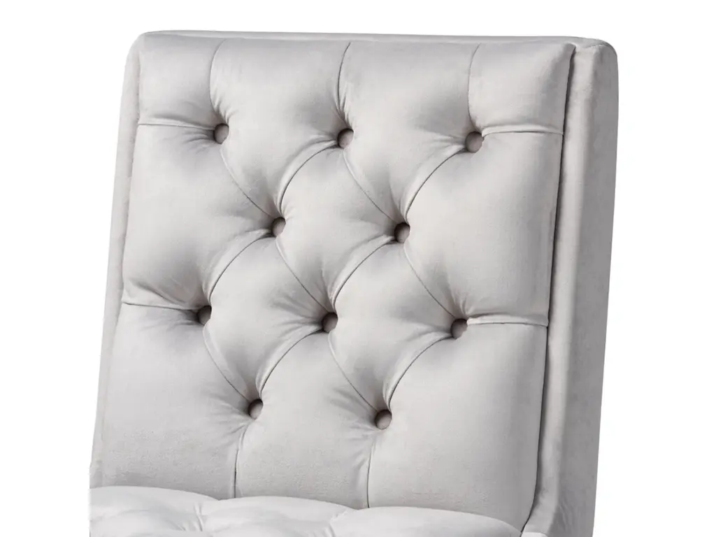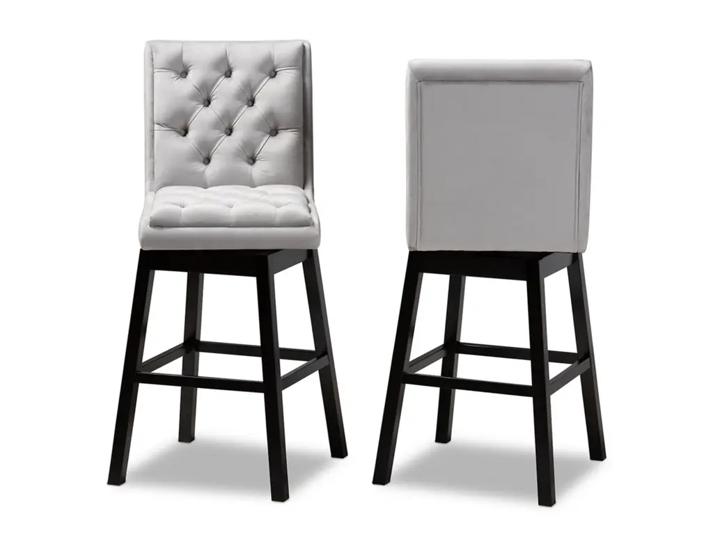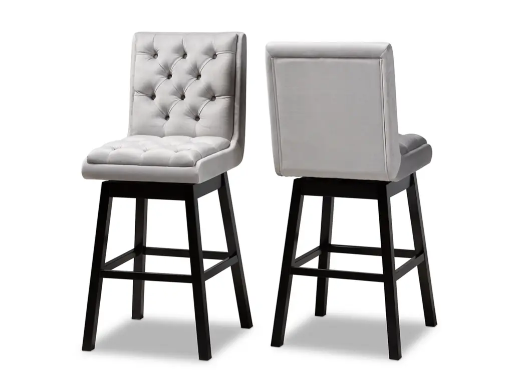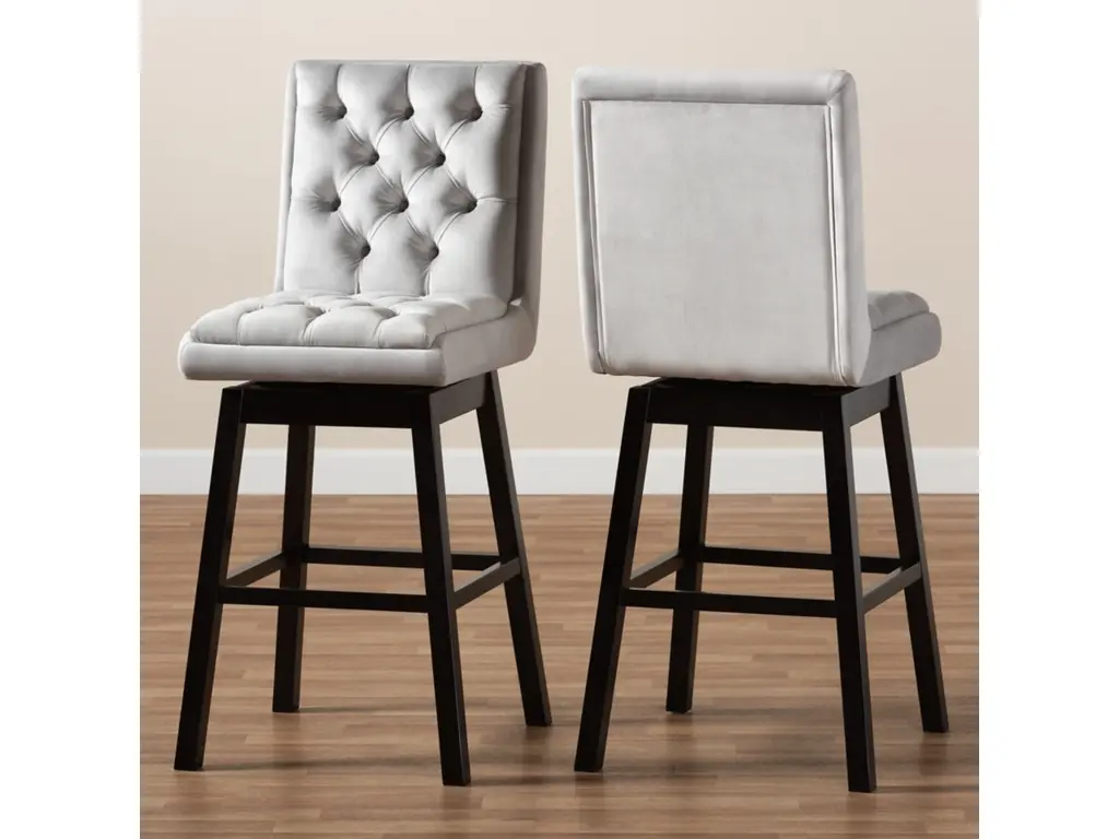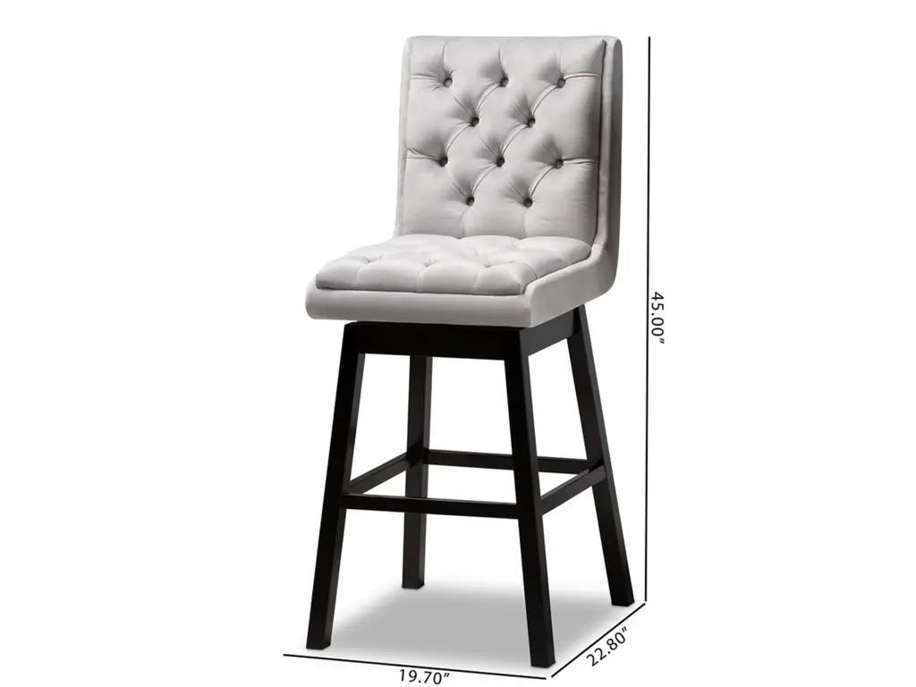 Kick back and relax with the Gregory bar stool. The Gregory is padded with foam cushions underneath light grey velvet fabric and enhanced with elegant button tufting, ma this piece a perfect addition to relaxed settings like a home bar or dining room. Made in Malaysia, the stool is supported by an elongated dark brown finished wood base fitted with foot rests. This two-piece set requires assembly and utilizes a swivel seat to enable movement. The Gregory bar stool provides comfortable back support in a fantastic modern design that elevates the home bar to new heights.