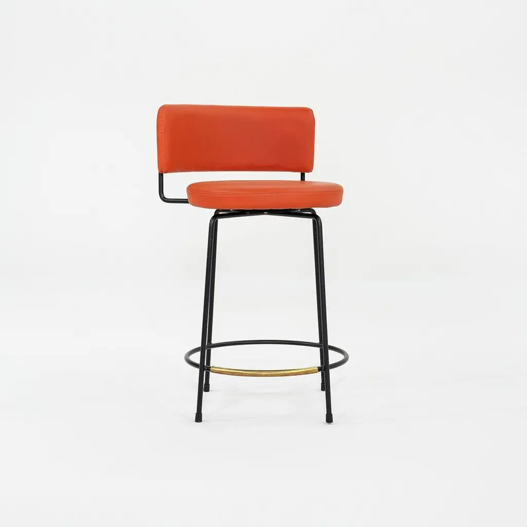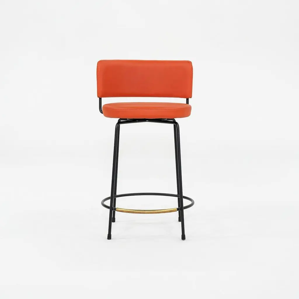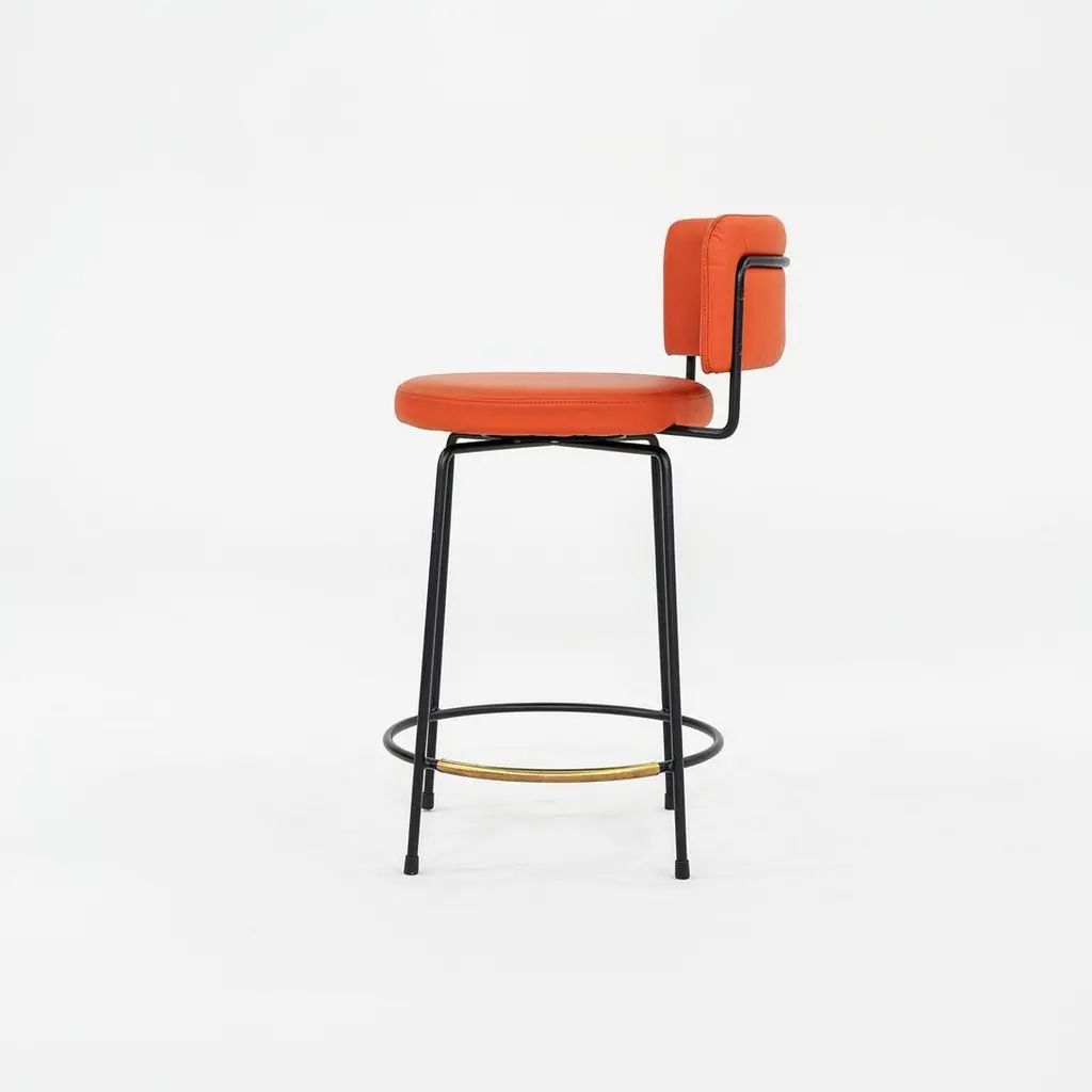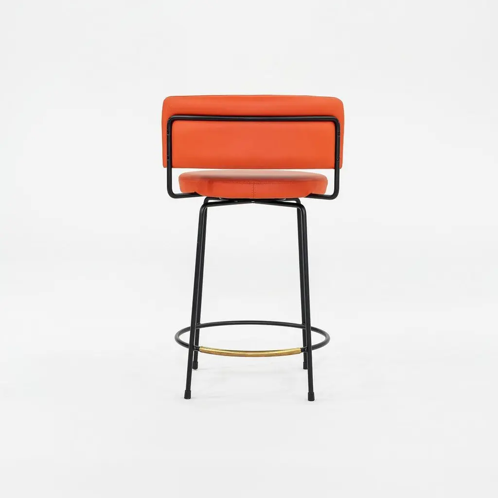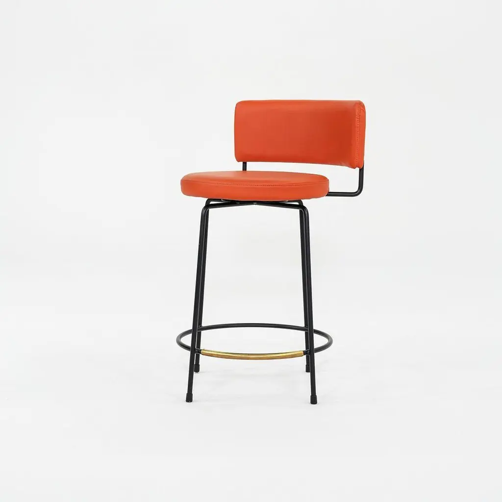 This is an Upholstered Diiva Swivel Counter Stool, designed by Grazia Materia for Grazia & Co. in Australia in 2014. These examples were produced ca. 2022. The listed price includes one stool, and we have seven stools available for purchase. They have a seat and back upholstered in orange vinyl, and have a frame constructed of black powder-coated steel. Raw brass footrests round out the design. Each stool measures 17.75 inches deep, 17.75 inches wide, and 29.25 inches high. They have a seat height of 21.75. A couple of the pieces have scuffs to the vinyl on the back of the seats, and the legs and frames have a few very small scratches. Overall, these counter stools are in very good condition. Please see photos.