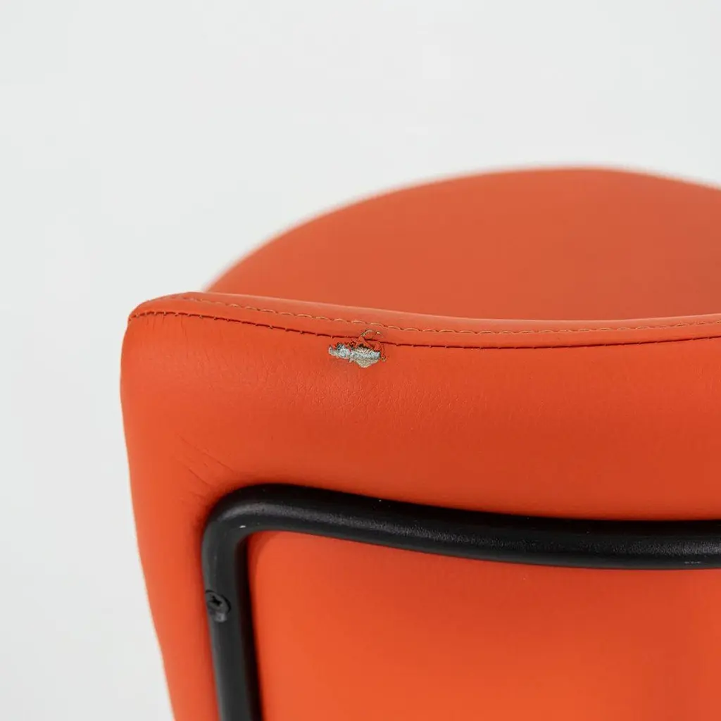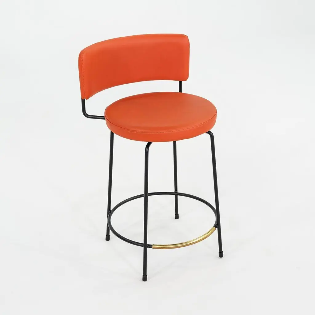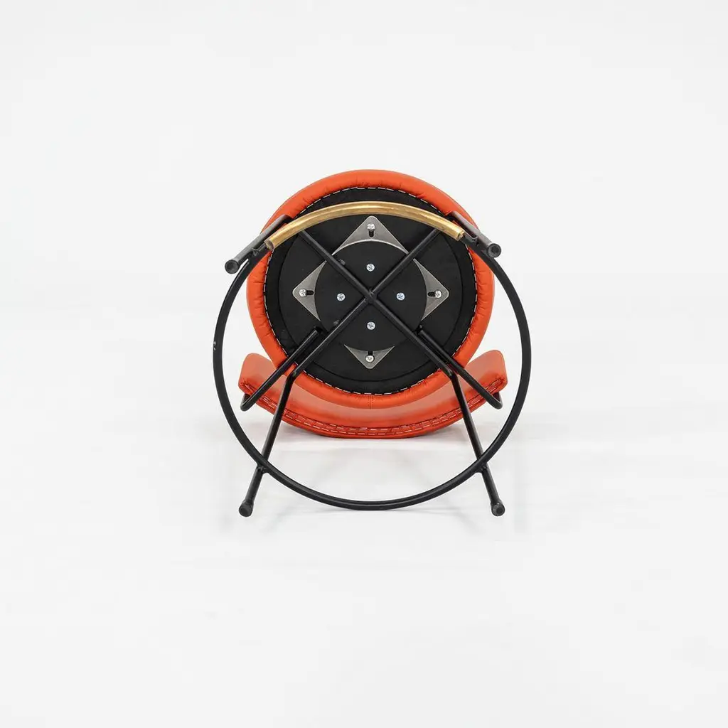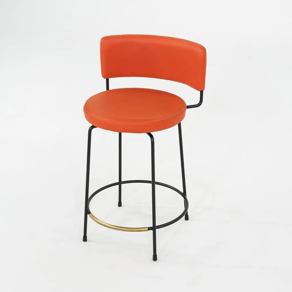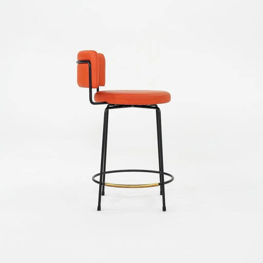 This is an Upholstered Diiva Swivel Counter Stool, designed by Grazia Materia for Grazia & Co. in Australia in 2014. These examples were produced ca. 2022. The listed price includes one stool, and we have seven stools available for purchase. They have a seat and back upholstered in orange vinyl, and have a frame constructed of black powder-coated steel. Raw brass footrests round out the design. Each stool measures 17.75 inches deep, 17.75 inches wide, and 29.25 inches high. They have a seat height of 21.75. A couple of the pieces have scuffs to the vinyl on the back of the seats, and the legs and frames have a few very small scratches. Overall, these counter stools are in very good condition. Please see photos.