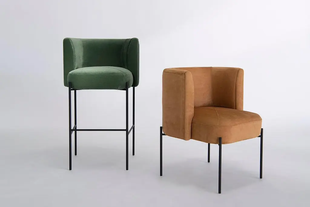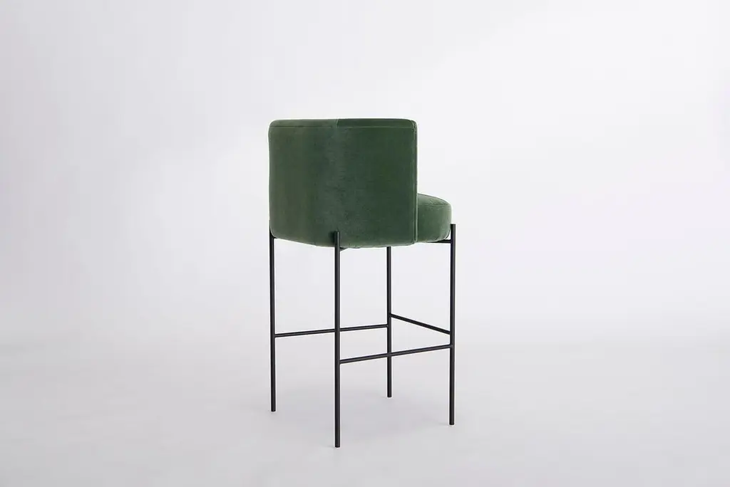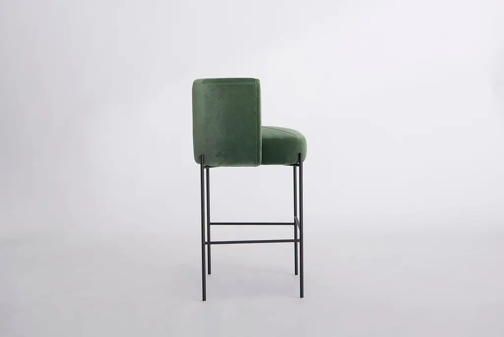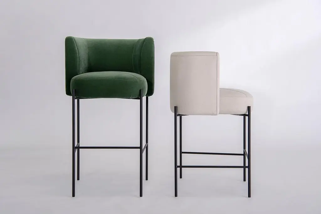 Listed price is for the Capper bar stool in powder coat (flat black or flat white) and Comfort Zone by HBF fabric.COM is also available, with a List price of $ 2,930.00.Prices exclude packing. Collection of sofas, lounge chairs, side chairs, and stools with common design language of capped tops and formed back rest system. Lounge chairs can be specified with swivel or static base, metal base, or metal base with attached side table. Side chairs are offered with fully upholstered swiveling or static base or metal base. Stools are offered in both bar and counter sizes. This collection offers a seating option with distinctive personality, various options, and cradling comfort.Solid steel bar available in flat black or flat white, polished chrome, smoked brass, and burnt copper, with upholstered top. Powder coat finishes are available in custom colors. Upholstery may be sourced COM, COL or suggested fabrics and leather. (COM requirements= 3 yard).
