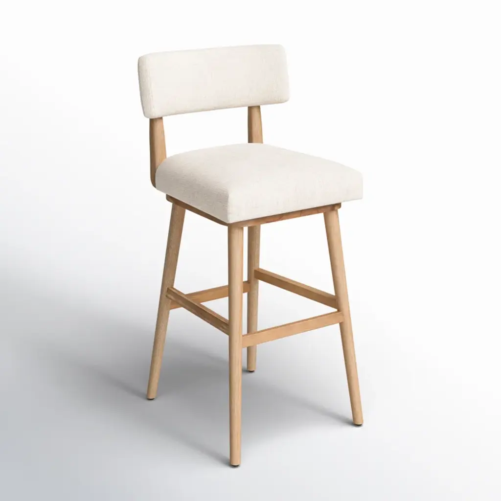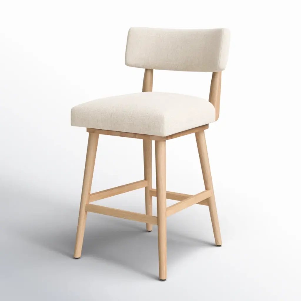 Natural solid parawood forms a curved barrel back on this everyday dining stool featuring a memory swivel. Plush cushioned seat and back are upholstered in a textural woven fabric.
