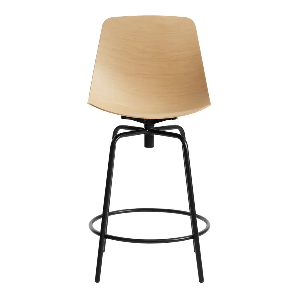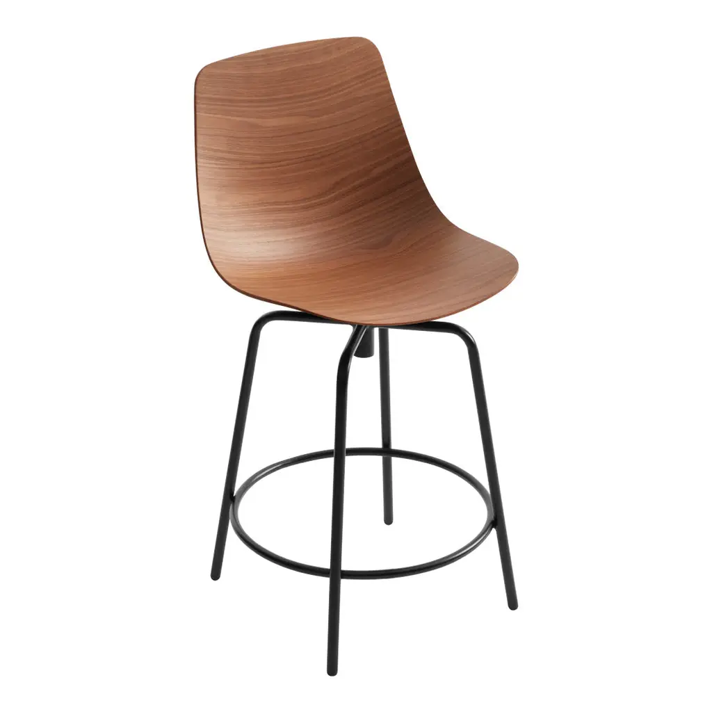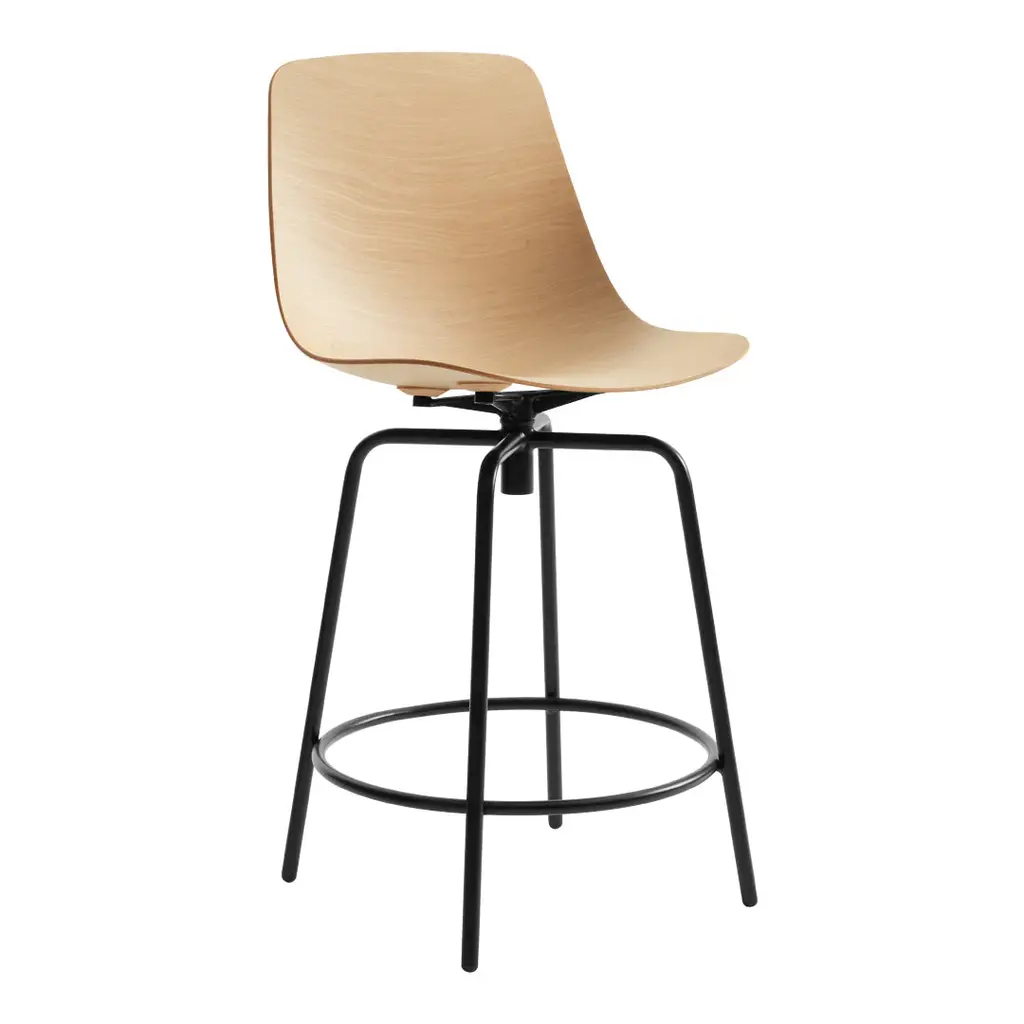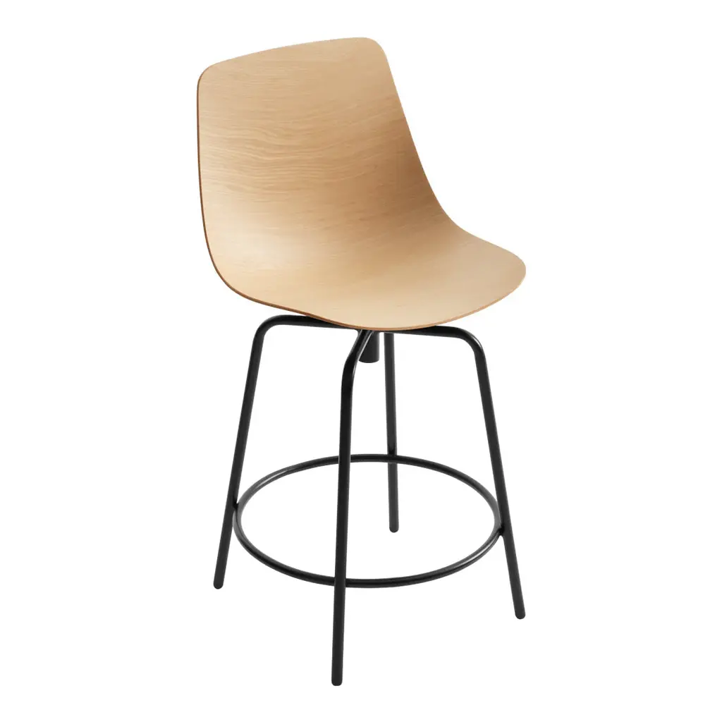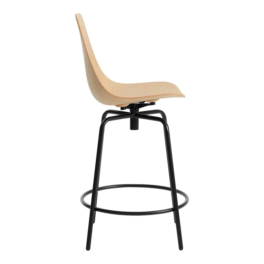 The Blu Dot Clean Cut Counter Stool brings sophisticated movement to counter-height seating through its elegant combination of organic wood forms and precision engineering. This refined stool elevates kitchen islands and counter spaces through thoughtful details that enhance both visual appeal and functional performance.The heart of the design lies in its 360-degree swivel mechanism, which introduces dynamic movement to the otherwise static form. This engineering feature allows for effortless repositioning without disrupting conversations or activities—perfect for social kitchen environments or multi-functional counter spaces. The absence of an automatic return mechanism maintains the natural, intuitive quality of the movement.Shaped from 3D bent plywood with wood veneers, the seat shell creates an organic counterpoint to the precision-engineered steel base. The gentle curves and ergonomic contours offer remarkable sitting comfort despite the stool's minimal visual profile. This sculptural seat showcases Blu Dot's talent for creating forms that serve both aesthetic and functional purposes without unnecessary embellishment.The Clean Cut Counter Stool can be enhanced with optional leather or felt seat pads that introduce textural contrast and additional comfort while maintaining the design's essential simplicity. Protective glides safeguard floor surfaces, reflecting the thoughtful consideration of practical details throughout the design.BIFMA rated for safety and sustainability, the Clean Cut Counter Stool - Swivel Base embodies Blu Dot's design philosophy perfectly—creating furniture that enhances everyday experiences through a sophisticated balance of material integrity, functional innovation, and visual refinement. This isn't merely seating; it's an architectural element that elevates kitchen and counter environments through its quiet confidence and enduring quality.