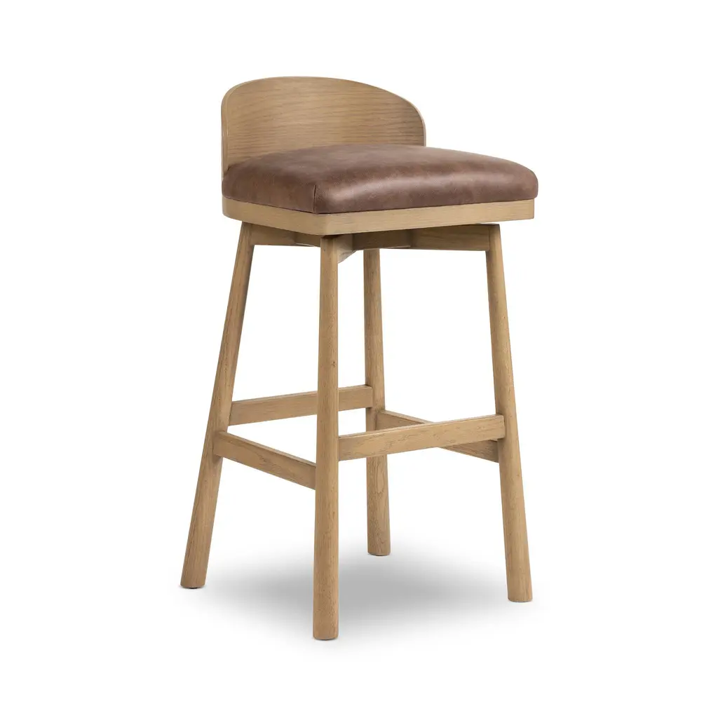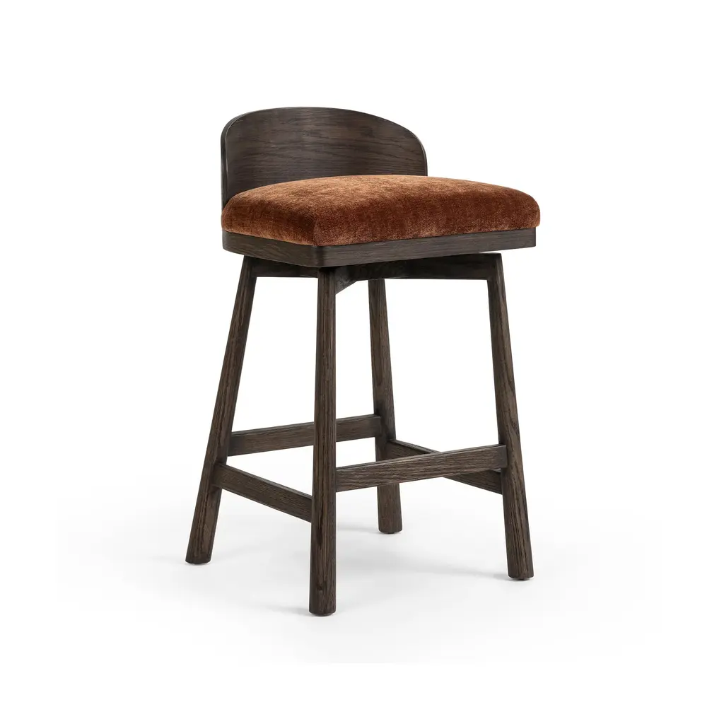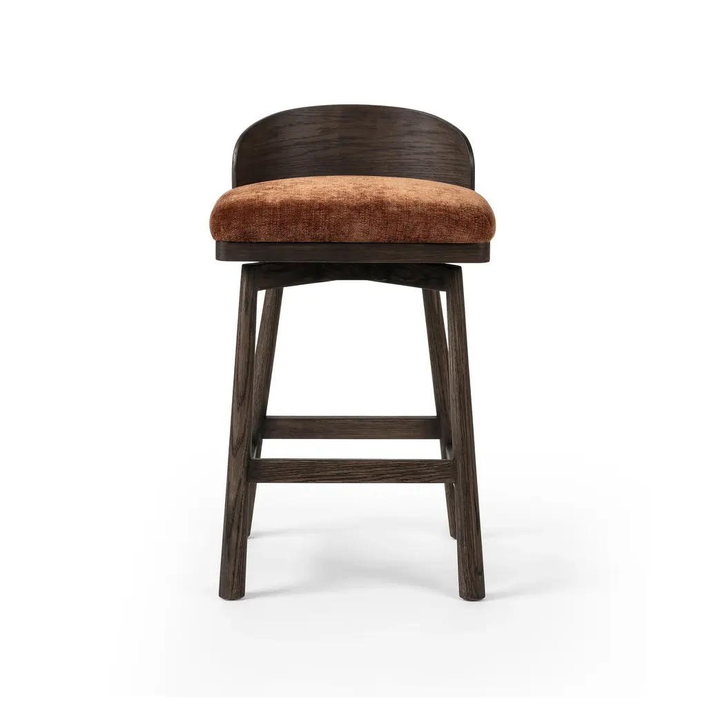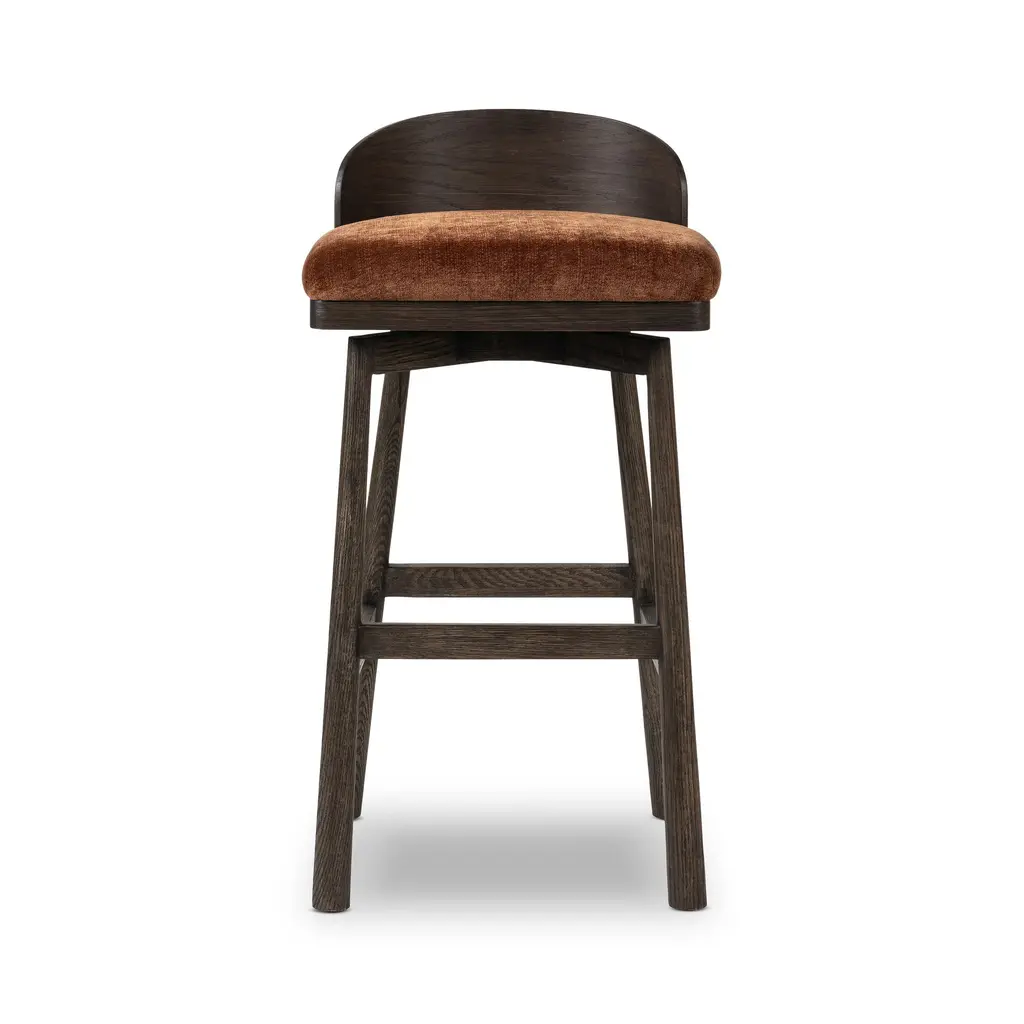 Elevate your bar or counter with the Cloris Swivel Stool from Four Hands. Its vintage-inspired design features a low, molded back and comfortable upholstered seat. The dark or blonde-finished oak adds a touch of sophistication, while the memory swivel keeps the curved wood back aligned. Enjoy effortless style and comfort with every turn. Highlights