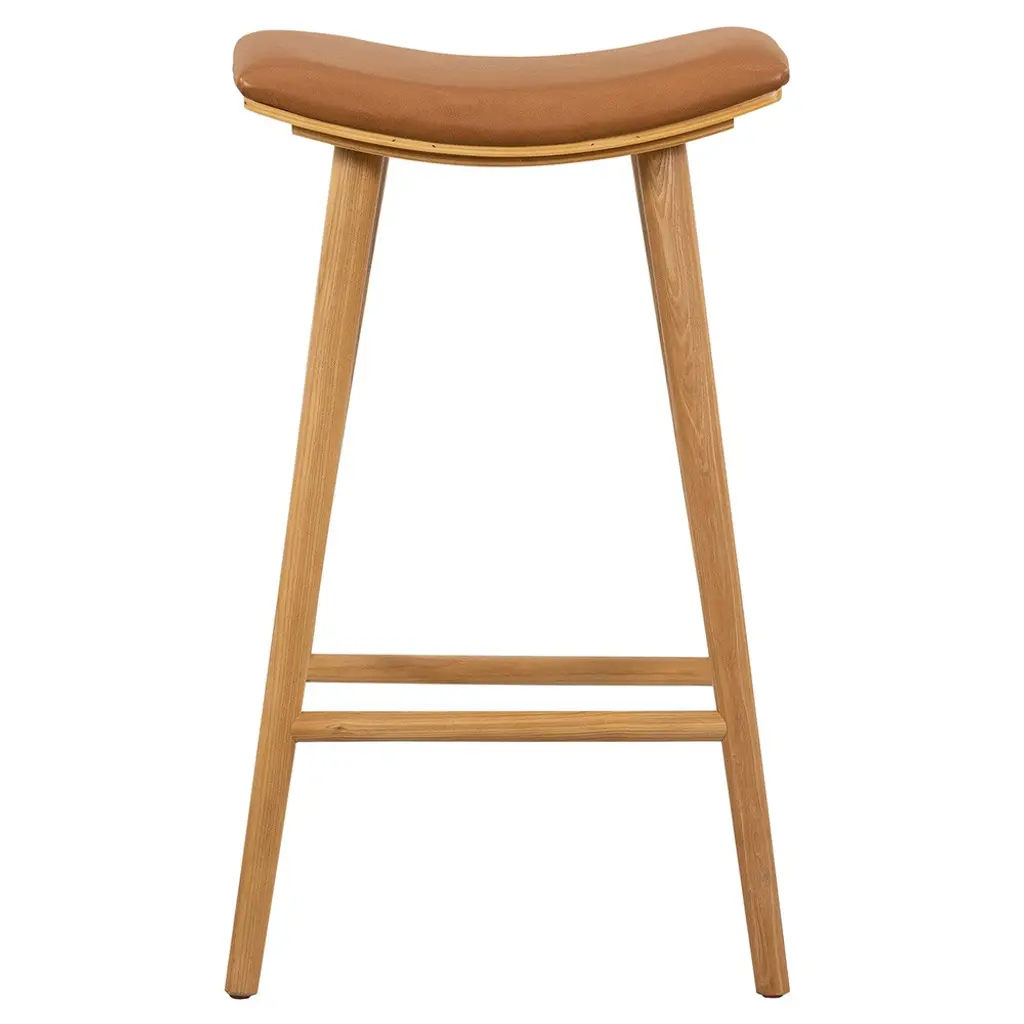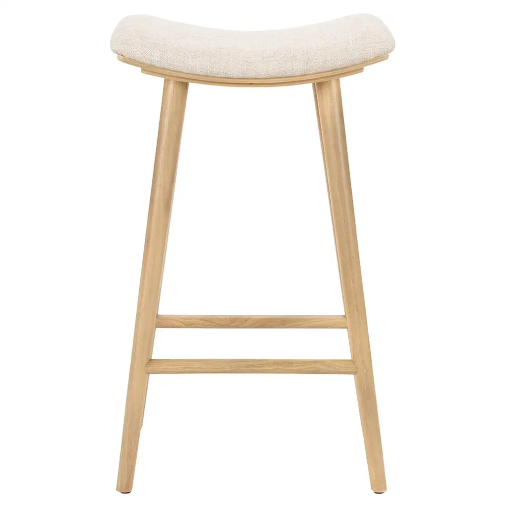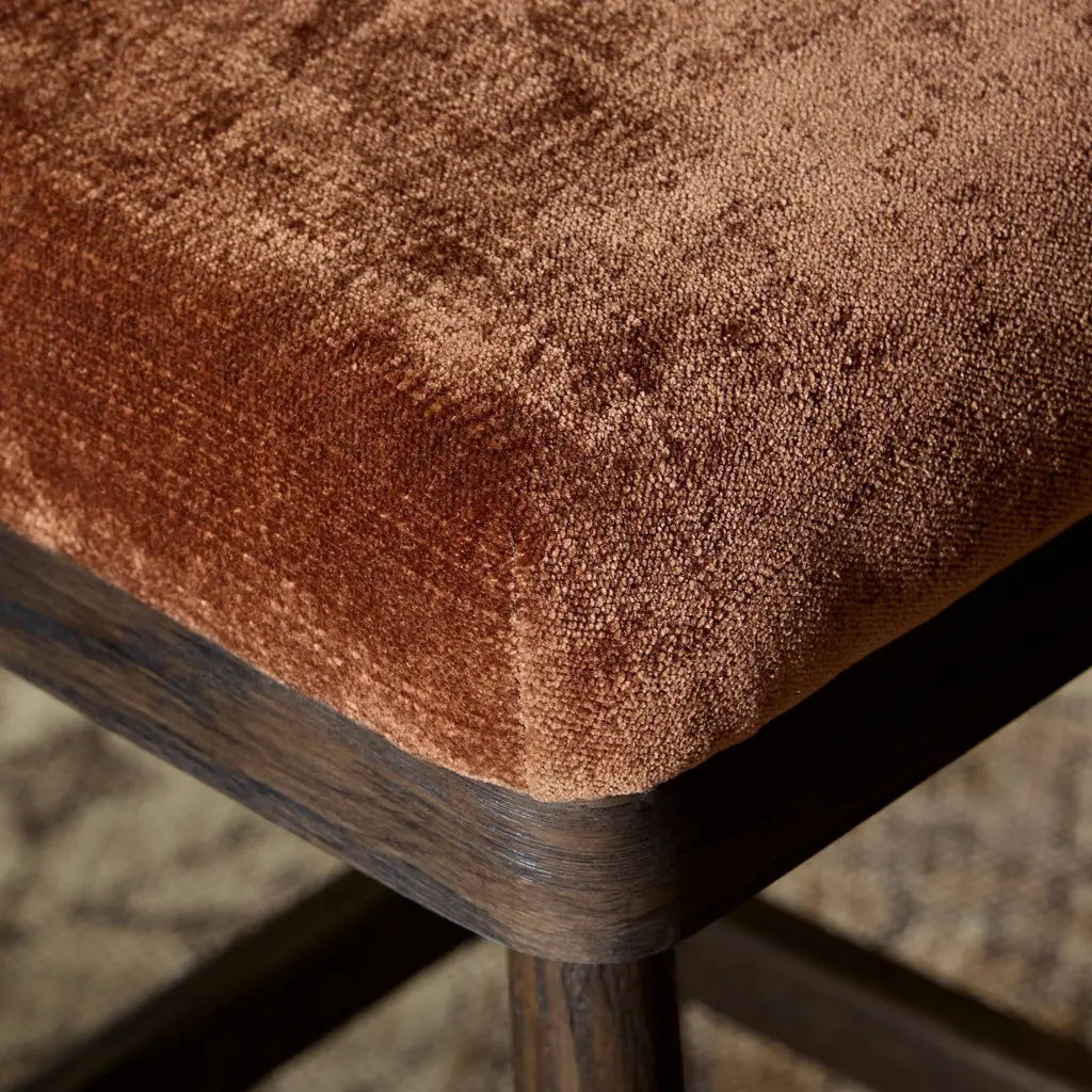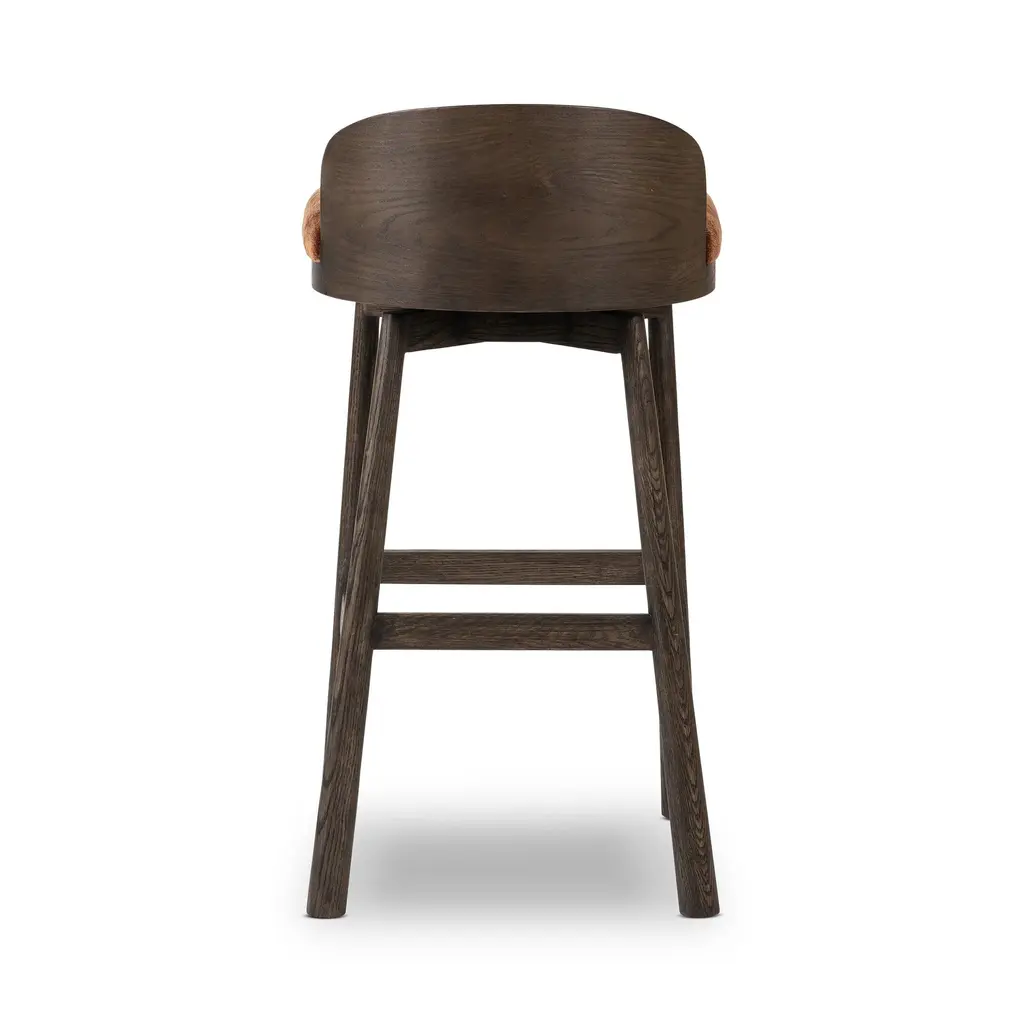Elevate your bar or counter with the Cloris Swivel Stool from Four Hands. Its vintage-inspired design features a low, molded back and comfortable upholstered seat. The dark or blonde-finished oak adds a touch of sophistication, while the memory swivel keeps the curved wood back aligned. Enjoy effortless style and comfort with every turn. Highlights