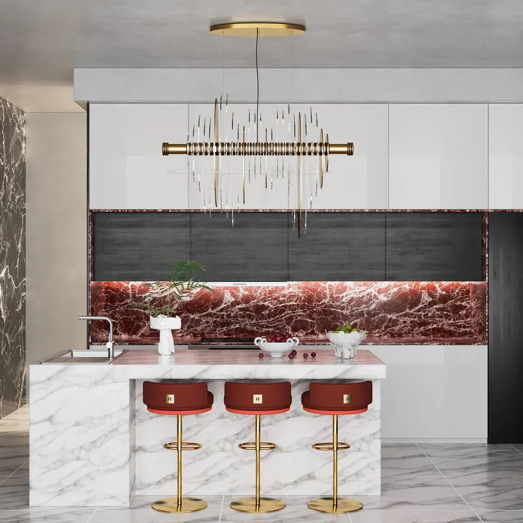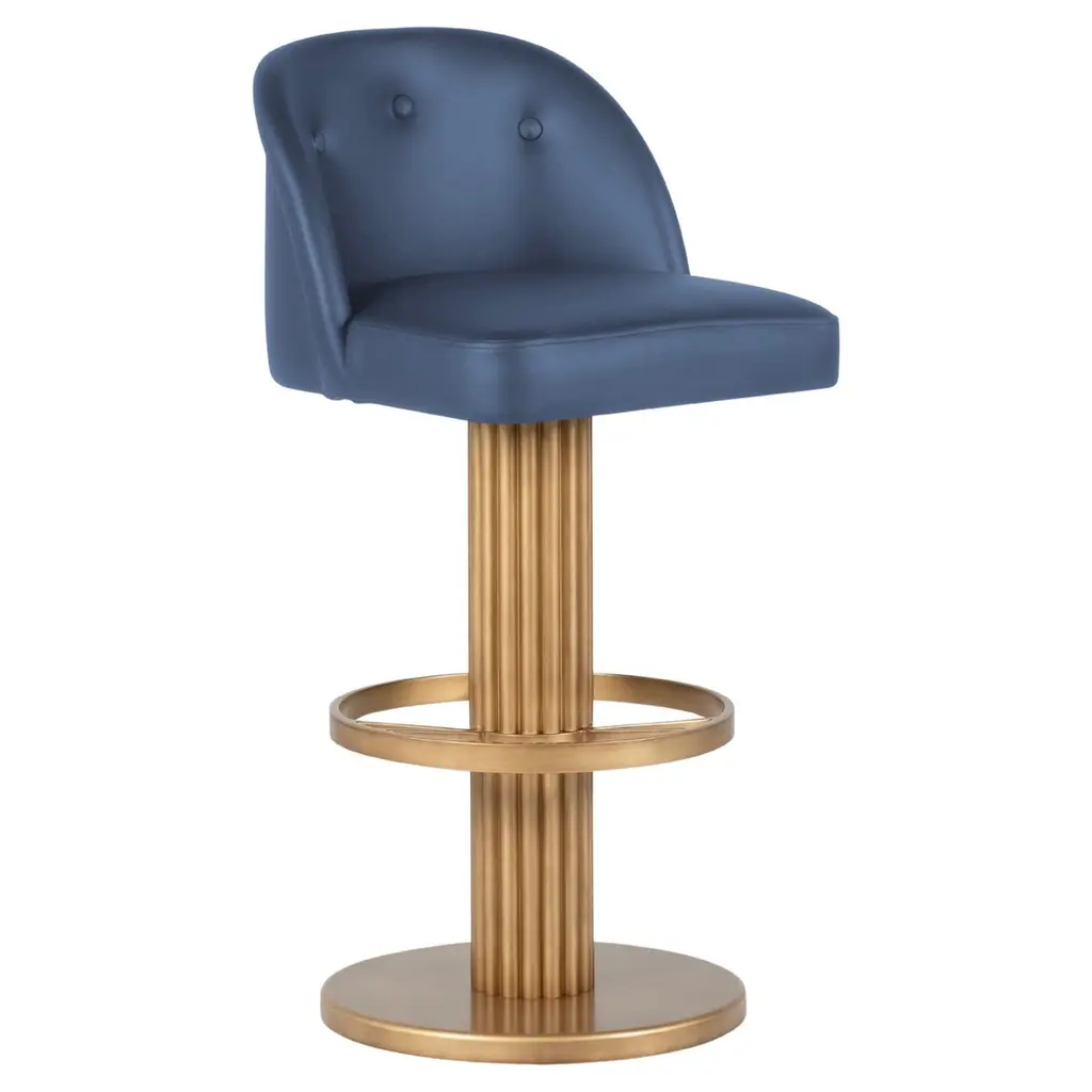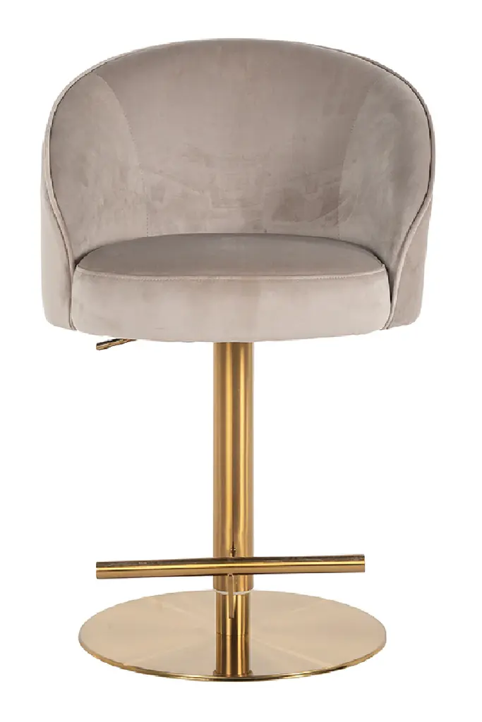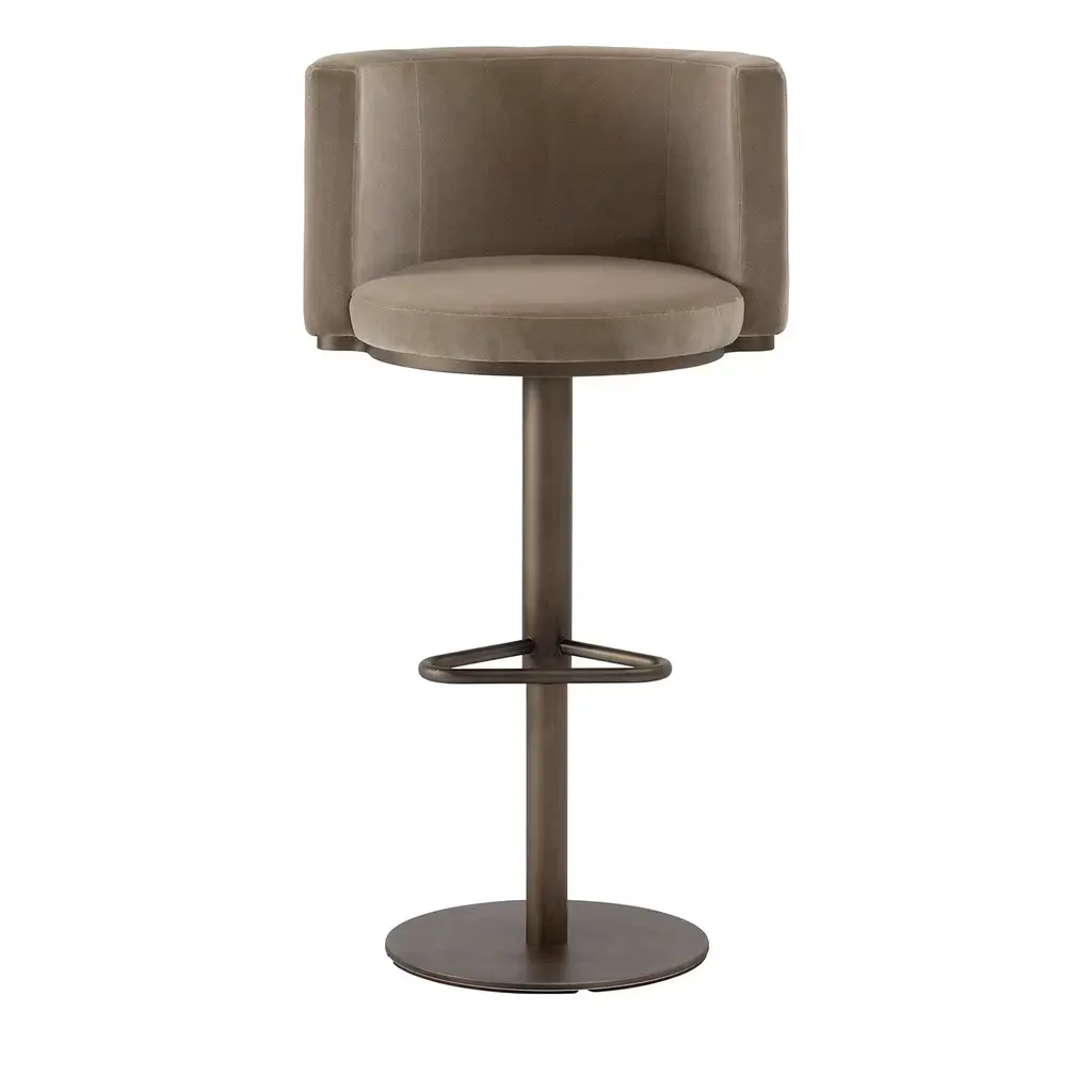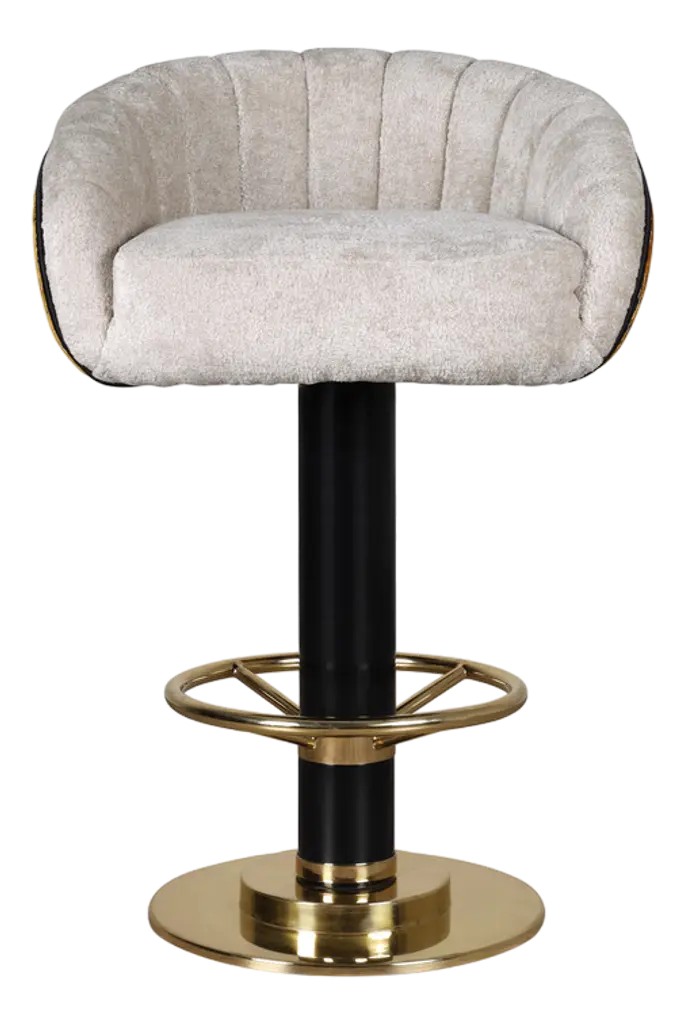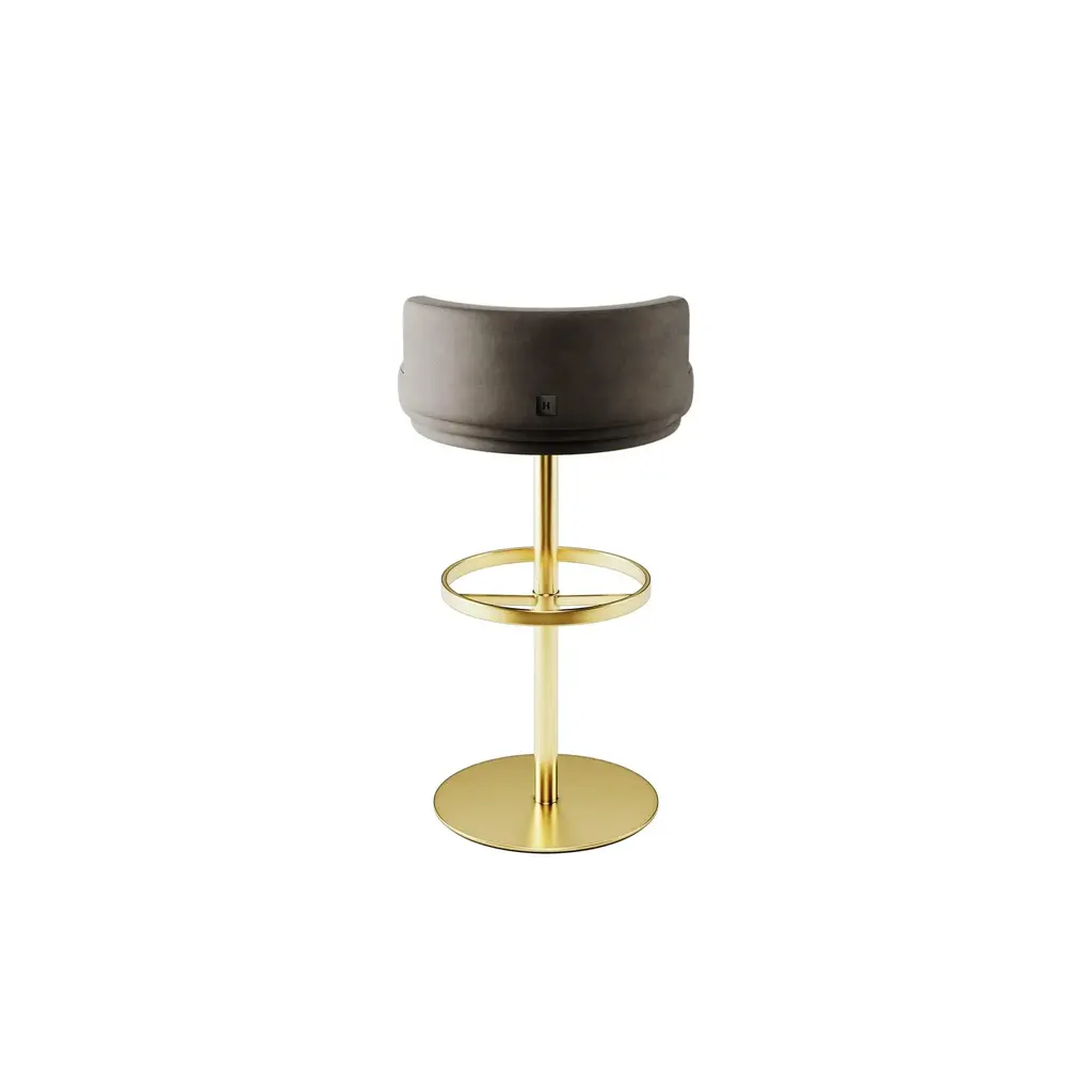 Cluedo Counter Stool is a Memphis design style chair. A swivel counter stool that brings comfort and modernity into a luxury hospitality project. This modern chair enlivens a contemporary interior design project. MATERIALS: Upholstered in Velvet; Structure in Gold Polished Stainless Steel.