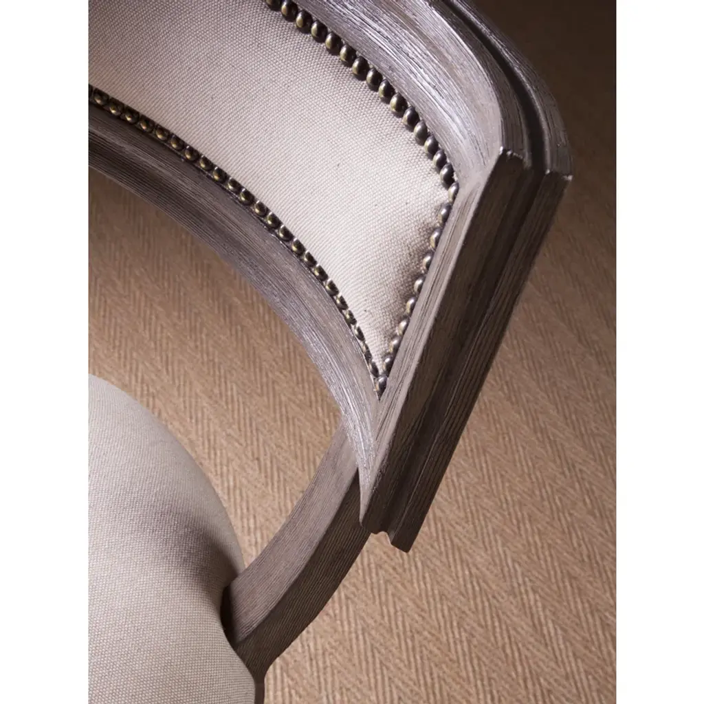 Updated traditional design crafted from mahogany veneers, bleached mahogany, and select hardwoods, a warm gray tone with hand wire brushing. The bar stool upholstered back splat and memory swivel seat a linen and cotton blend with a soft hand. The decorative nailhead trim and kick plate are finished in a warm metallic with a hint of copper.