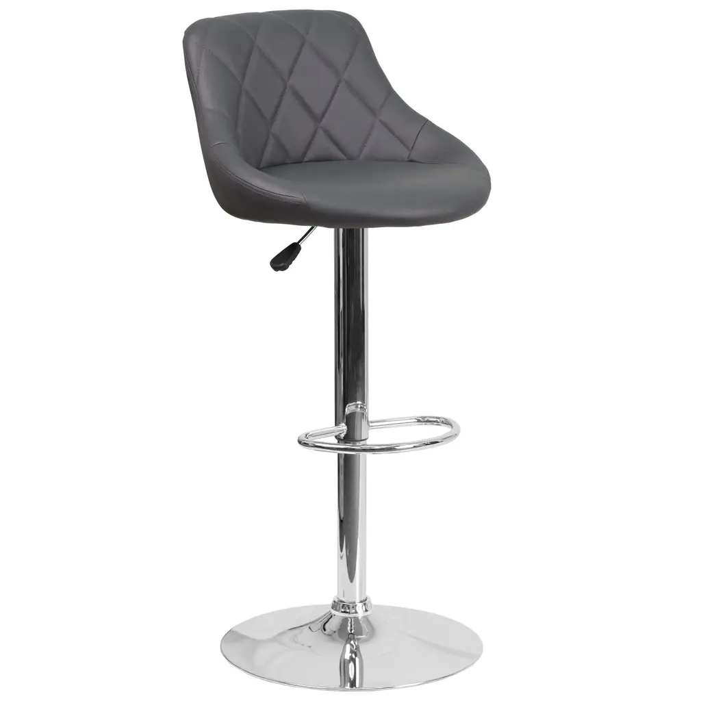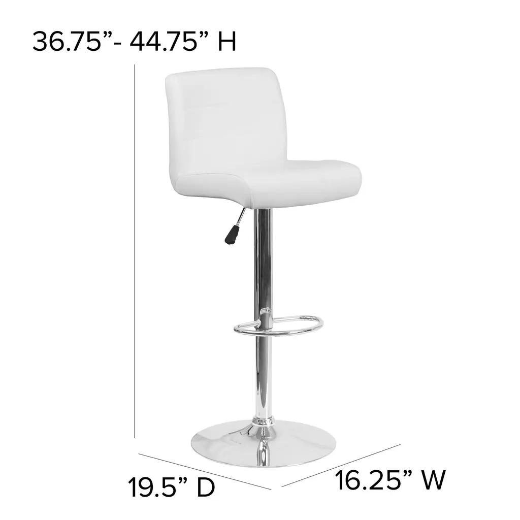 Come in and sit a while in this splendid adjustable height barstool with exposed embellished stitching on the back. This stylish stool provides added comfort with the waterfall front seat, which is designed to remove pressure from the lower legs and improves circulation. The easy to clean upholstery is an added bonus when stool is used regularly. The height adjustable swivel seat adjusts from counter to bar height with the handle located below the seat. The chrome footrest supports your feet while also providing a contemporary chic design. To help protect your floors, the base features an embedded plastic ring.