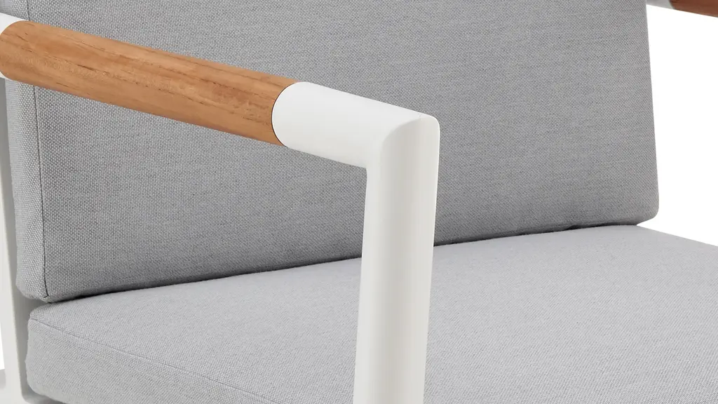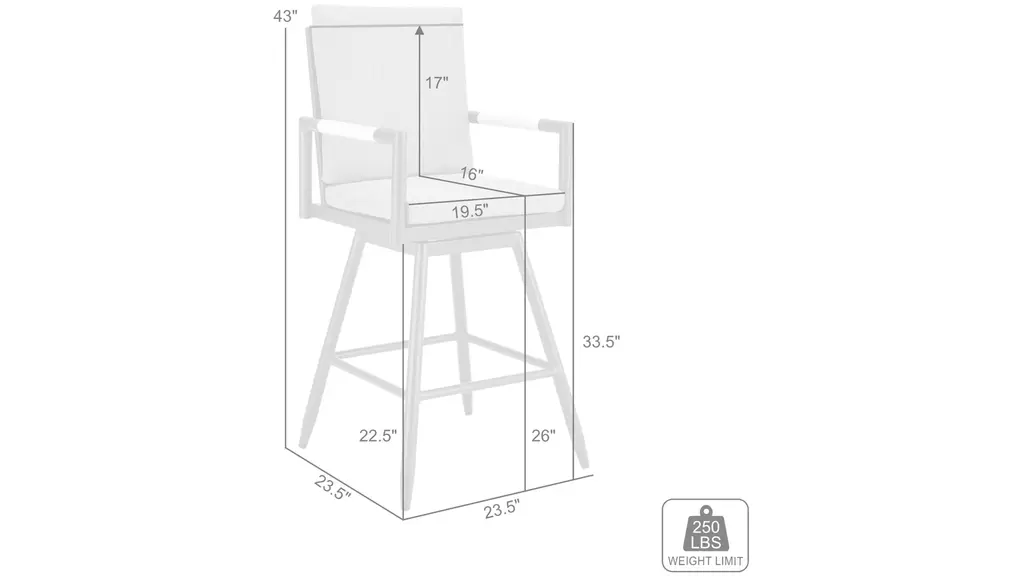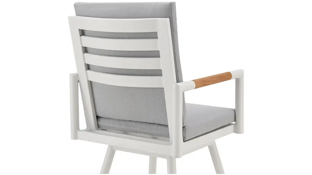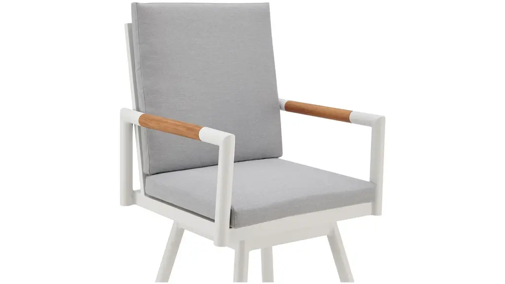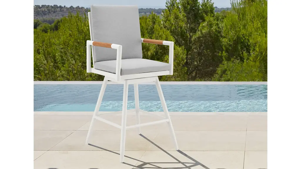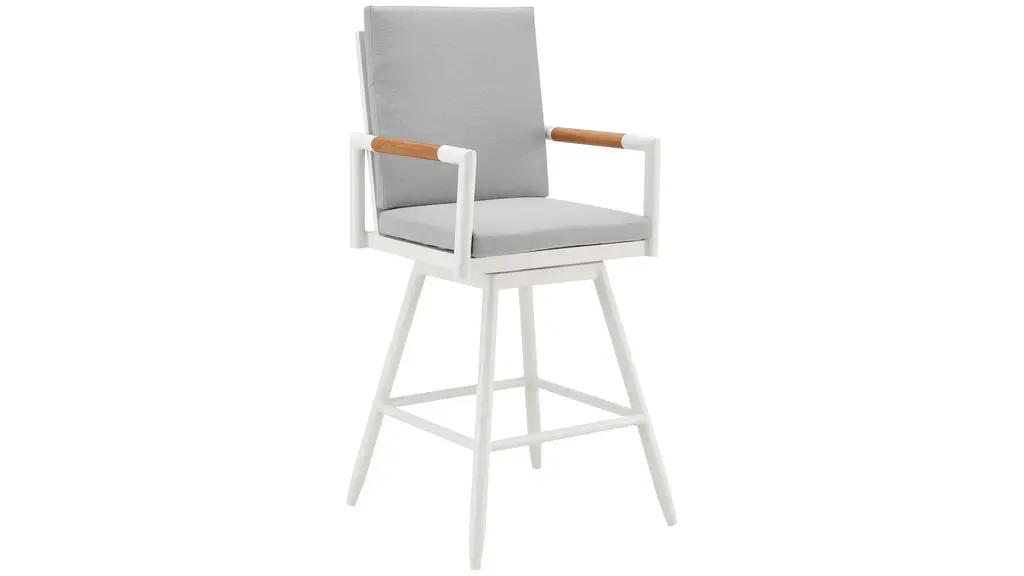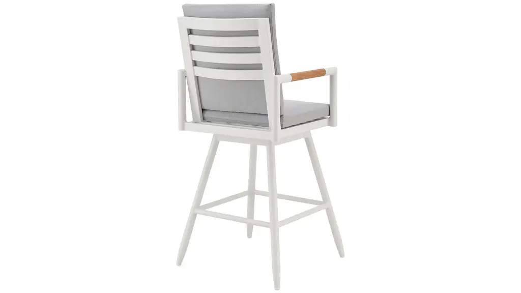 Introducing the Crown 43" Outdoor Swivel Counter Stool - an epitome of modern elegance and outdoor comfort meticulously designed to elevate your lounging experience. This versatile stool seamlessly integrates the contemporary allure of aluminum with the tactile sophistication of wood detailing and the plush comfort of removable cushions, creating a luxurious and enduring piece of outdoor furniture. Crafted with precision, this Patio Swivel Stool features a robust aluminum frame, ensuring durability and a sleek aesthetic that effortlessly complements various outdoor settings. The water-resistant and UV-resistant features of the Crown Swivel Stool make it a resilient choice for your outdoor space. Whether bathed in sunlight or facing unexpected rain, this stool stands as a steadfast and stylish seating solution for your patio or outdoor bar area. The incorporation of wood detailing adds a visually appealing contrast with the aluminum frame. Paired with removable cushions, the Crown Swivel Stool invites you to relax in both style and comfort, providing a sumptuous seating option for your outdoor gatherings. Transform your outdoor space with the Crown Stool, where form and function converge for an unparalleled outdoor seating experience.