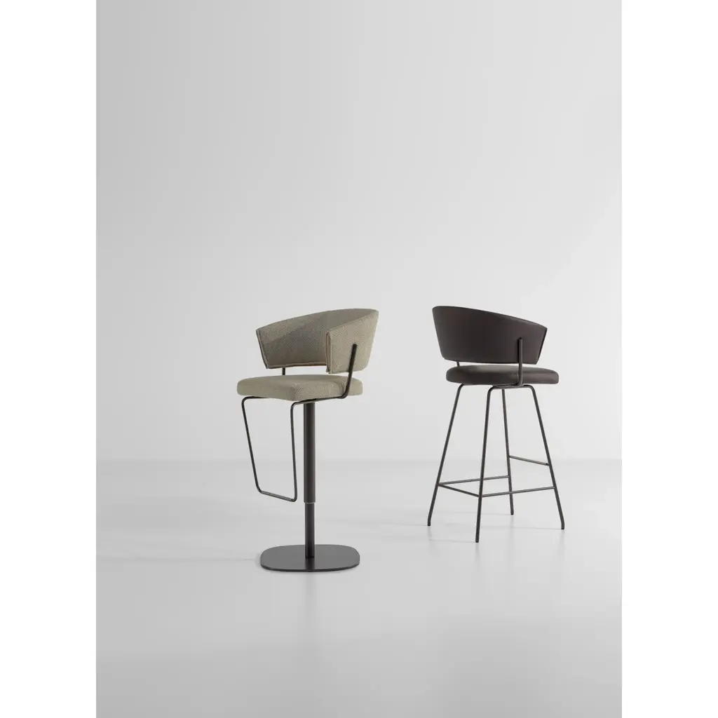 The Bahia too stool with backrest is the result of the combination of curved shapes and simple tubular metal elements, giving as a result an extremely balanced aesthetic. Available with swivel or fixed base, Bahia too is the ideal stool for furnishing both residential and contract spaces. The curved backrest allows free support of the arms and generously wraps the back. Bahia too is covered in fabric, eco-leather or leather.
