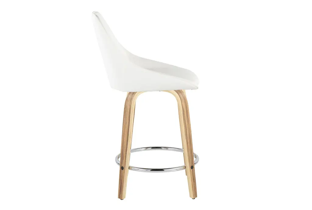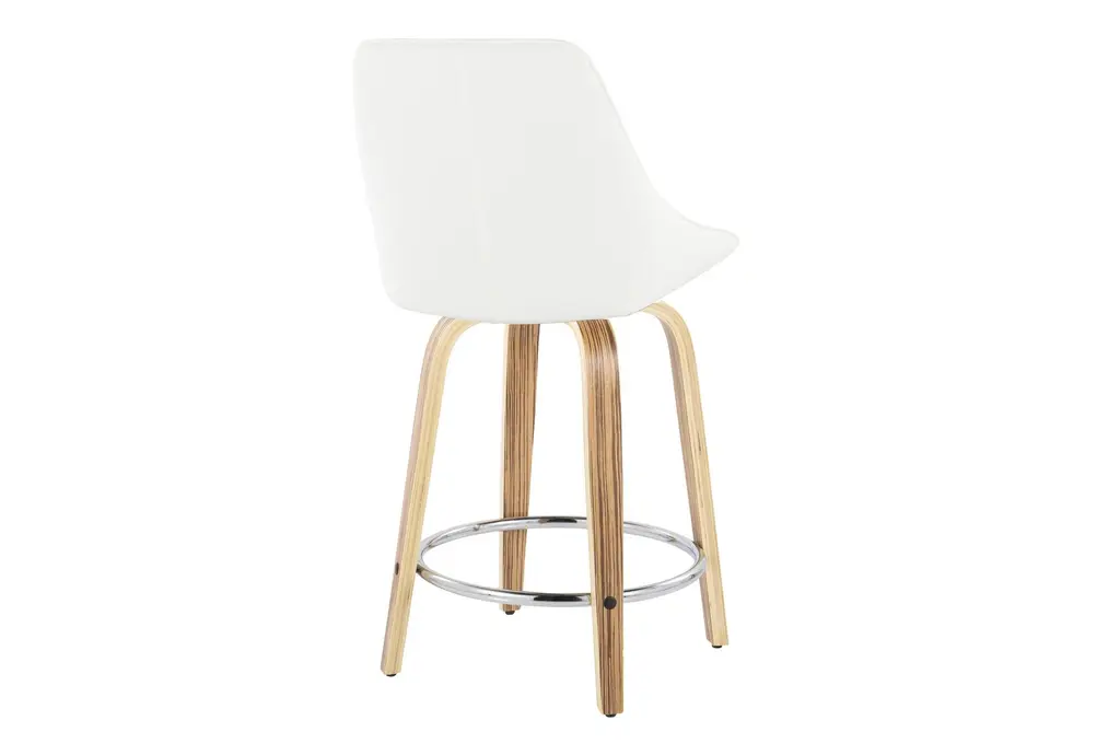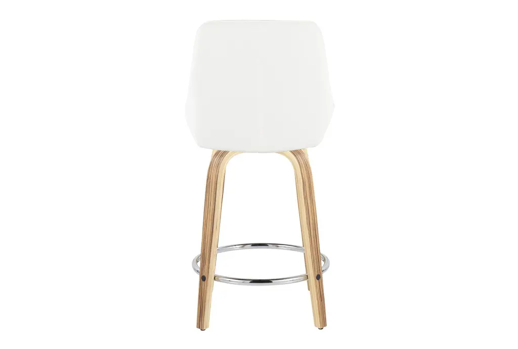 Deena 24" Height Counter Height Stool With Swivel In Zebra Wood And White Faux Leather With Round Chrome Metal Footrest Set Of 2