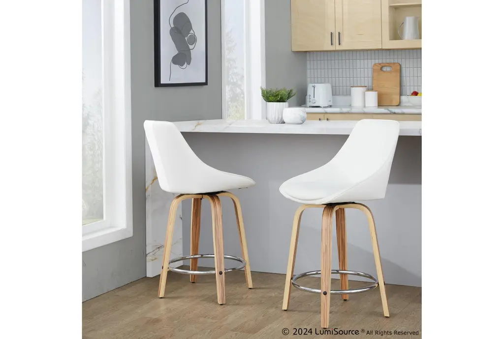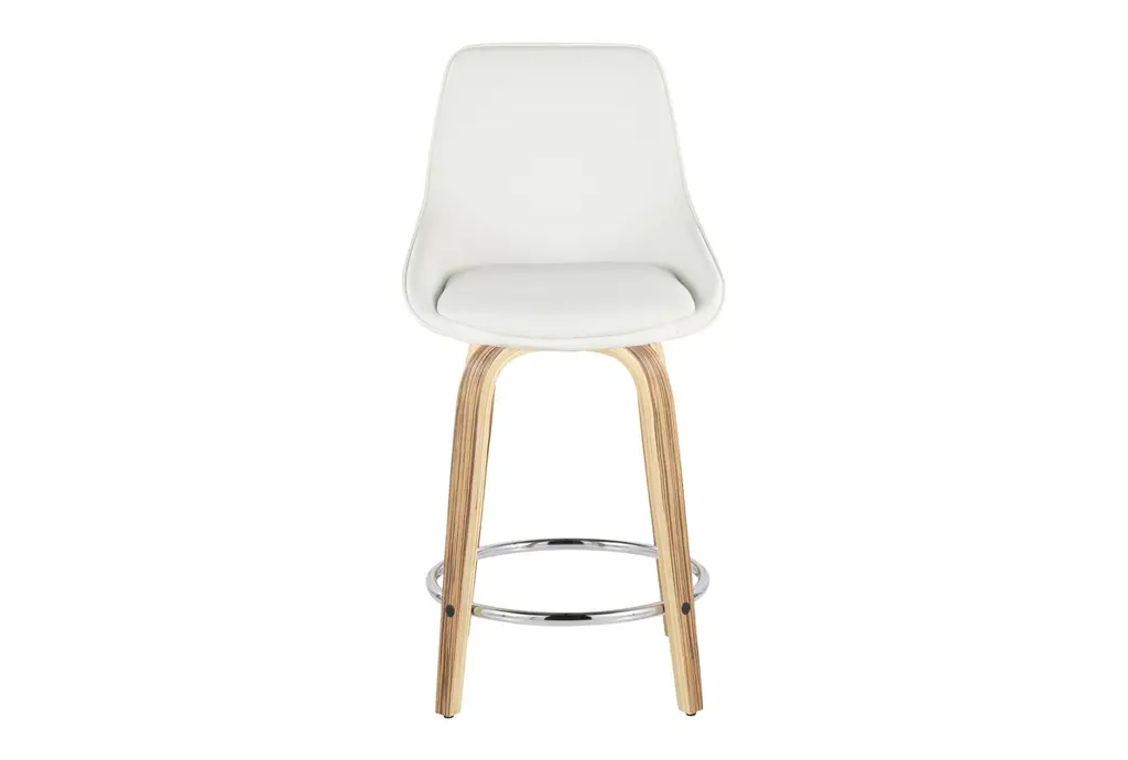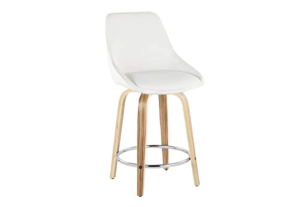 Add contemporary style to your dining room with the Deena 24" Counter Height Stool. These stools feature a swivel design, zebra wood legs, and white faux leather upholstery for a modern touch. Perfect for your kitchen or dining space, they offer both comfort and functionality.
