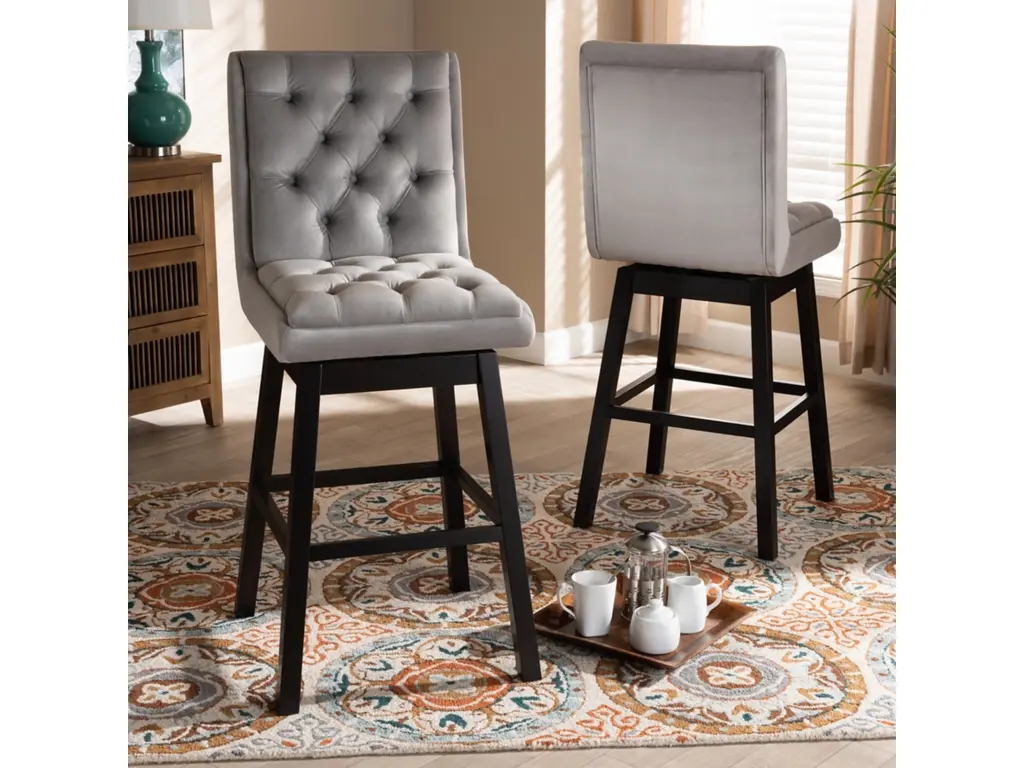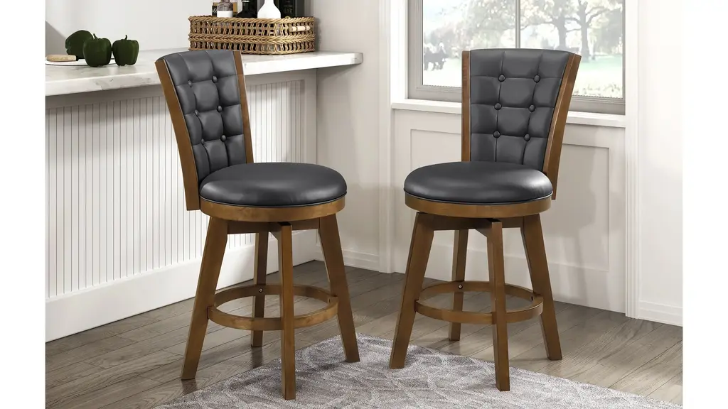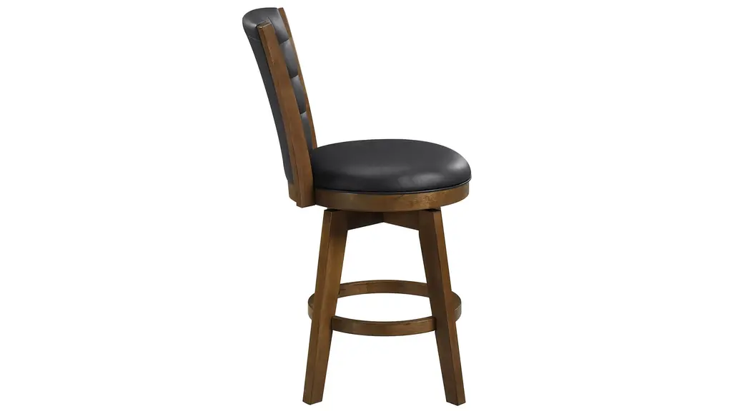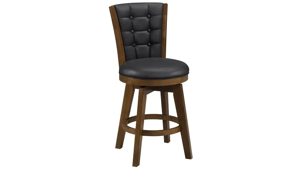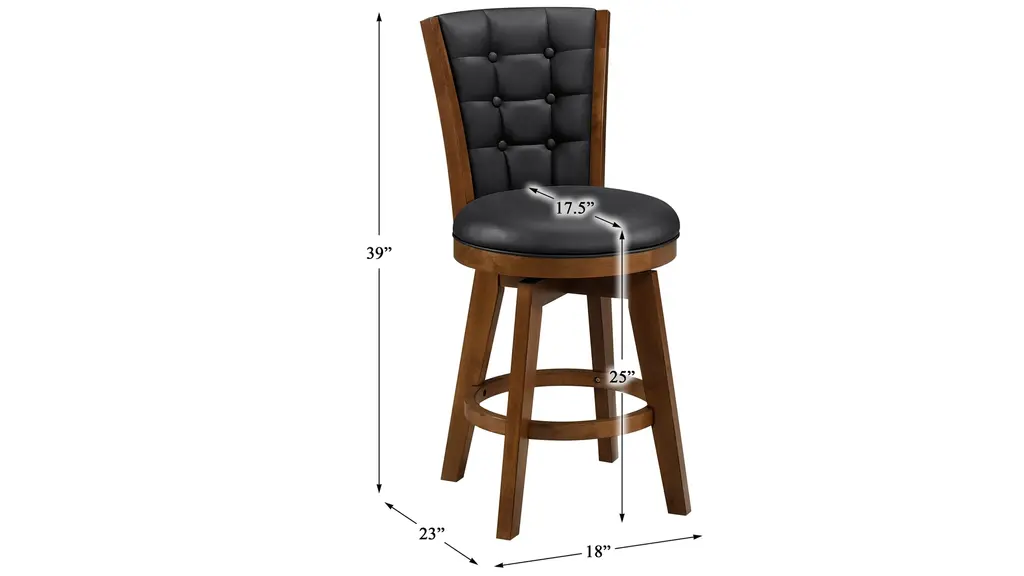 The Donovan Counter Height Swivel Stool is transitional style makes for a versatile seating option for your home. The 360-degree swivel seat allows you to fully engage with your surroundings. Meeting the needs of your tabletop height, the 24-inch counter-height chair allows for perfect placement within your casual dining space. The wood frame of the chair is finished in chestnut while the seat and button-tufted back are covered in black faux leather.