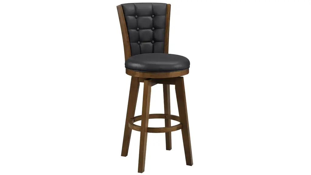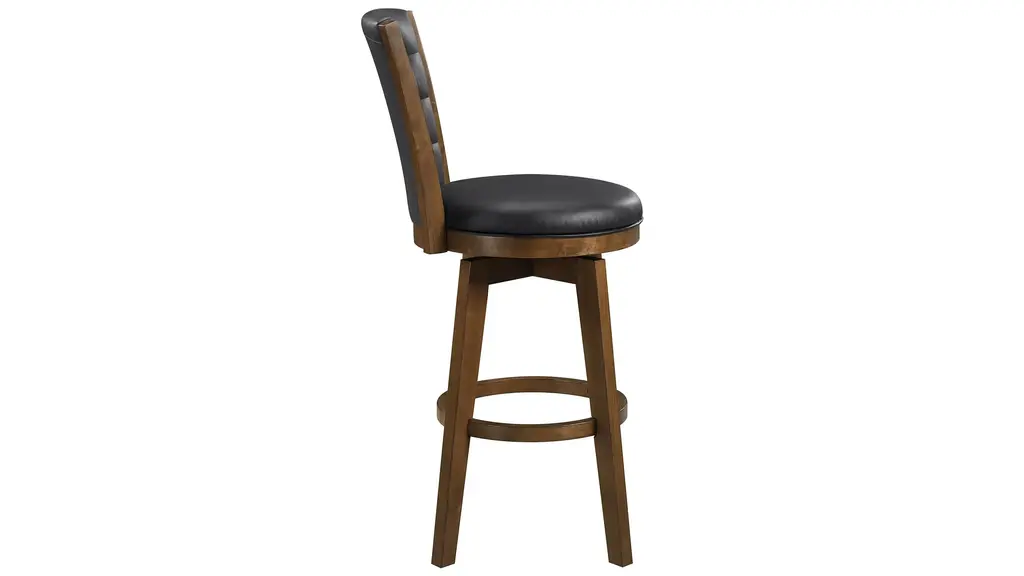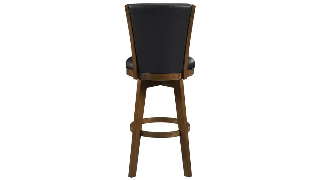 The Donovan Pub Height Swivel Stool is transitional style makes for a versatile seating option for your home. The 360-degree swivel seat allows you to fully engage with your surroundings. Meeting the needs of your tabletop height, the 29-inch bar-height chair allows for perfect placement within your casual dining space. The wood frame of the chair is finished in chestnut while the seat and button-tufted back are covered in black faux leather.