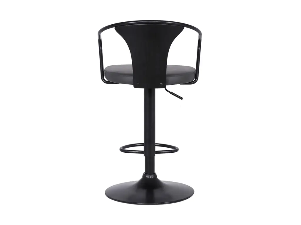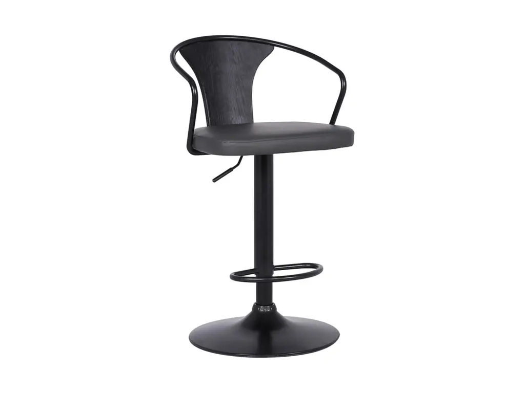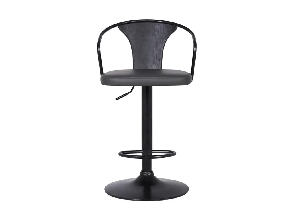 The Eagle is an adjustable swivel bar stool with a minimalist design that goes easily with almost any room motif. Featuring sloping arms and medium back, the metal frame has a black powdercoat finish complemented by a black brushed wood seat back and a gray faux leather seat with foam padding for comfort and style. The versatile bar stool has 360-degree swivel functionality and a footrest for added leg support. The Eagle adjusts from counter height to bar height.