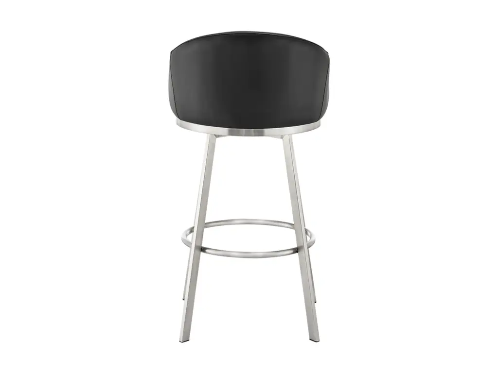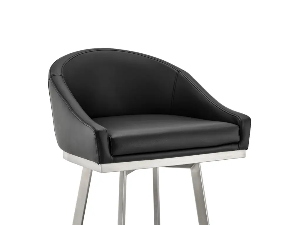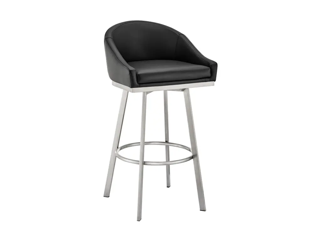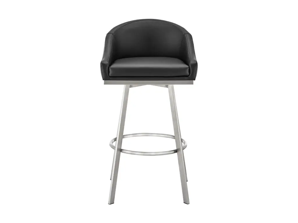 Create an inviting and comfortable setting with the Eleanor counter height bar stool in faux leather and metal by Armen Living. This bar stool offers a perfect blend of style and comfort, featuring a barrel-style seat and a sturdy metal base. It is upholstered in durable faux leather, known for its resistance to cracking, staining, fading, and UV-resistance. This modern stool is versatile and ideal for use at your kitchen island, pub table, bar table, or adjustable desk. Universally suitable for various settings in your home, it offers both style and convenience. The 360-degree swivel function ensures maximum mobility, and the smooth-glide swivel allows you to change directions with ease, making it your new favorite seat. The Eleanor swivel chair seamlessly incorporates into any home decor and is available in your choice of counter or bar seat height.
