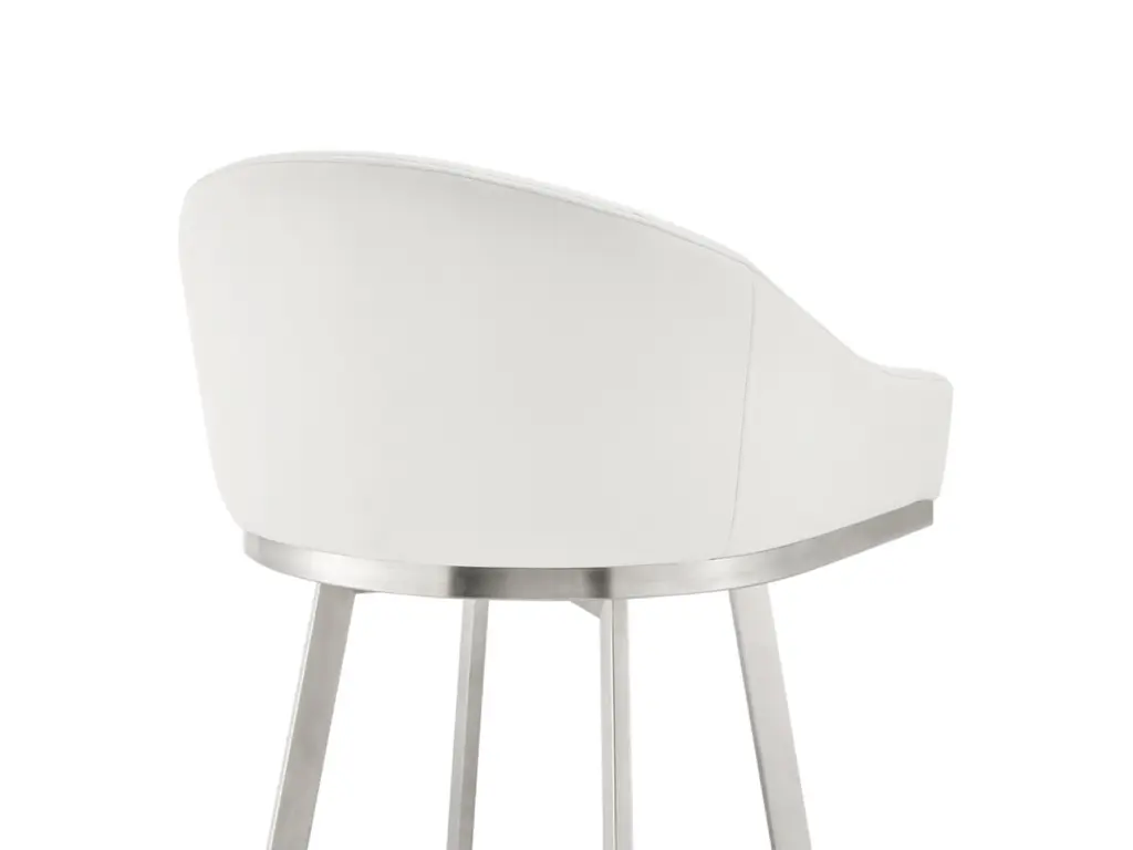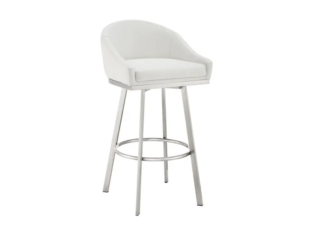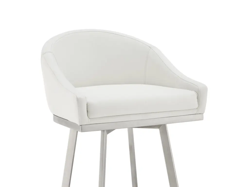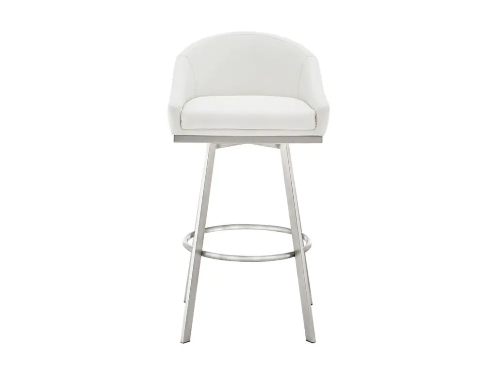 Create an inviting and comfortable setting with the Eleanor counter height bar stool in faux leather and metal by Armen Living. This bar stool offers a perfect blend of style and comfort, featuring a barrel-style seat and a sturdy metal base. It is upholstered in durable faux leather, known for its resistance to cracking, staining, fading, and UV resistance. This modern stool is versatile and ideal for use at your kitchen island, pub table, bar table, or adjustable desk. Universally suitable for various settings in your home, it offers both style and convenience. The 360-degree swivel function ensures maximum mobility, and the smooth-glide swivel allows you to change directions with ease, making it your new favorite seat. The Eleanor swivel chair seamlessly incorporates into any home decor and is available in your choice of counter or bar seat height.