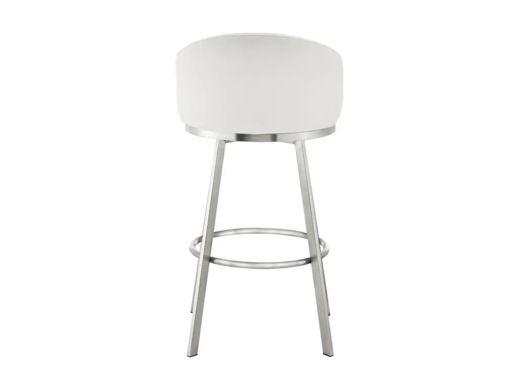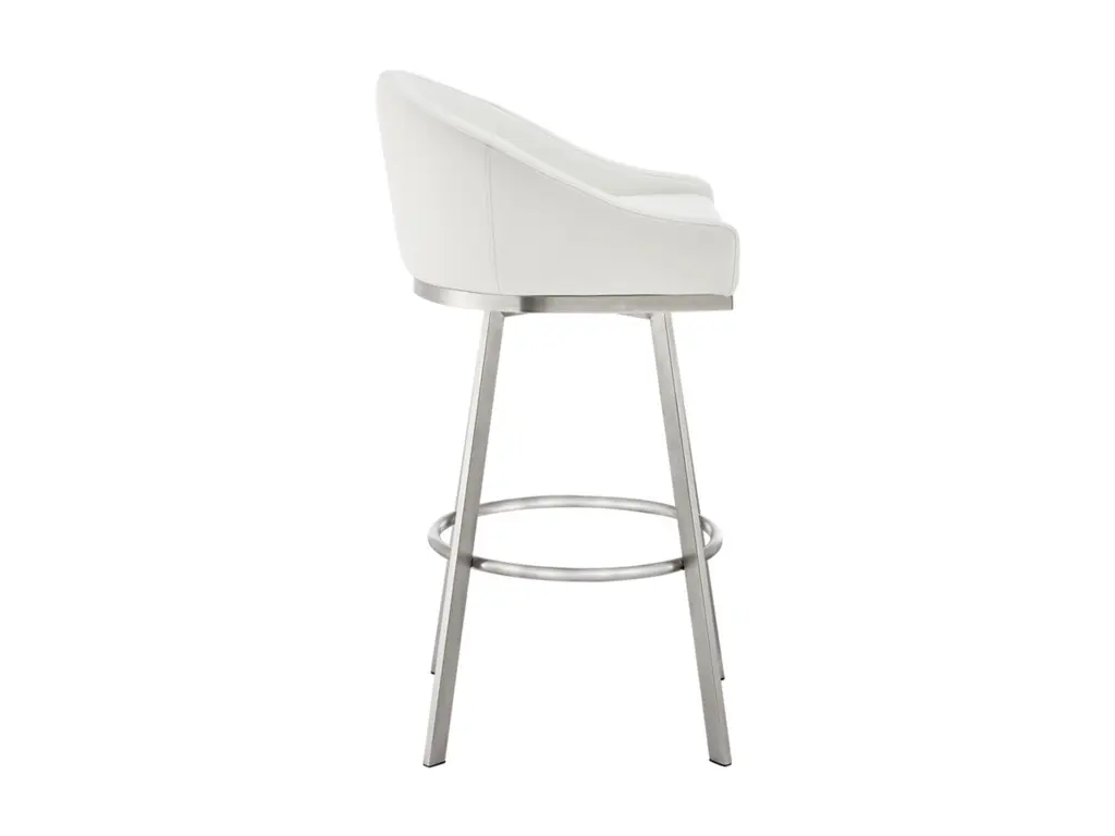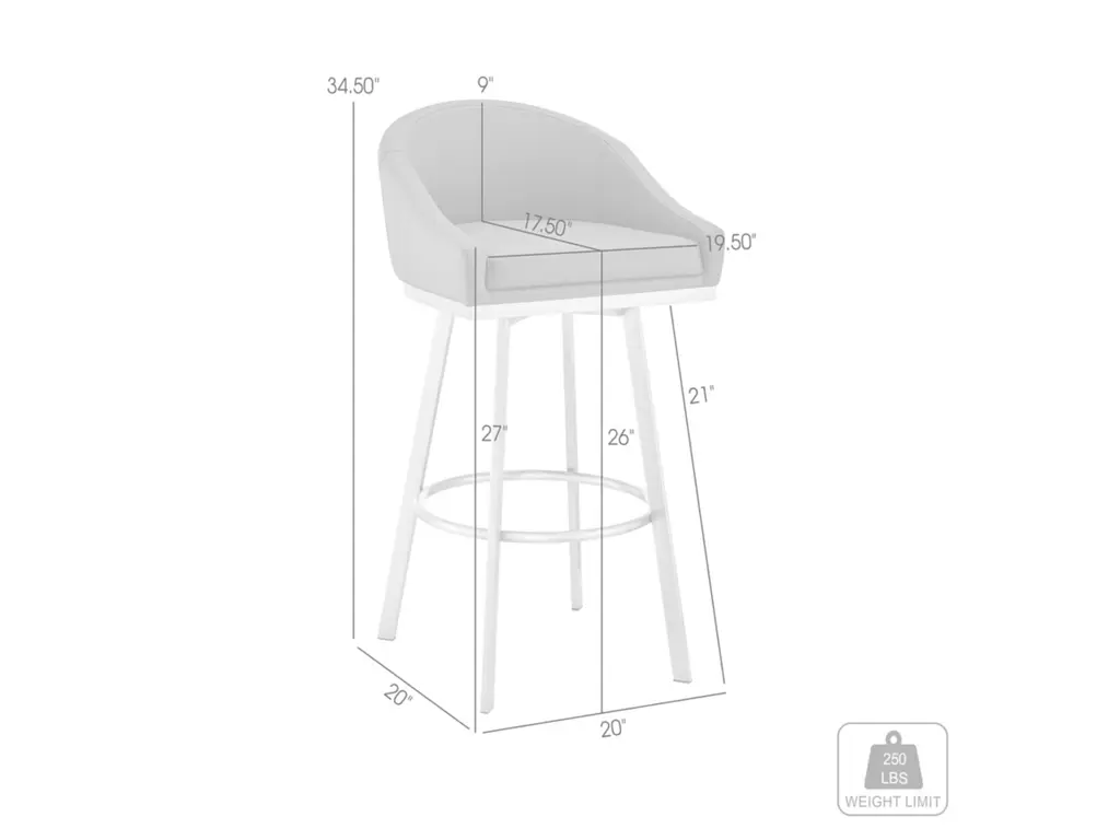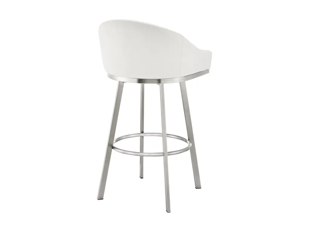Create an inviting and comfortable setting with the Eleanor counter height bar stool in faux leather and metal by Armen Living. This bar stool offers a perfect blend of style and comfort, featuring a barrel-style seat and a sturdy metal base. It is upholstered in durable faux leather, known for its resistance to cracking, staining, fading, and UV resistance. This modern stool is versatile and ideal for use at your kitchen island, pub table, bar table, or adjustable desk. Universally suitable for various settings in your home, it offers both style and convenience. The 360-degree swivel function ensures maximum mobility, and the smooth-glide swivel allows you to change directions with ease, making it your new favorite seat. The Eleanor swivel chair seamlessly incorporates into any home decor and is available in your choice of counter or bar seat height.