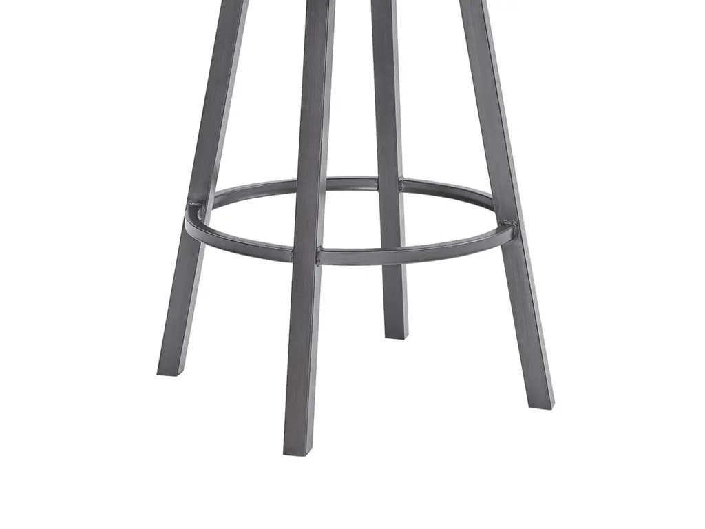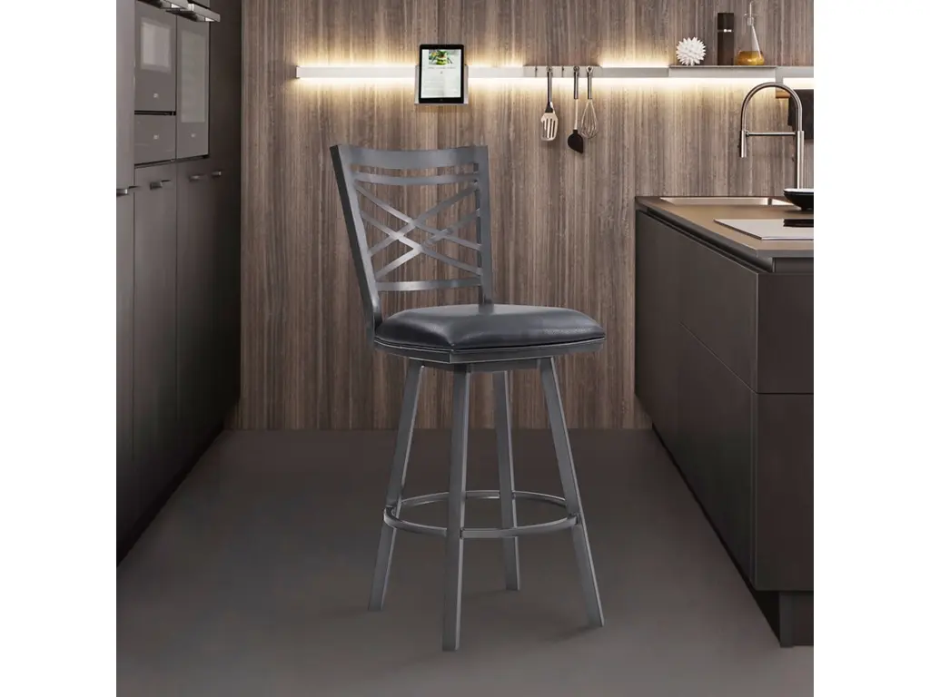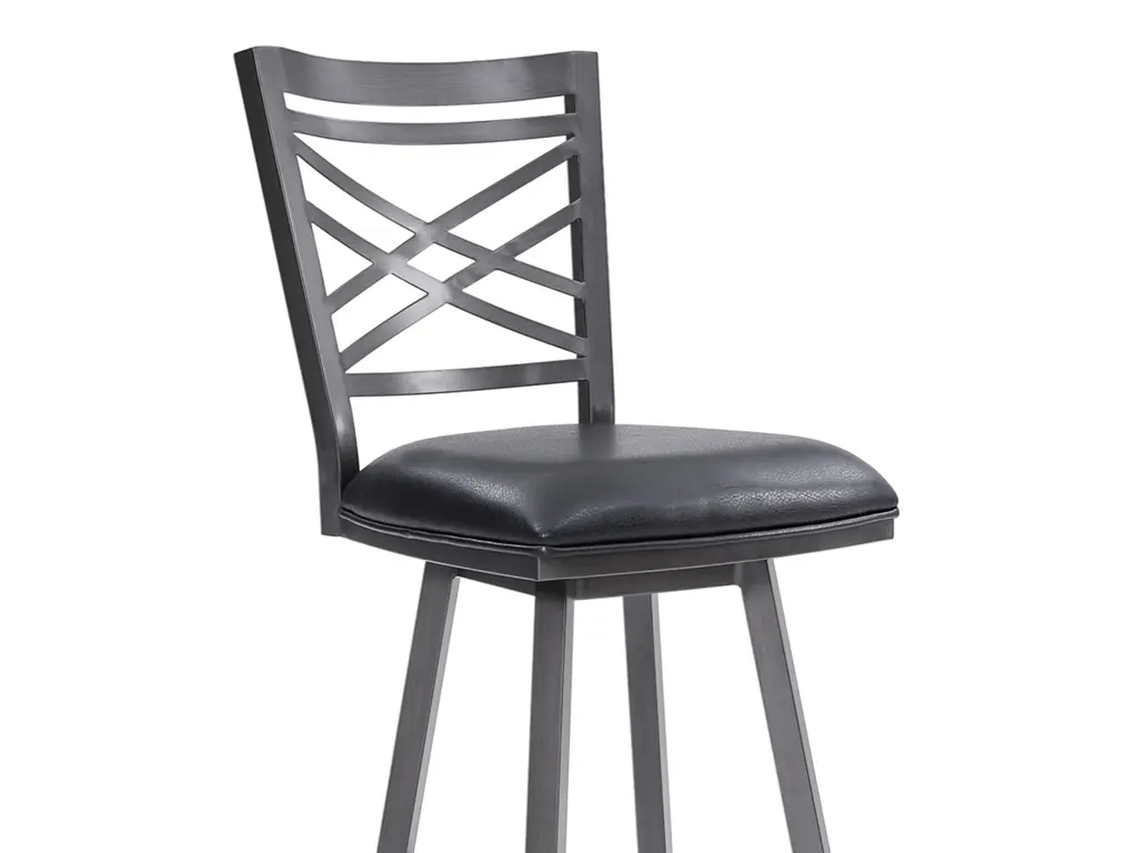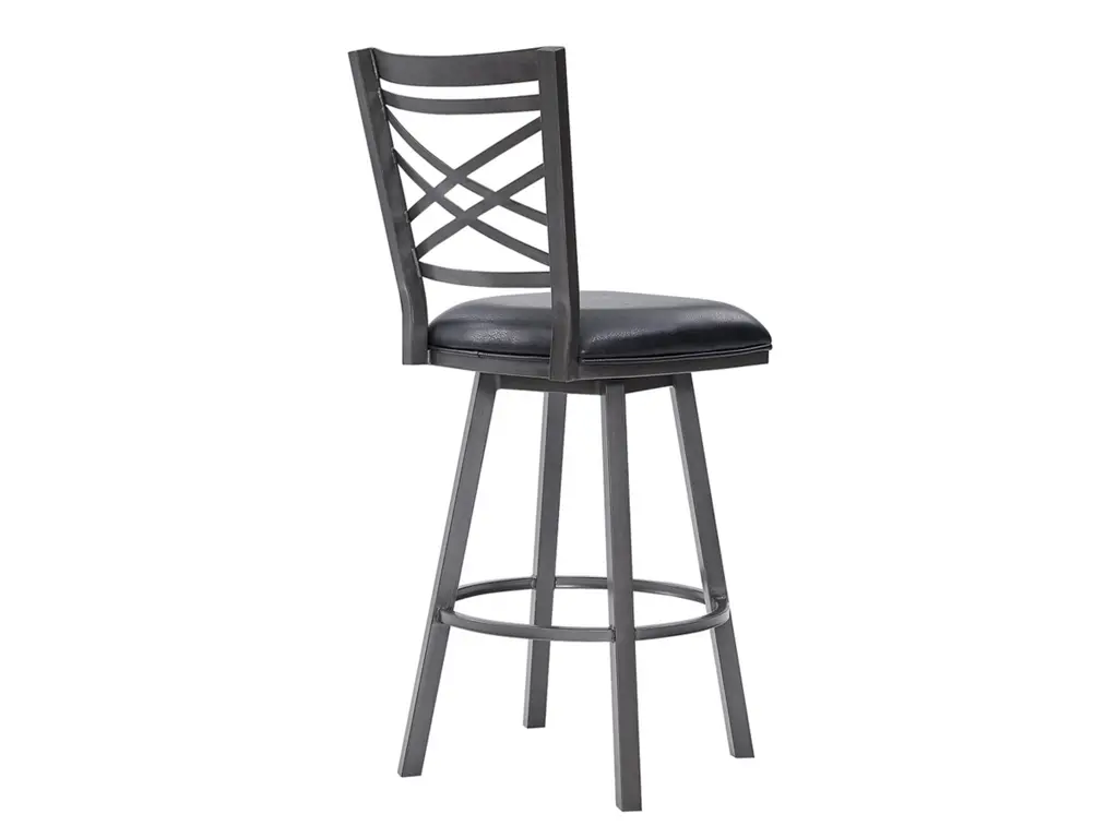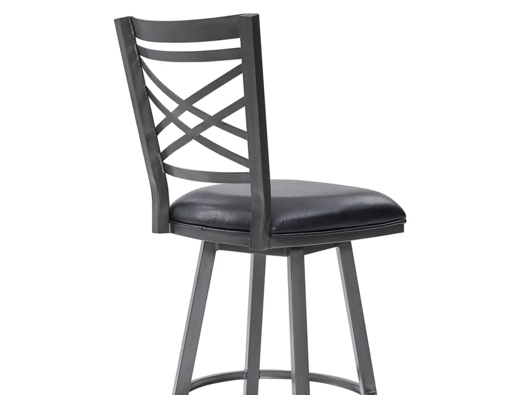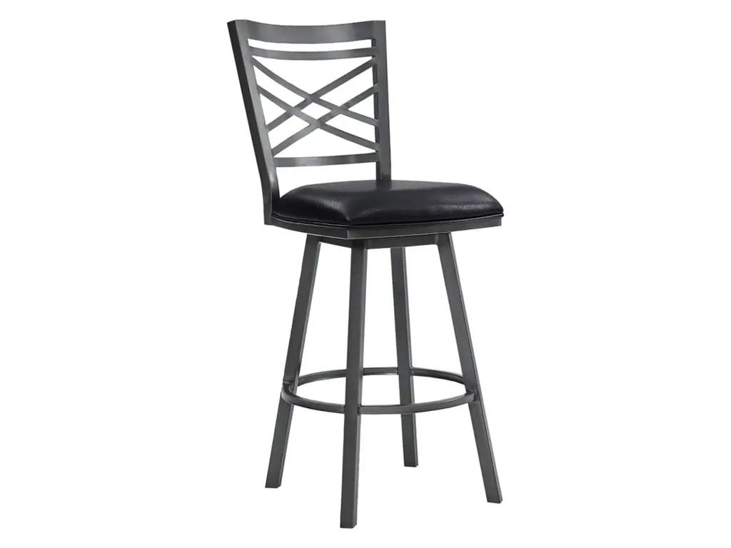 The Fargo transitional-style bar stool fits beautifully into most any room decor. This armless swivel bar stool features a metal frame with mineral finish and a black faux leather seat. Its back has a cross-pattern design and provides full support, while the 360-degree swivel seat allows a wide range of movement for enhanced comfort. The footrest accents the Fargo's straight-leg design and offers added leg support.