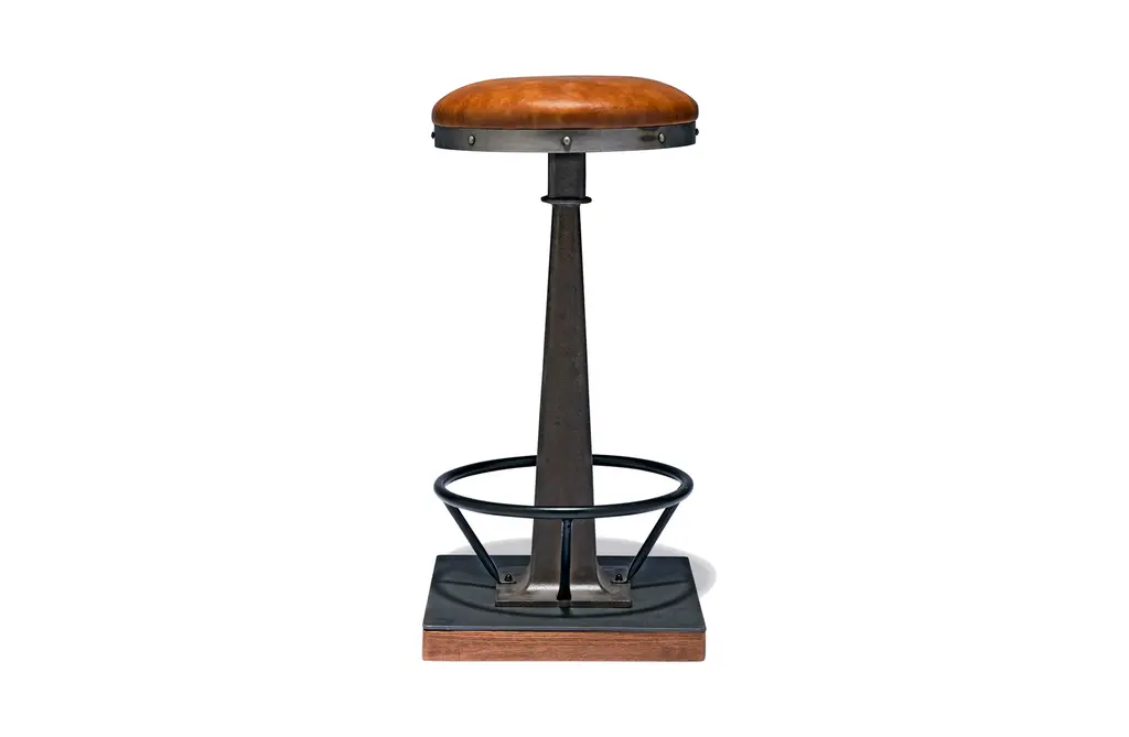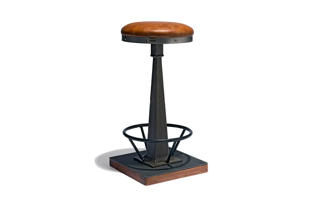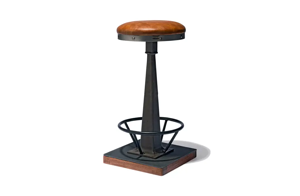 Slide up to the bar and pause to take in the retro styling of our Forge Bar Stool. Epitomizing the juxtaposition of modern luxury and industrial design, the Forge Bar Stool is a weighty addition to a commercial space. With dimensional elements that ground a warm leather seat, the Forge Bar Stool offers masculinity and intrigue to any space. The bar stool features a rotating swiveling seat that can be locked into place quickly and simply with a twist allen wrench. The heavy metal base of the Forge Bar Stool keeps it from tipping and features a footrest, and the Forge Bar Stool comes with a soft brown leather, white, or indigo seat that keeps patrons comfortable during dinner or cocktails.