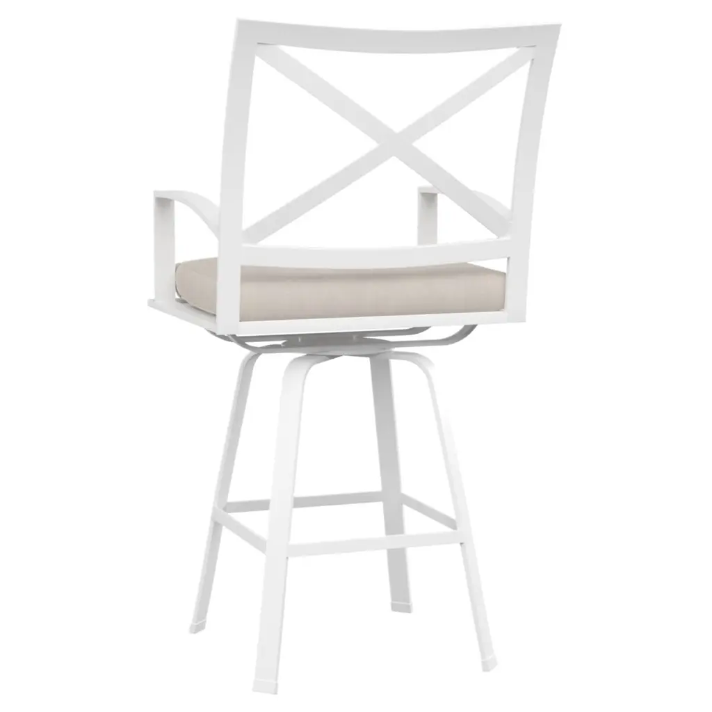 The transitional Galtier Swivel Barstool is crafted from high-quality, low-maintenance aluminum designed to endure over time. This stool features a gently curved X back and a seat scaled for comfort, complete with a swivel base and subtly curved arms. It pairs beautifully with the Galtier Pub Table. The stool boasts a fully welded, scratch-resistant powder-coated aluminum frame, weather-resistant high-resiliency foam cushions, and is constructed with commercial quality.