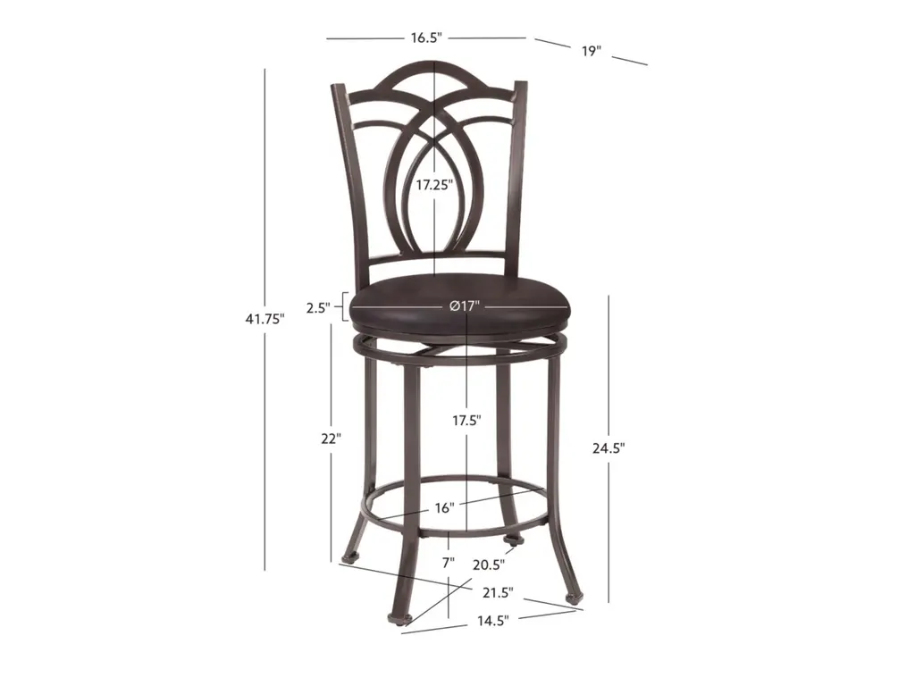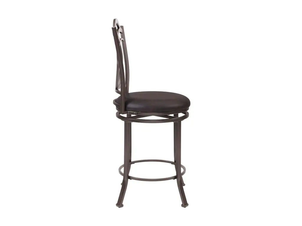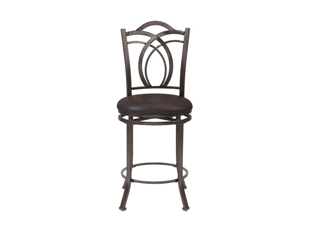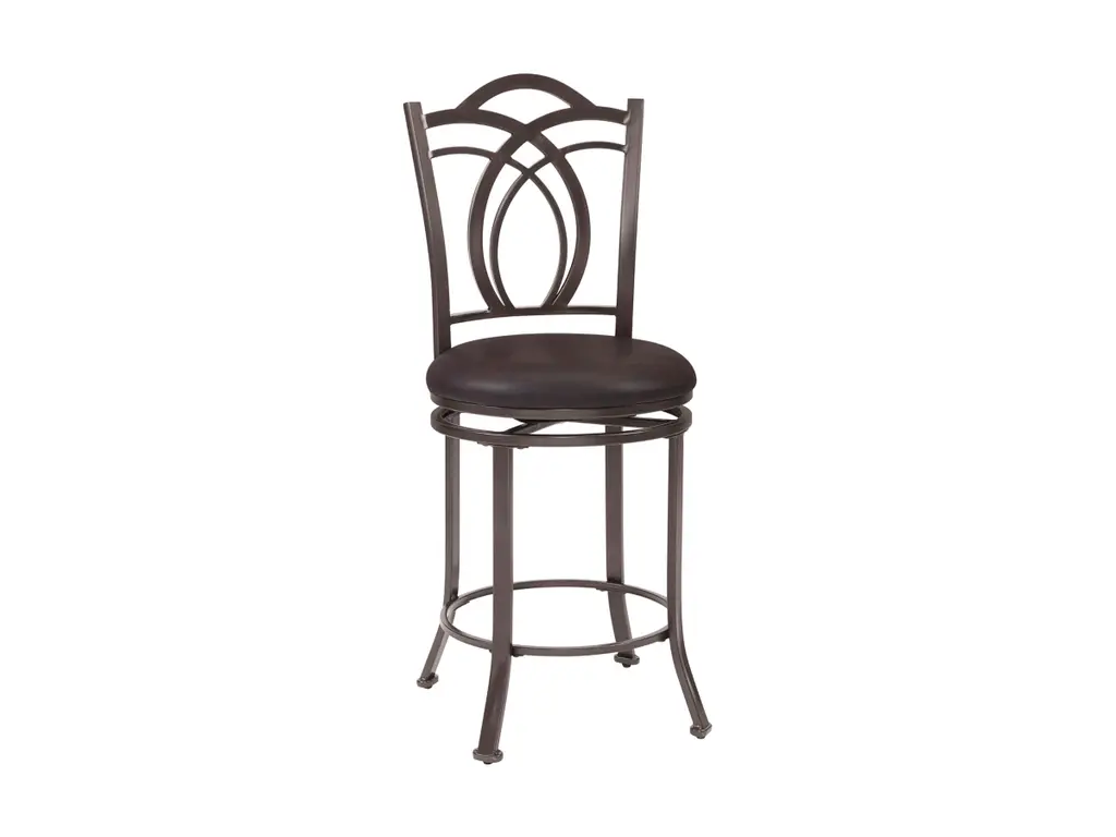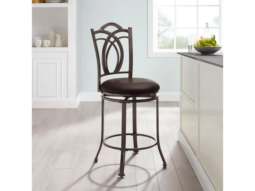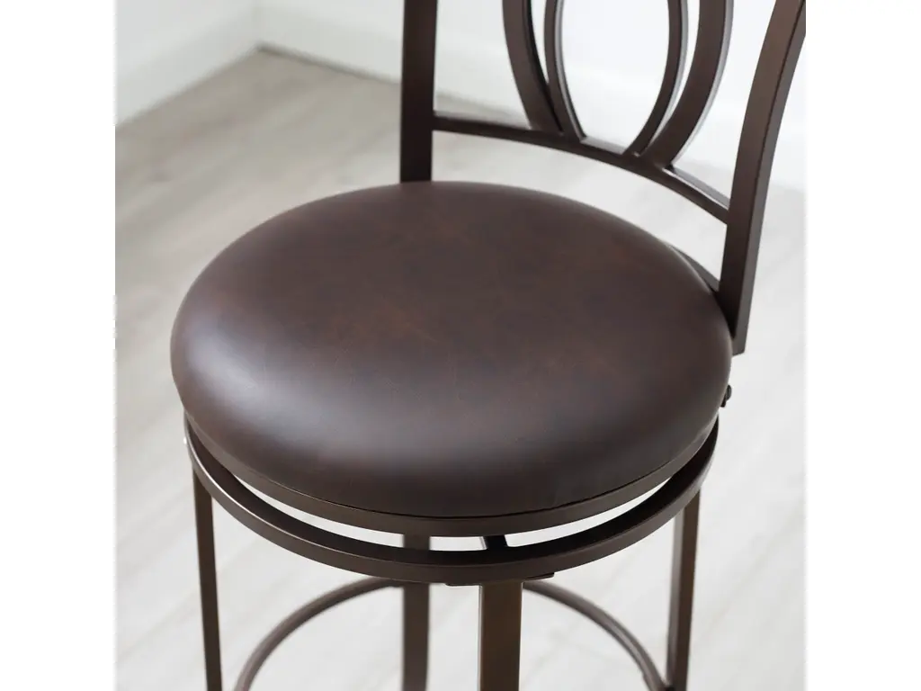 The Calif metal stool blends transitional styling with traditional charm. Crafted for fashion and comfort, the stool has a decorative back, flared legs and swivel seat. Finished in a deep coffee brown, the seat is plushily upholstered in easy to maintain coffee brown PU. Made of metal, this piece is sturdy and durable for long lasting use. 24" seat height. 275 pound weight limit.