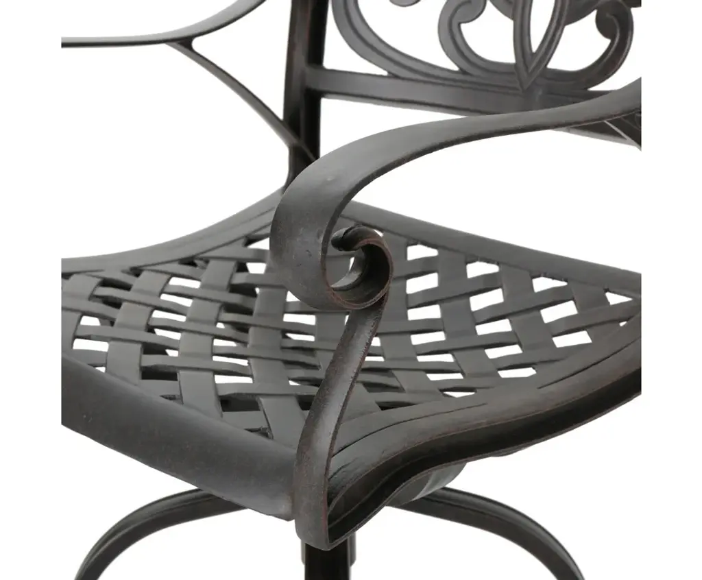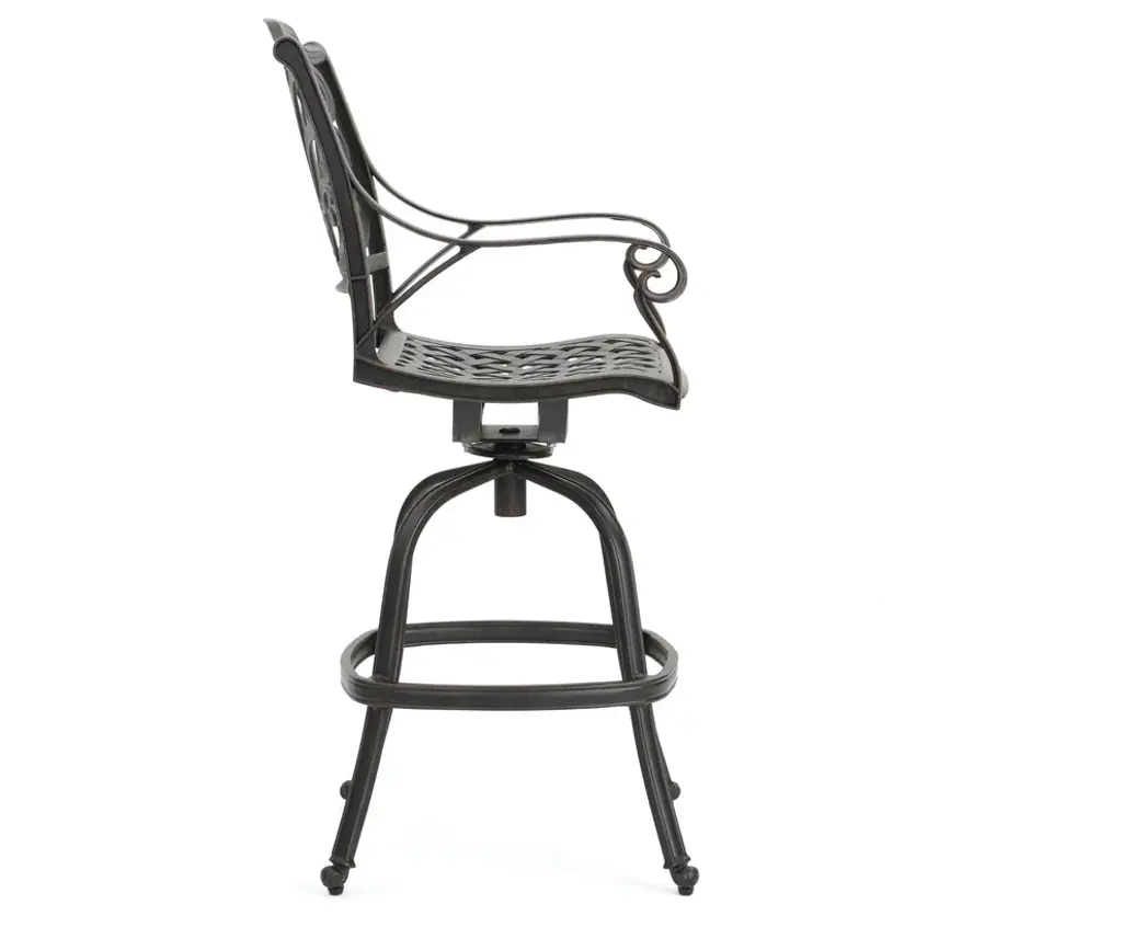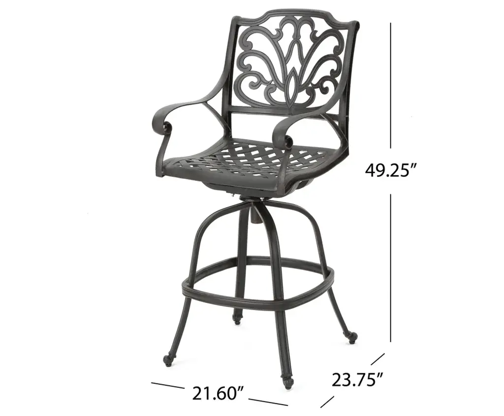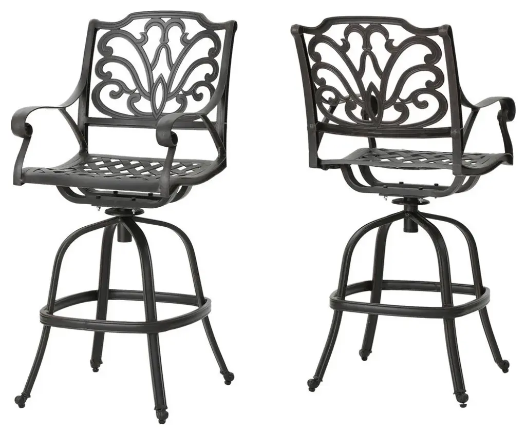 These cast aluminum barstools are a wonderful addition to any patio. Featuring a full swivel base, these barstools are both versatile as well as comfortable. Use them as extra seating when having large gatherings or get a set of them and use them for intimate family dinners on warm summer nights.Product DetailsPackage Option Includes: Two (2) or Four (4) BarstoolsMaterial: Cast AluminumFinish: BronzeLight Assembly RequiredDimensions: 26.50"D x 22.25"W x 48.75"HSeat Width: 18.50"Seat Depth: 18.00"Seat Height: 29.50"Front Foot rail Height (upper edge): 12.00"Side Foot rail Height (upper edge): 12.00"